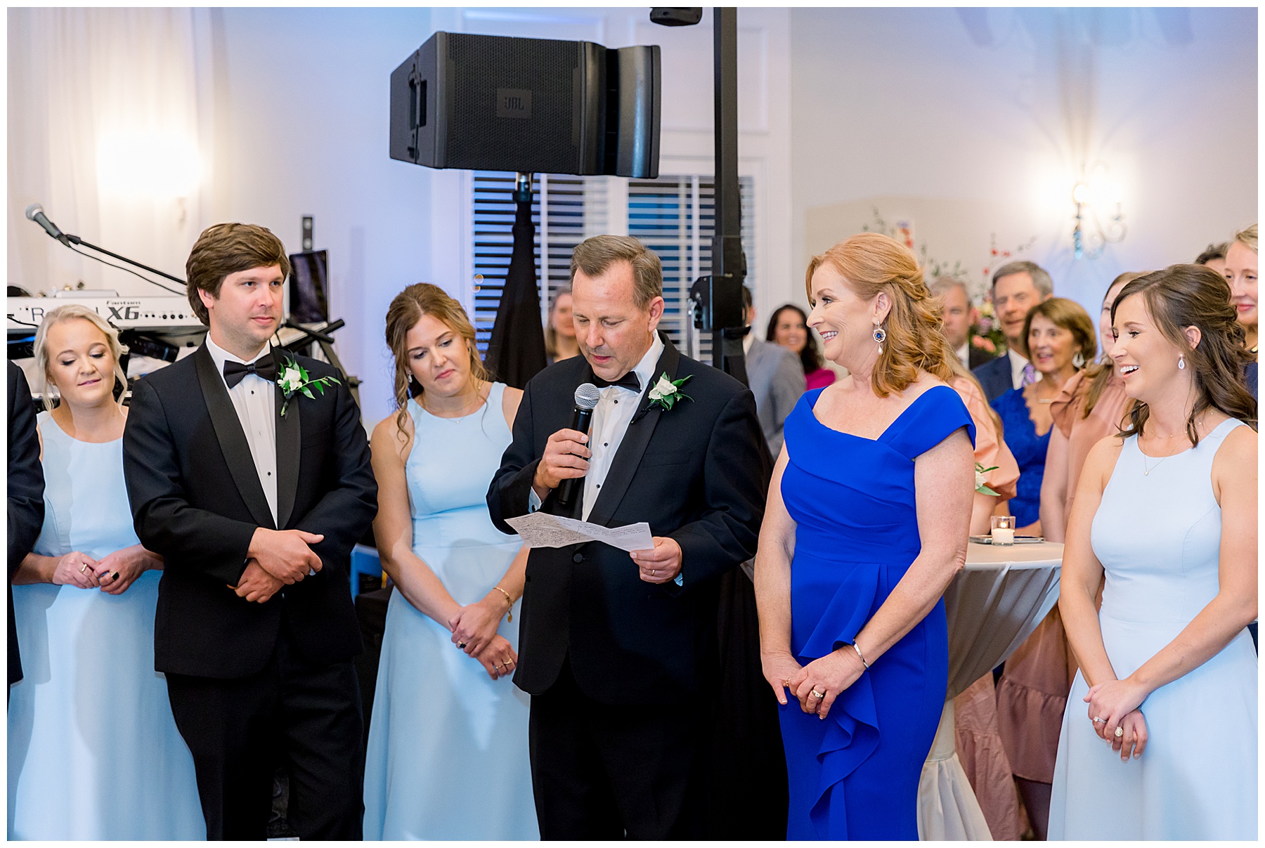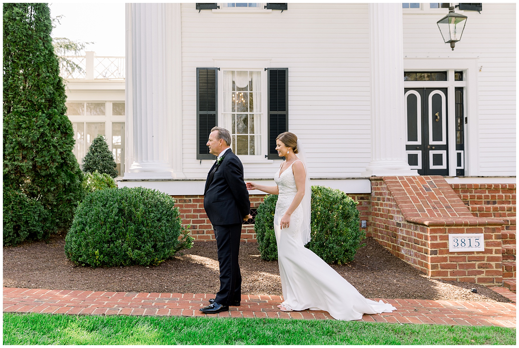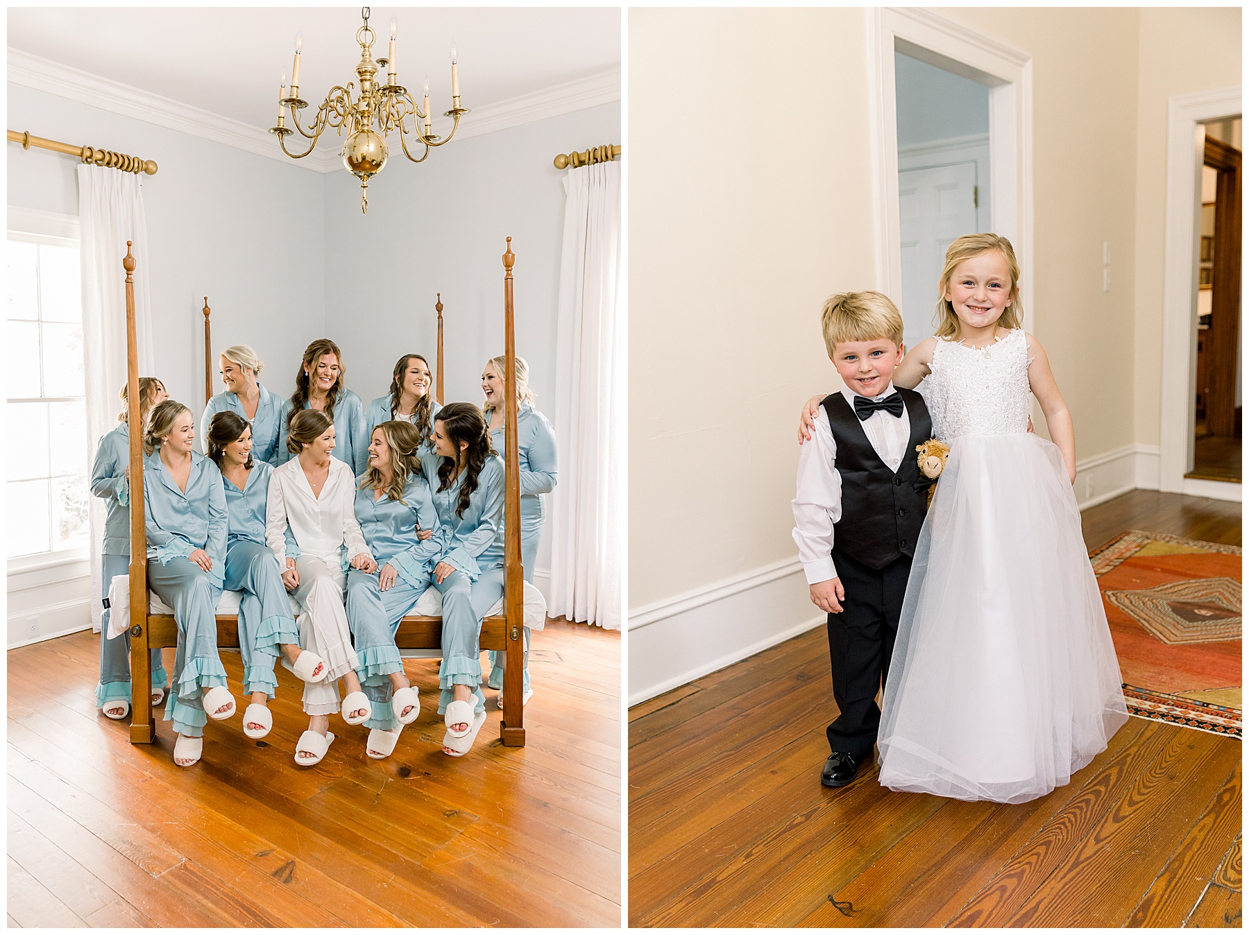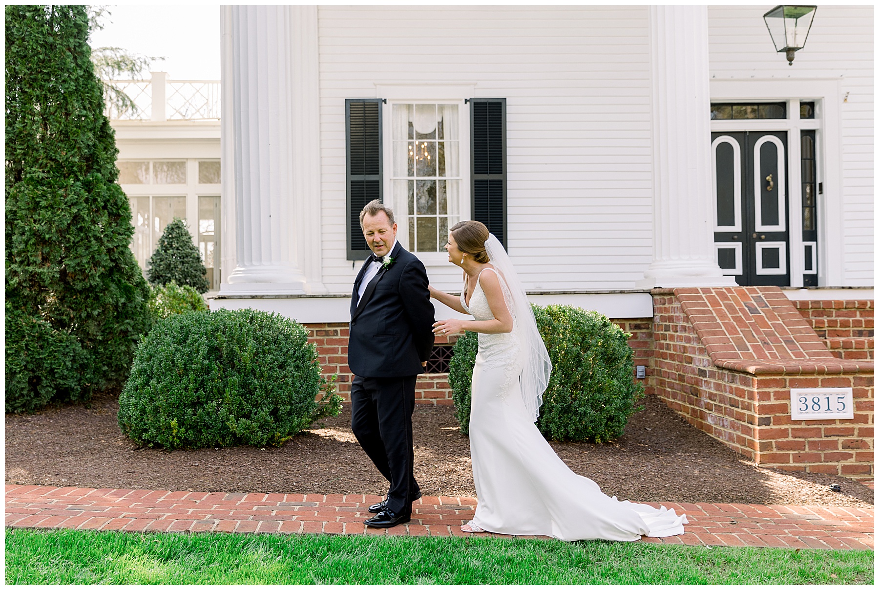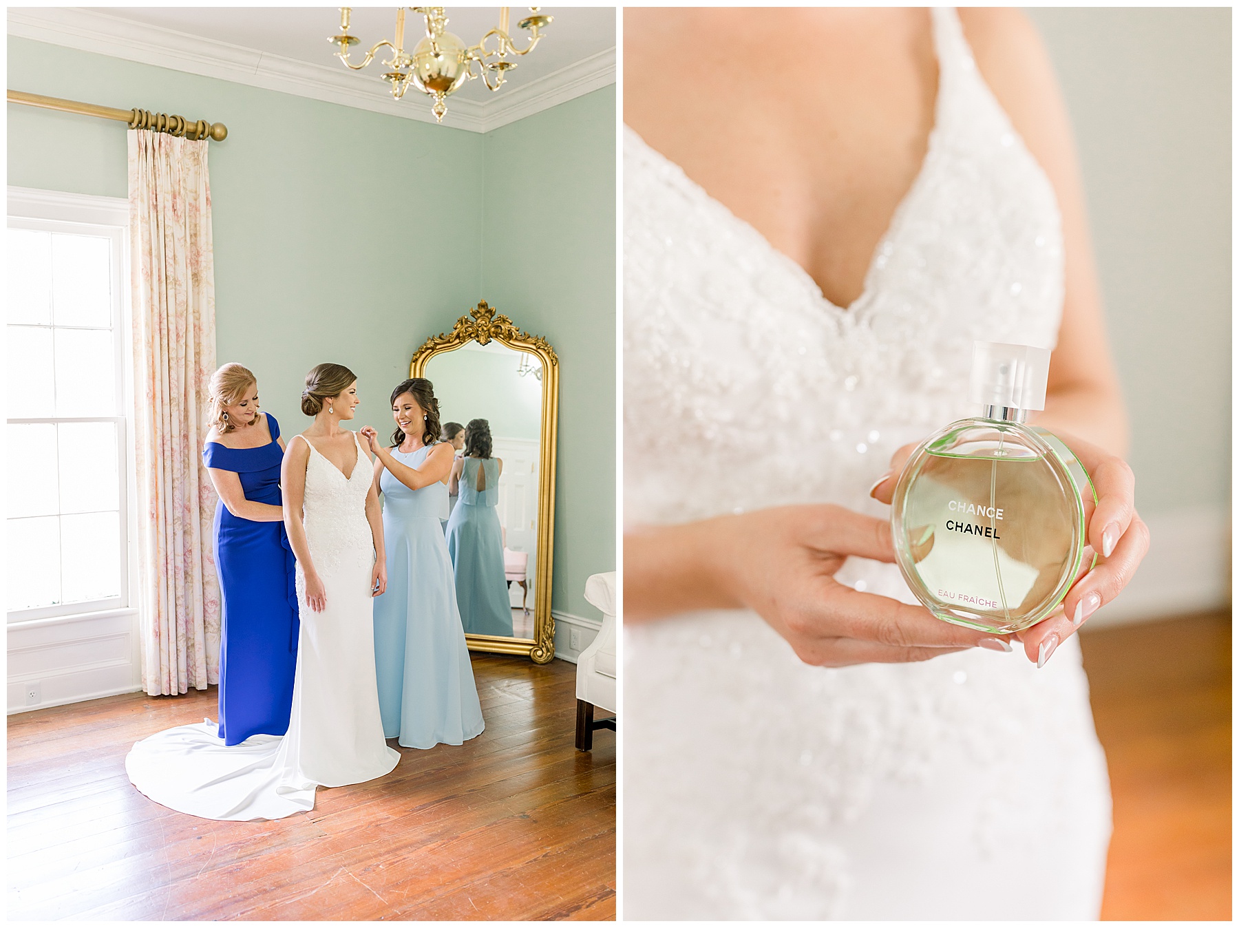 I loved getting to know Molly’s sweet bridesmaids. Cutchin’s 3 sisters were bridesmaids, and the relationship Molly has with them is really amazing! They were all so precious. One of my favorite parts of getting ready was when Molly got into her dress. Her sister Katherine started tearing up watching her little sister get ready, and having 2 younger sisters myself it hit home and I totally felt her emotions!!!! It was soooooo sweet!!! Molly had the cutest First Look with all her girls, and then one with her dad! It was a windy day outside, so we were grateful to have the front porch for all the portraits to block the wind for us! The blue bridesmaids dresses with all the white columns looked absolutely beautiful!