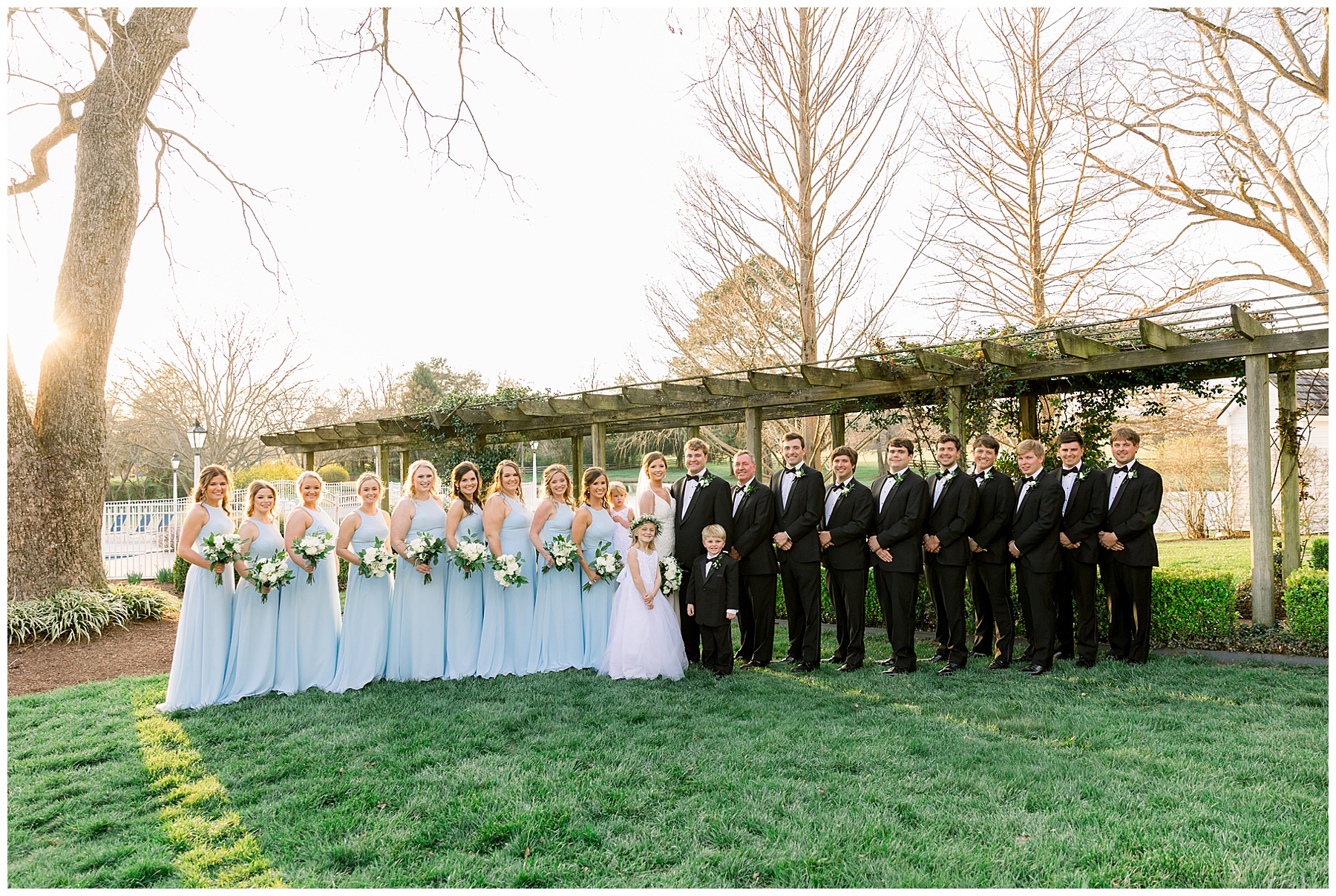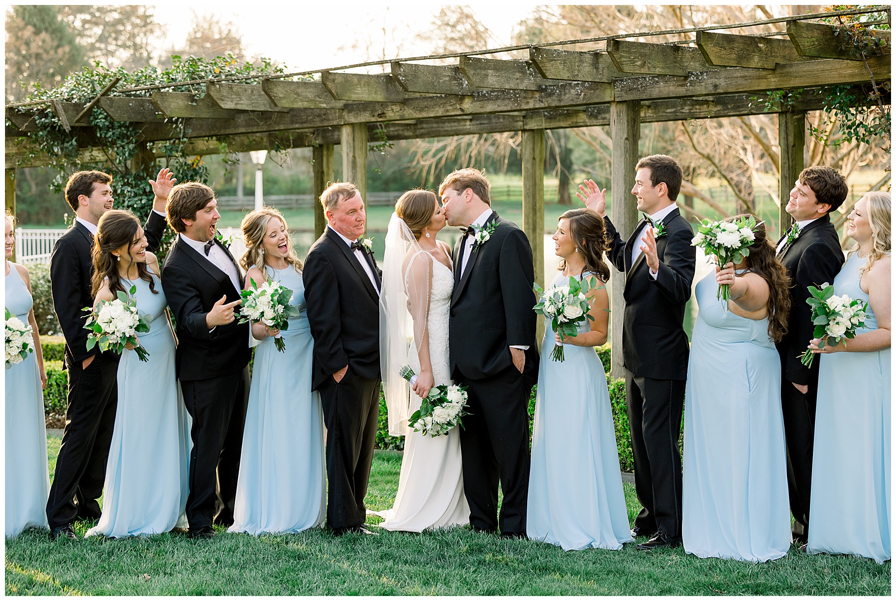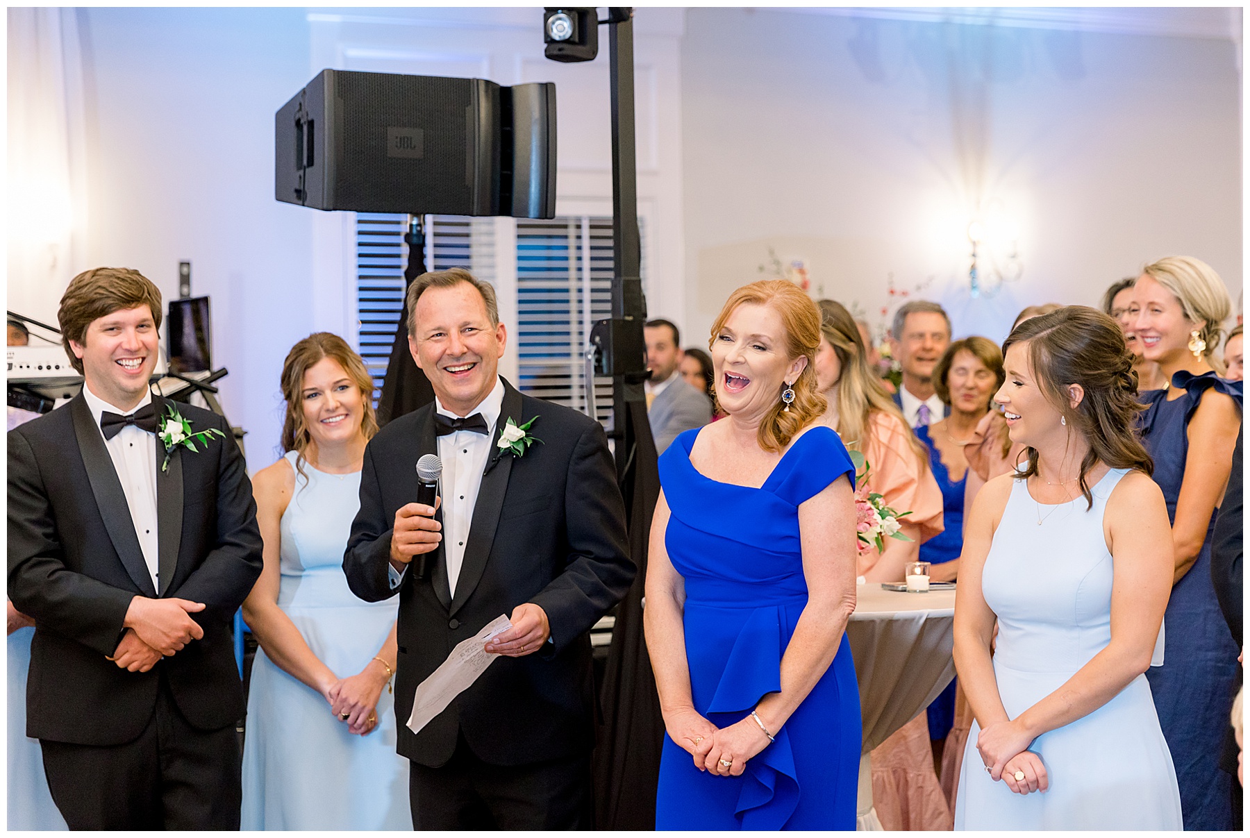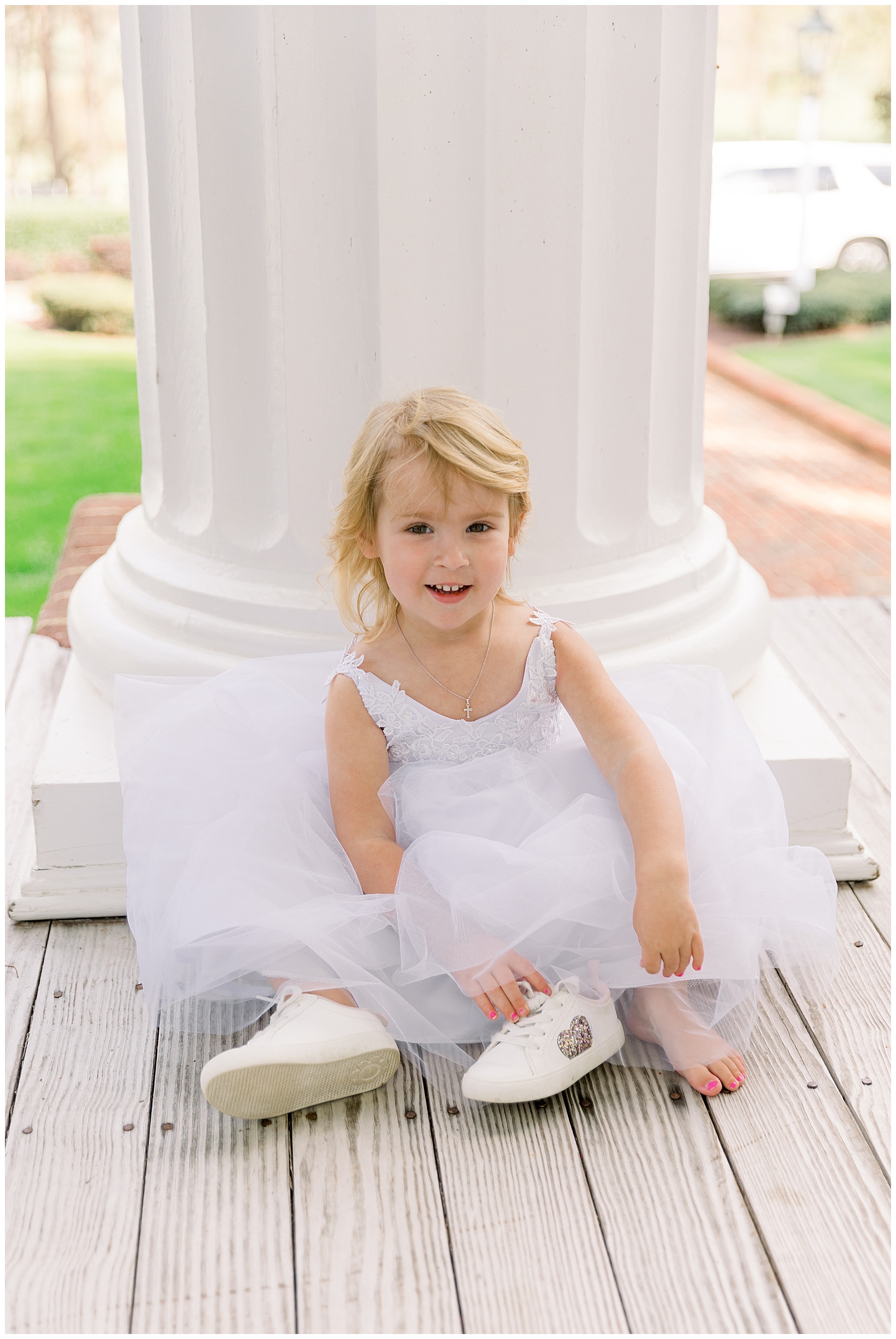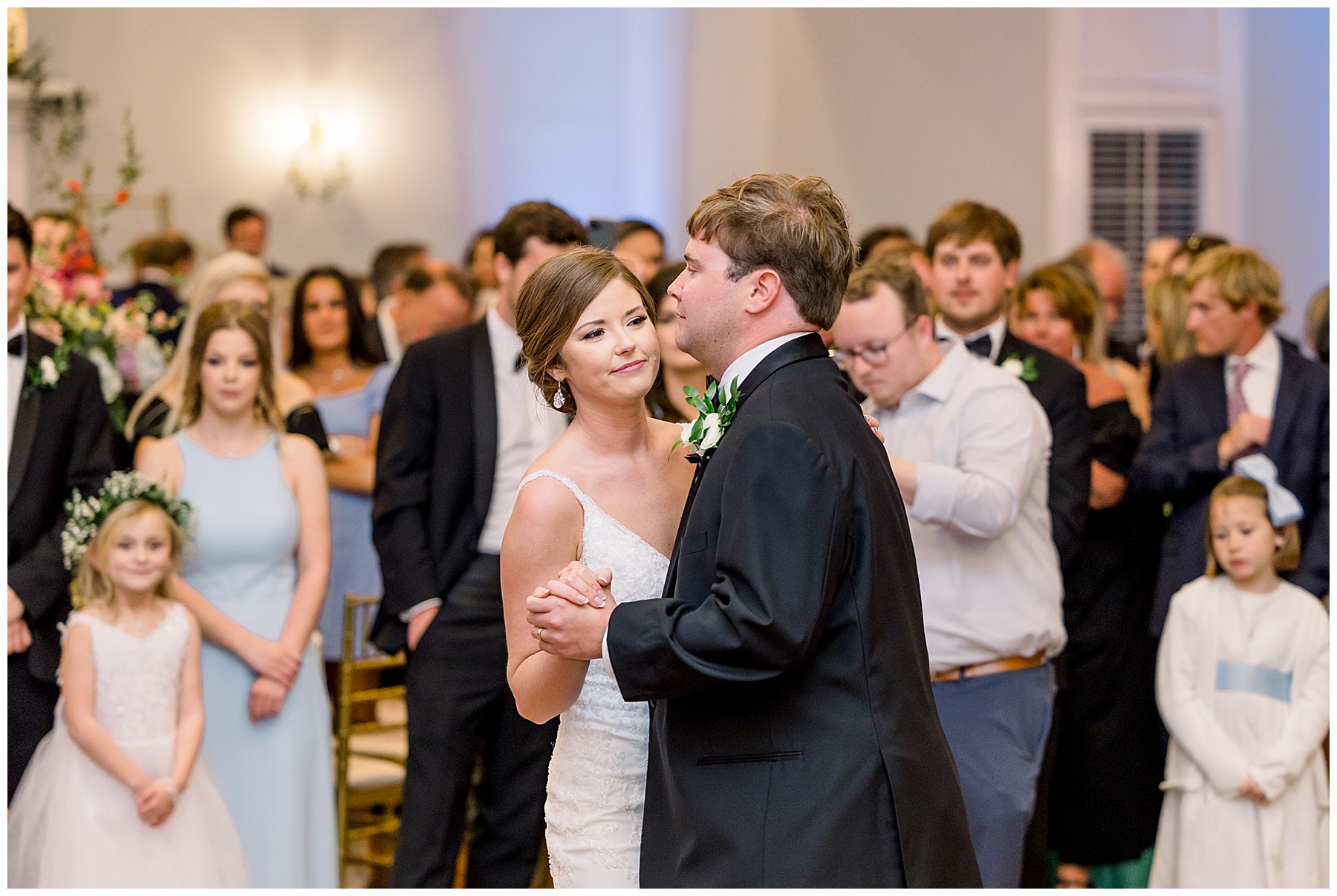 I loved getting to know Molly’s sweet bridesmaids. Cutchin’s 3 sisters were bridesmaids, and the relationship Molly has with them is really amazing! They were all so precious. One of my favorite parts of getting ready was when Molly got into her dress. Her sister Katherine started tearing up watching her little sister get ready, and having 2 younger sisters myself it hit home and I totally felt her emotions!!!! It was soooooo sweet!!! Molly had the cutest First Look with all her girls, and then one with her dad! It was a windy day outside, so we were grateful to have the front porch for all the portraits to block the wind for us! The blue bridesmaids dresses with all the white columns looked absolutely beautiful!
