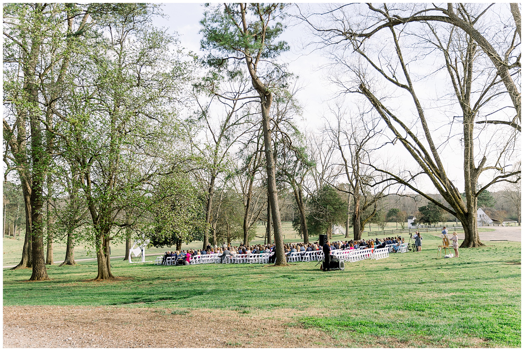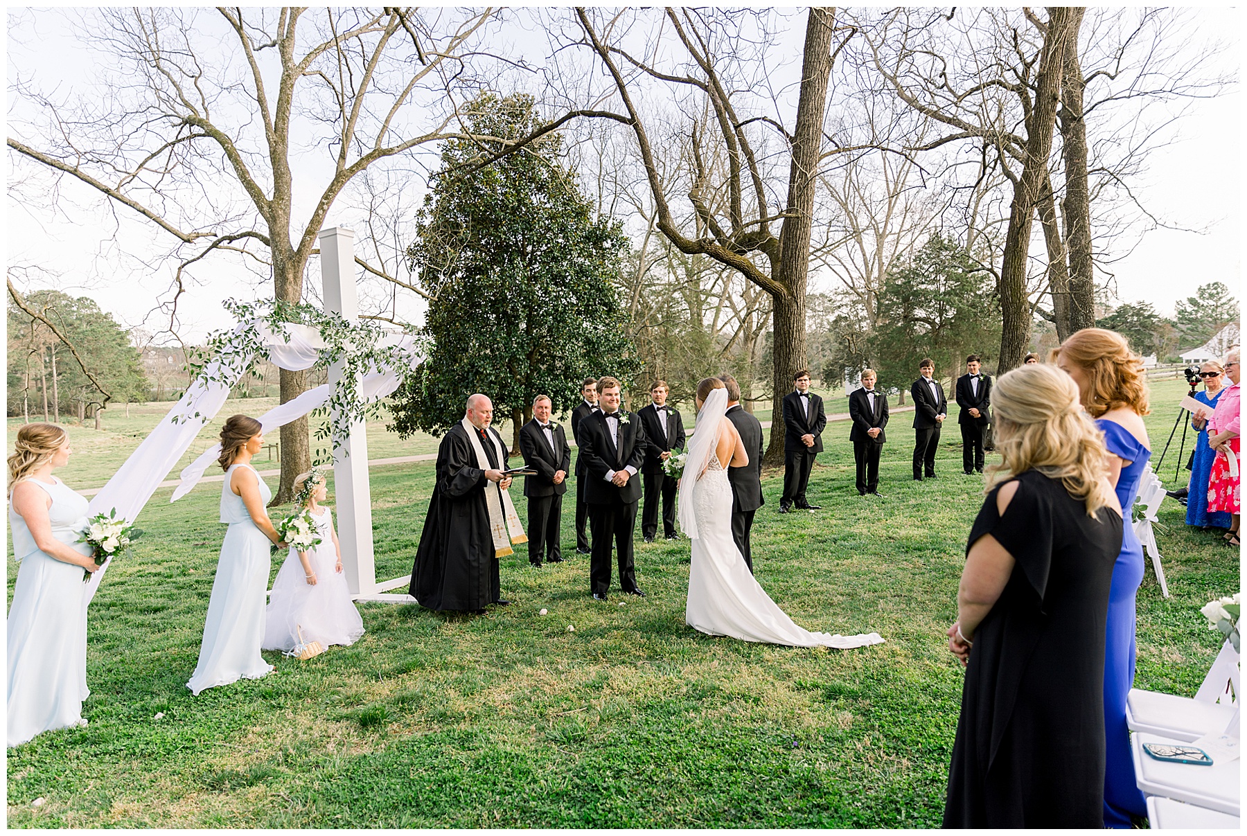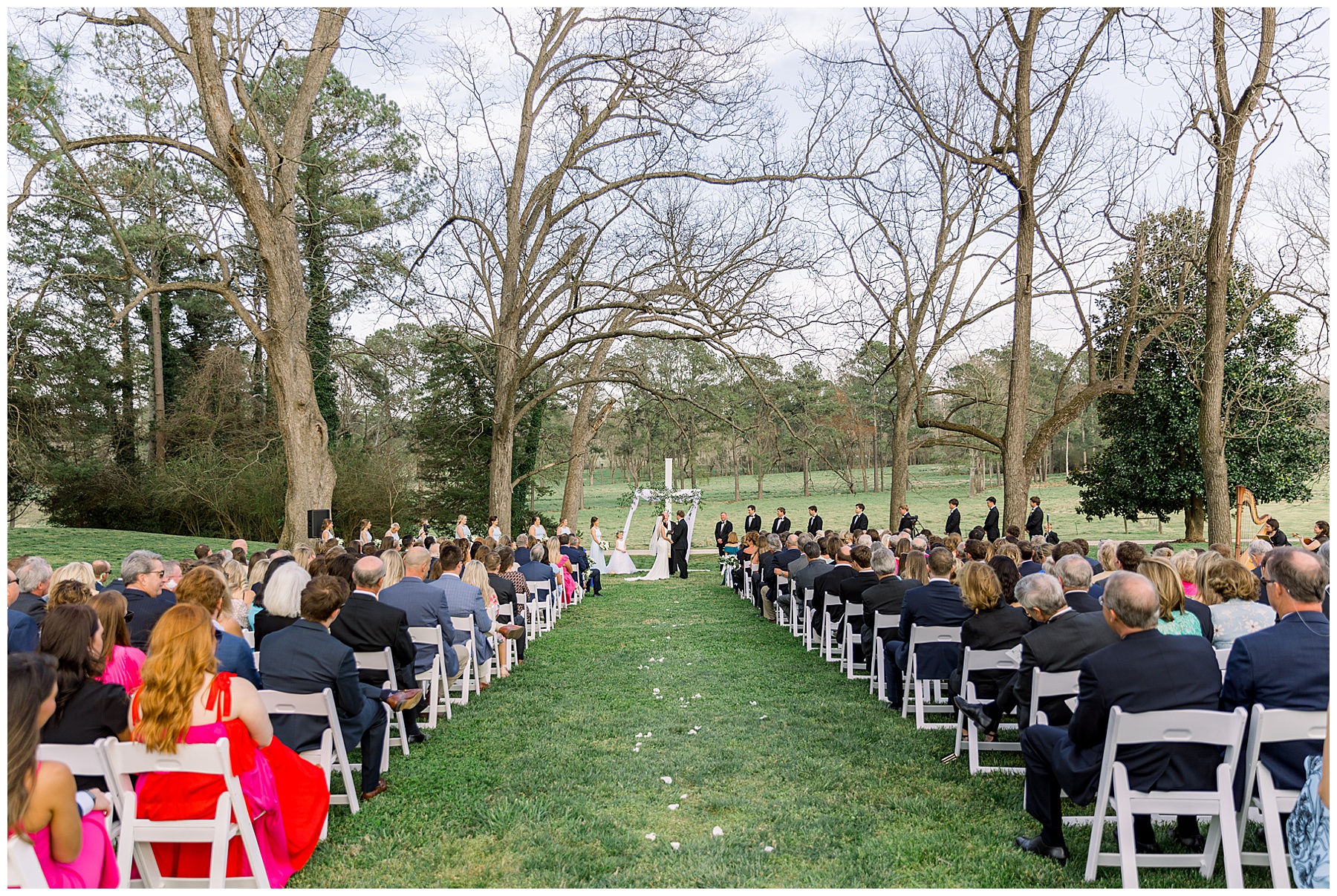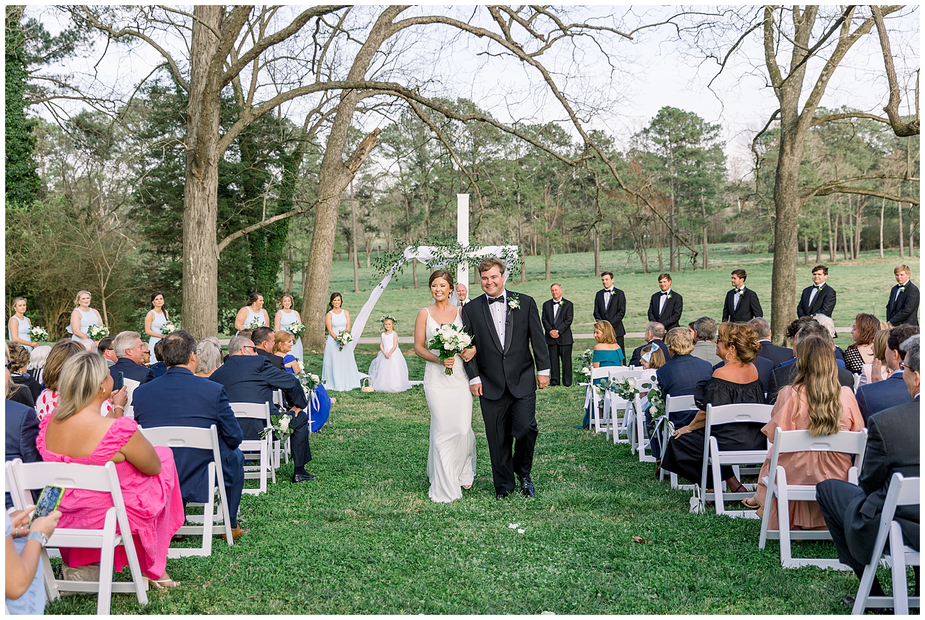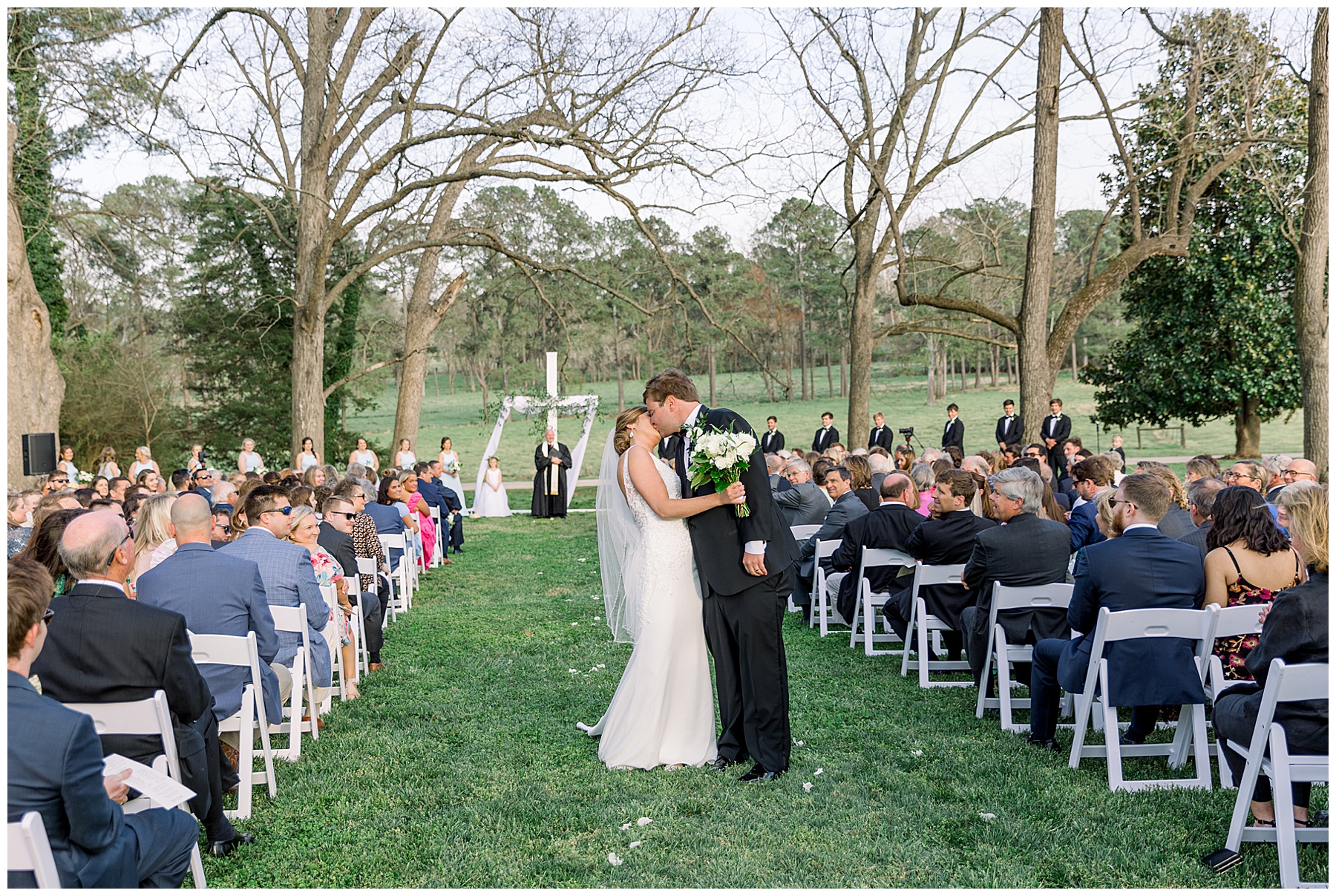 The ceremony was our FIRST one in the Pecan Grove! Cutchin and Molly had a live artist painting the ceremony, and a harpist & violinist playing music as guests got seated. There was a huge white cross as a focal point for the ceremony, and it looked beautiful against all the green! The ceremony was beautiful, and just enough sun to keep everyone warm in the wind!