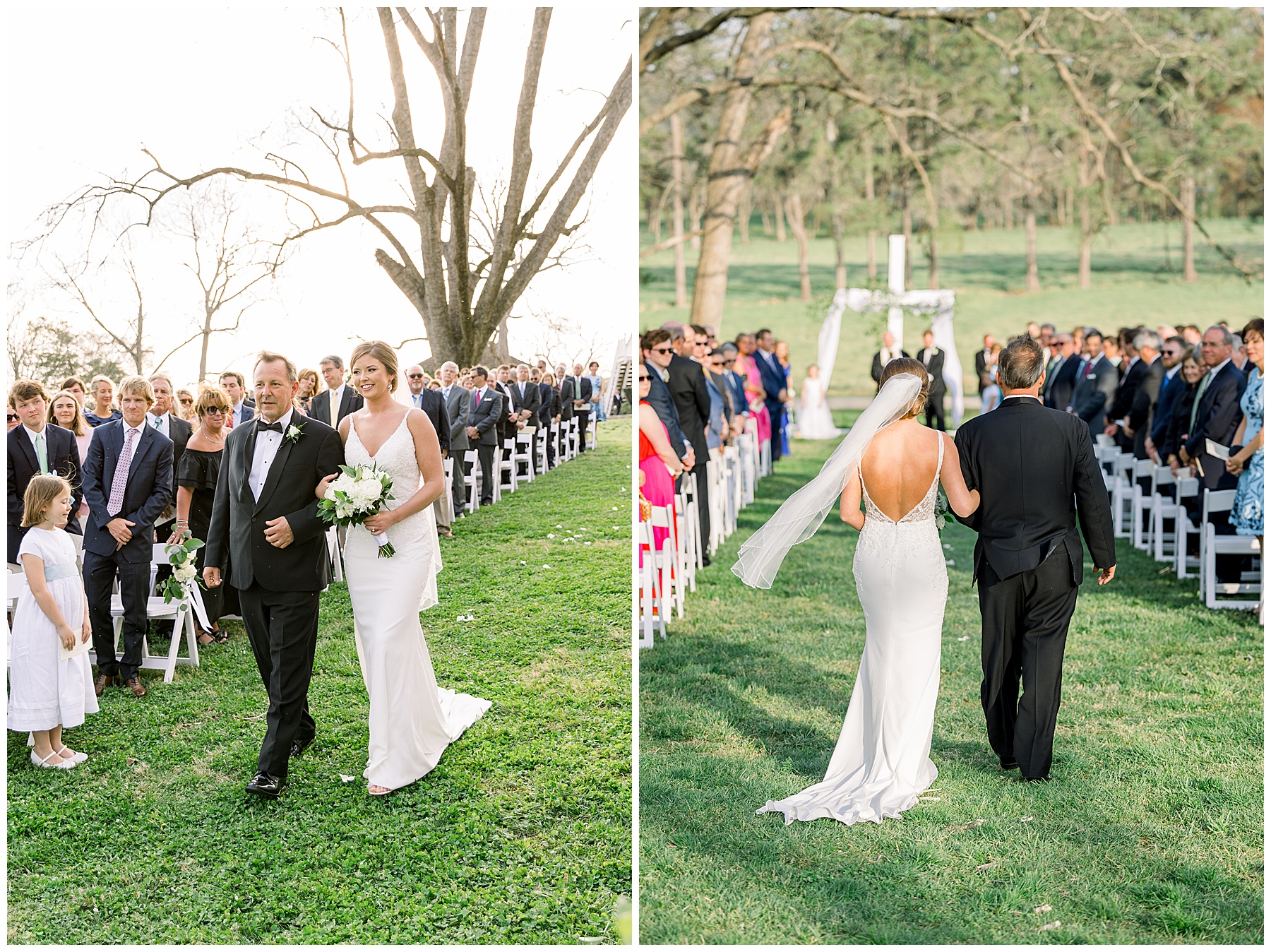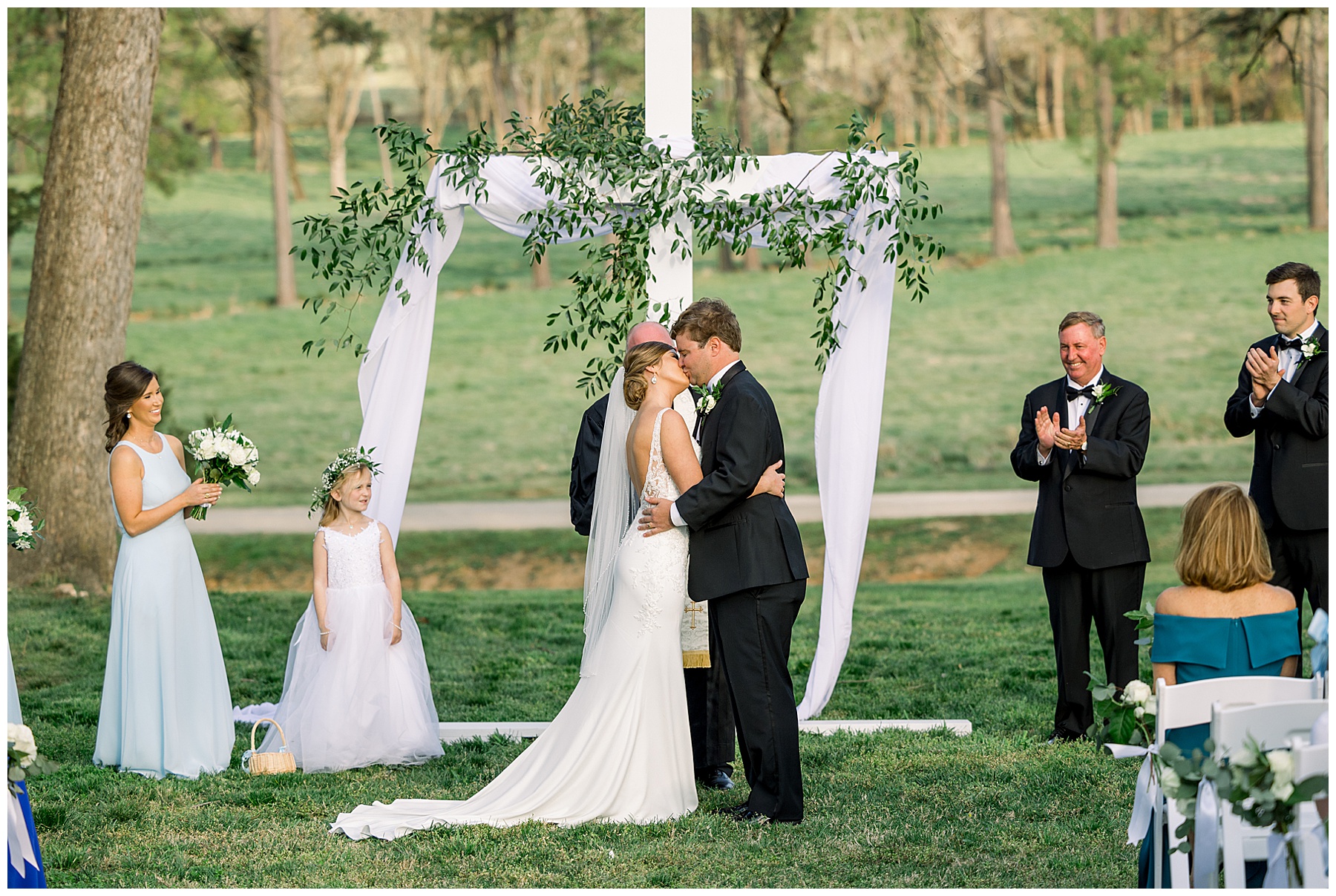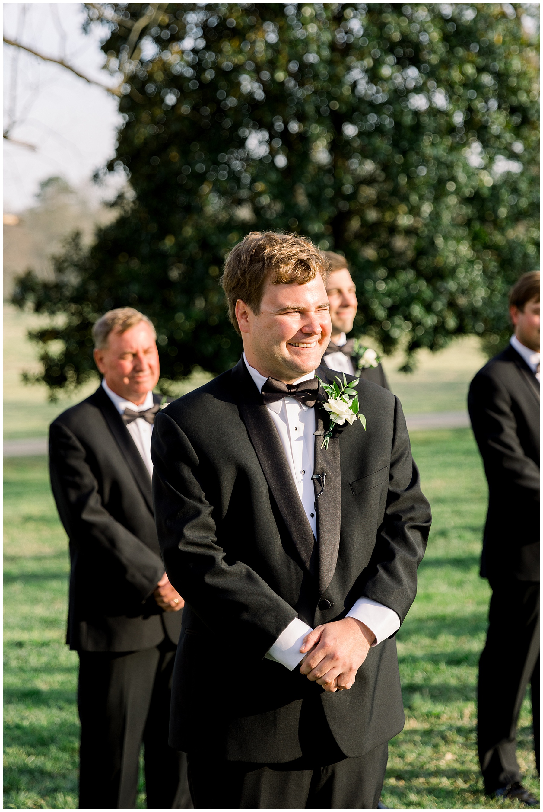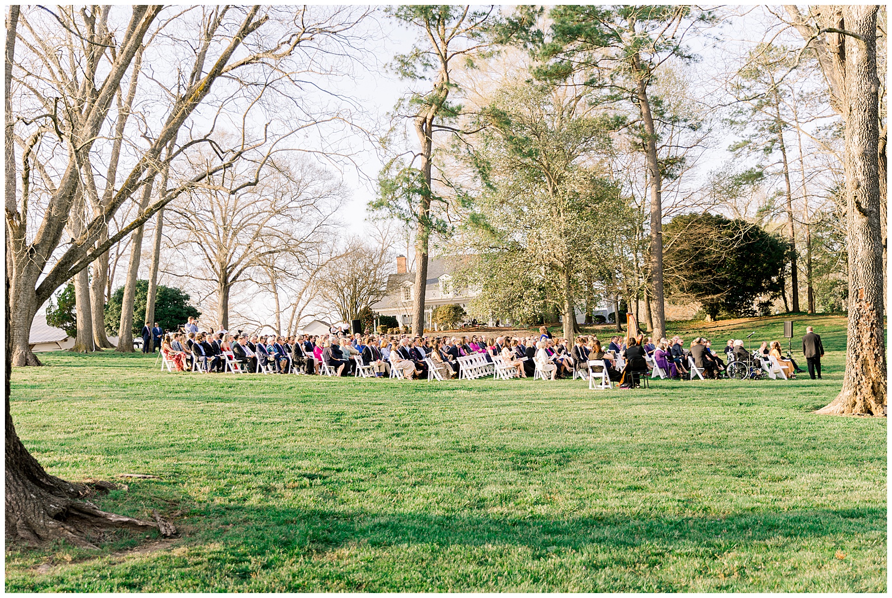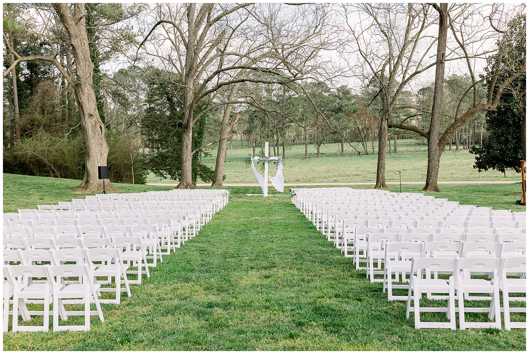 The ceremony was our FIRST one in the Pecan Grove! Cutchin and Molly had a live artist painting the ceremony, and a harpist & violinist playing music as guests got seated. There was a huge white cross as a focal point for the ceremony, and it looked beautiful against all the green! The ceremony was beautiful, and just enough sun to keep everyone warm in the wind!