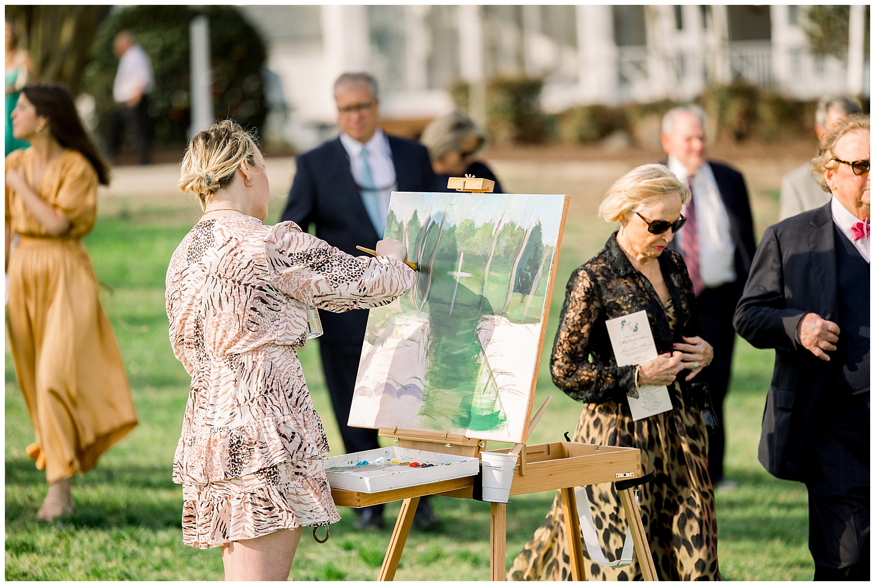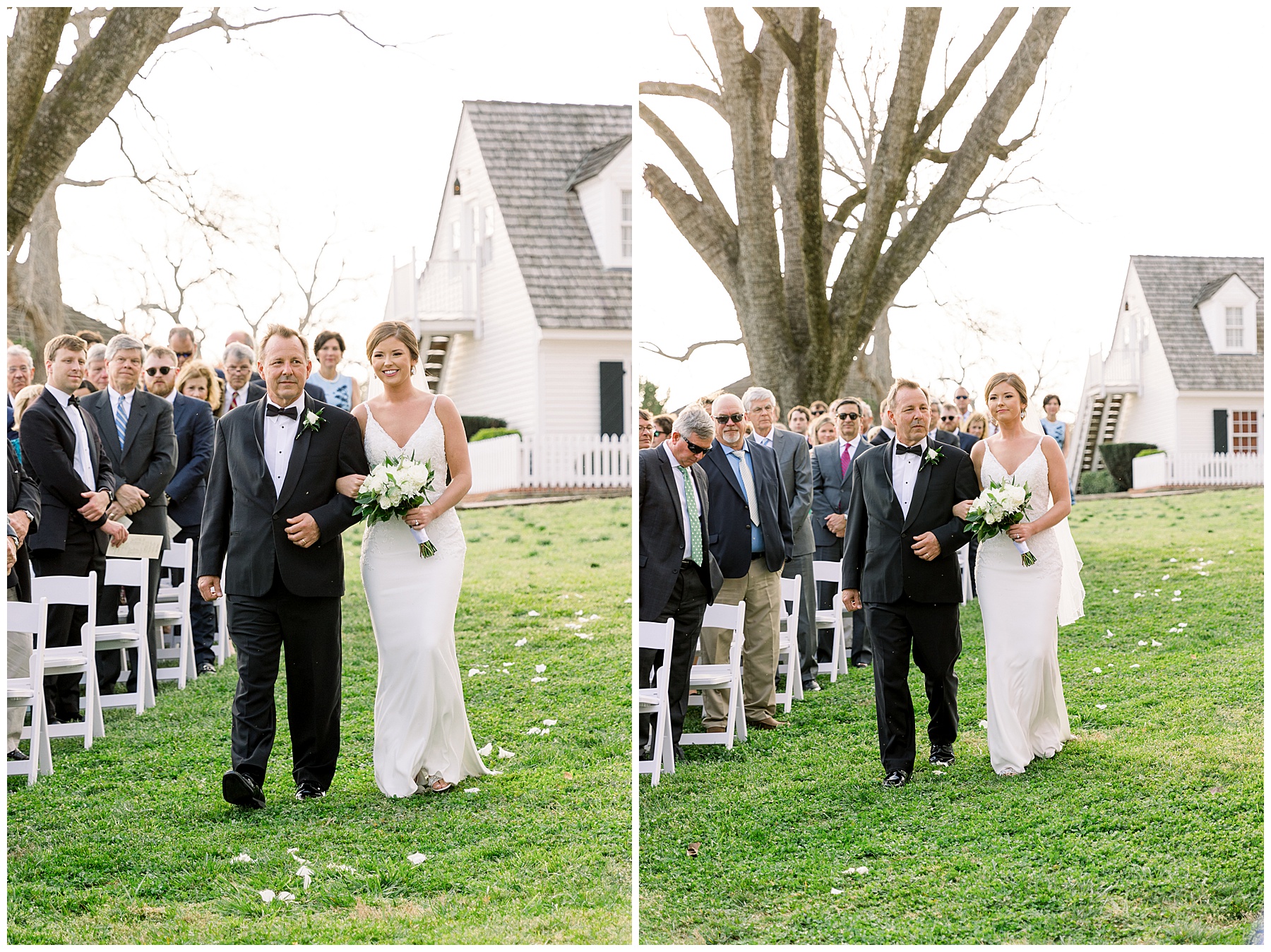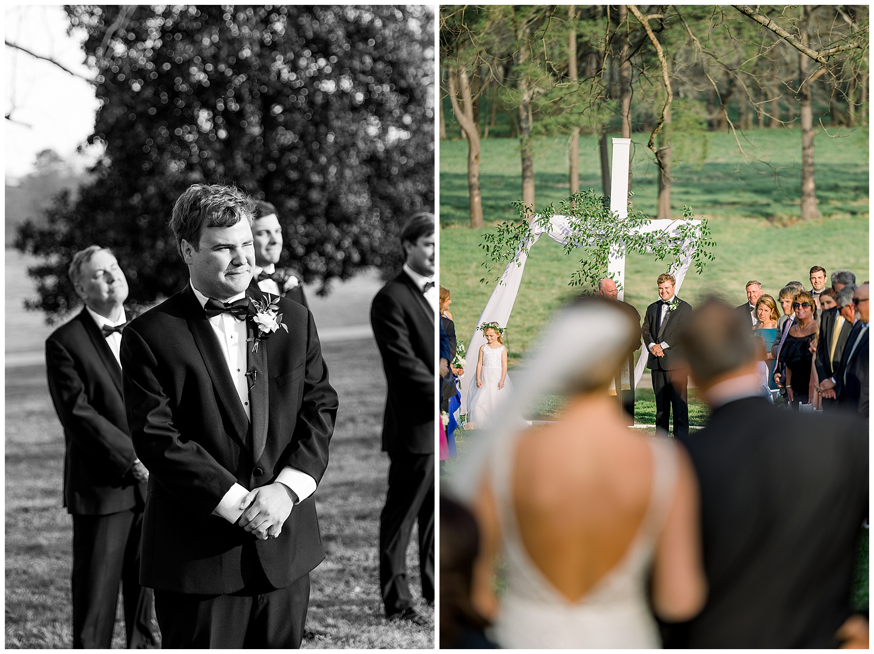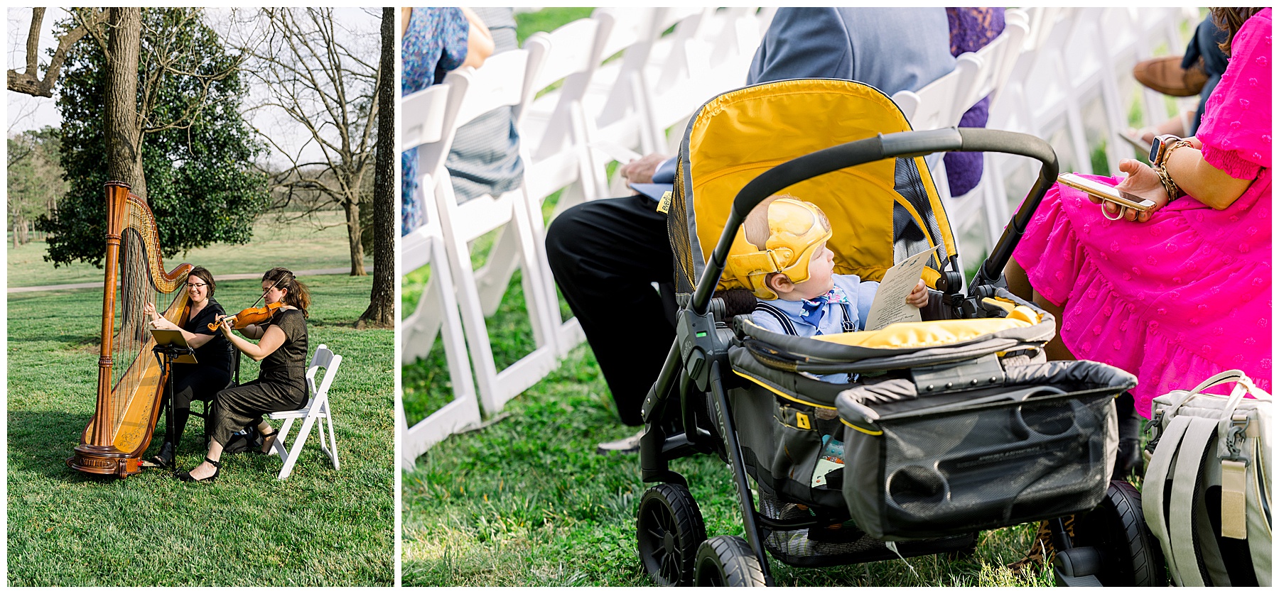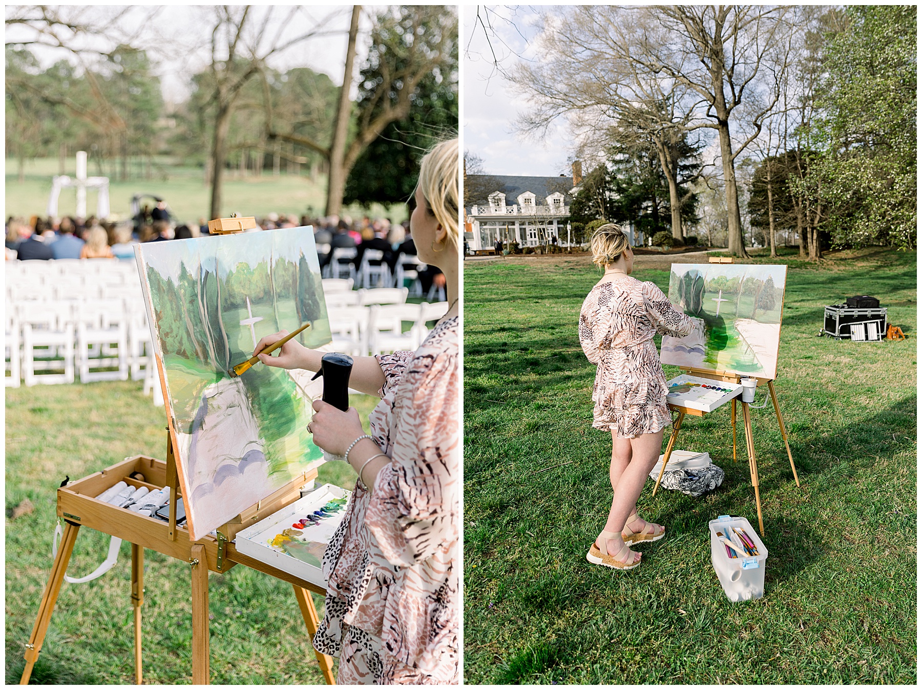 The ceremony was our FIRST one in the Pecan Grove! Cutchin and Molly had a live artist painting the ceremony, and a harpist & violinist playing music as guests got seated. There was a huge white cross as a focal point for the ceremony, and it looked beautiful against all the green! The ceremony was beautiful, and just enough sun to keep everyone warm in the wind!