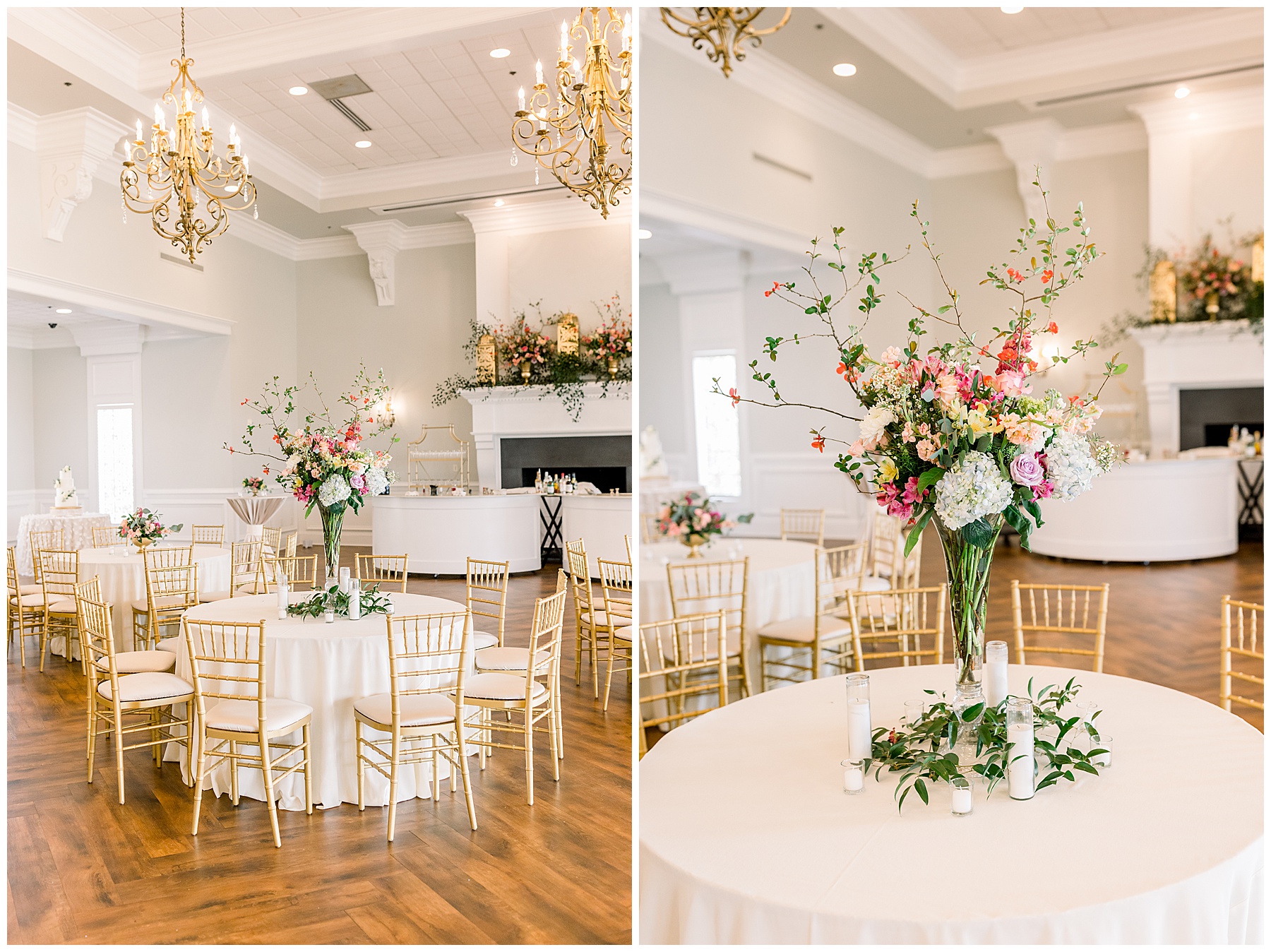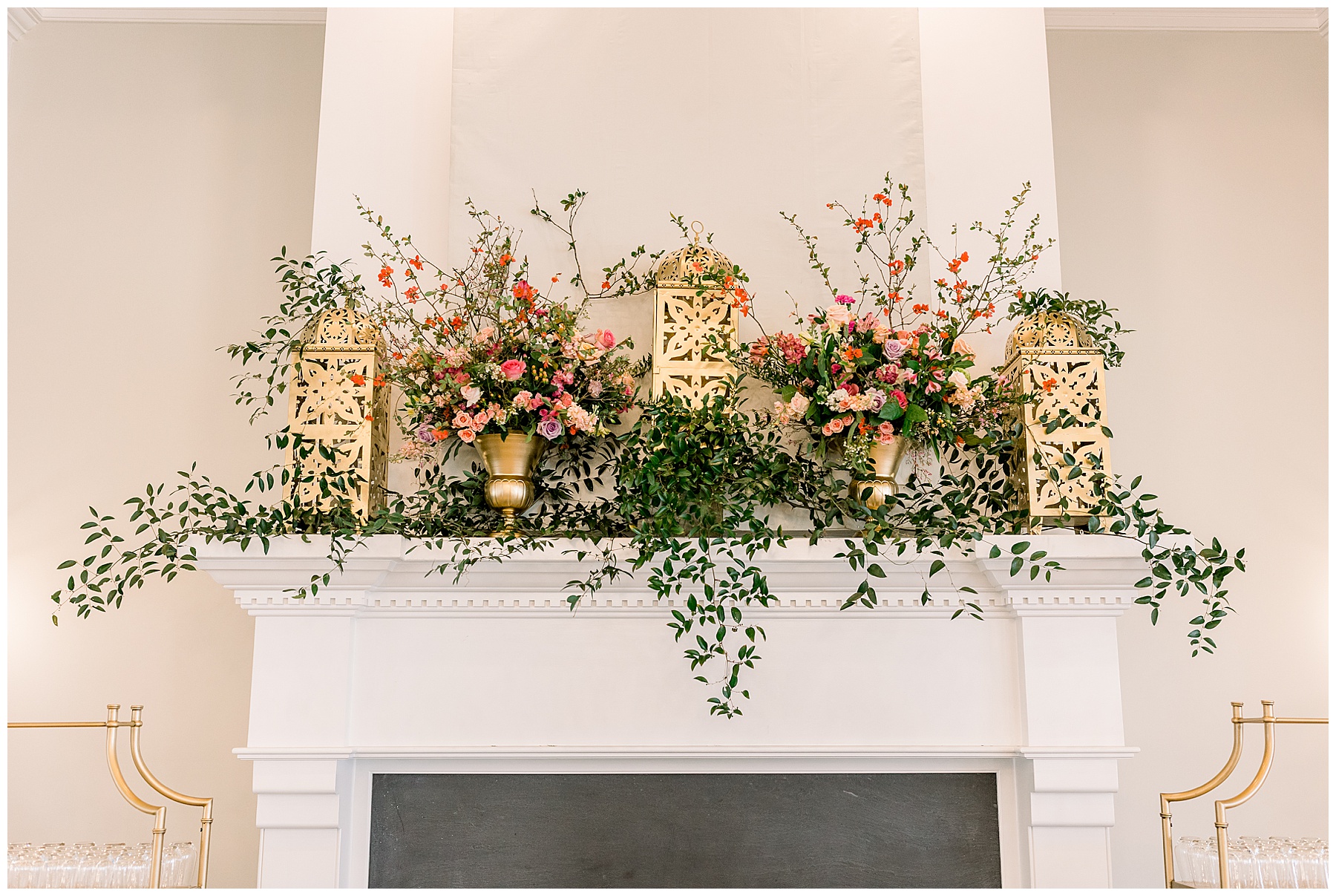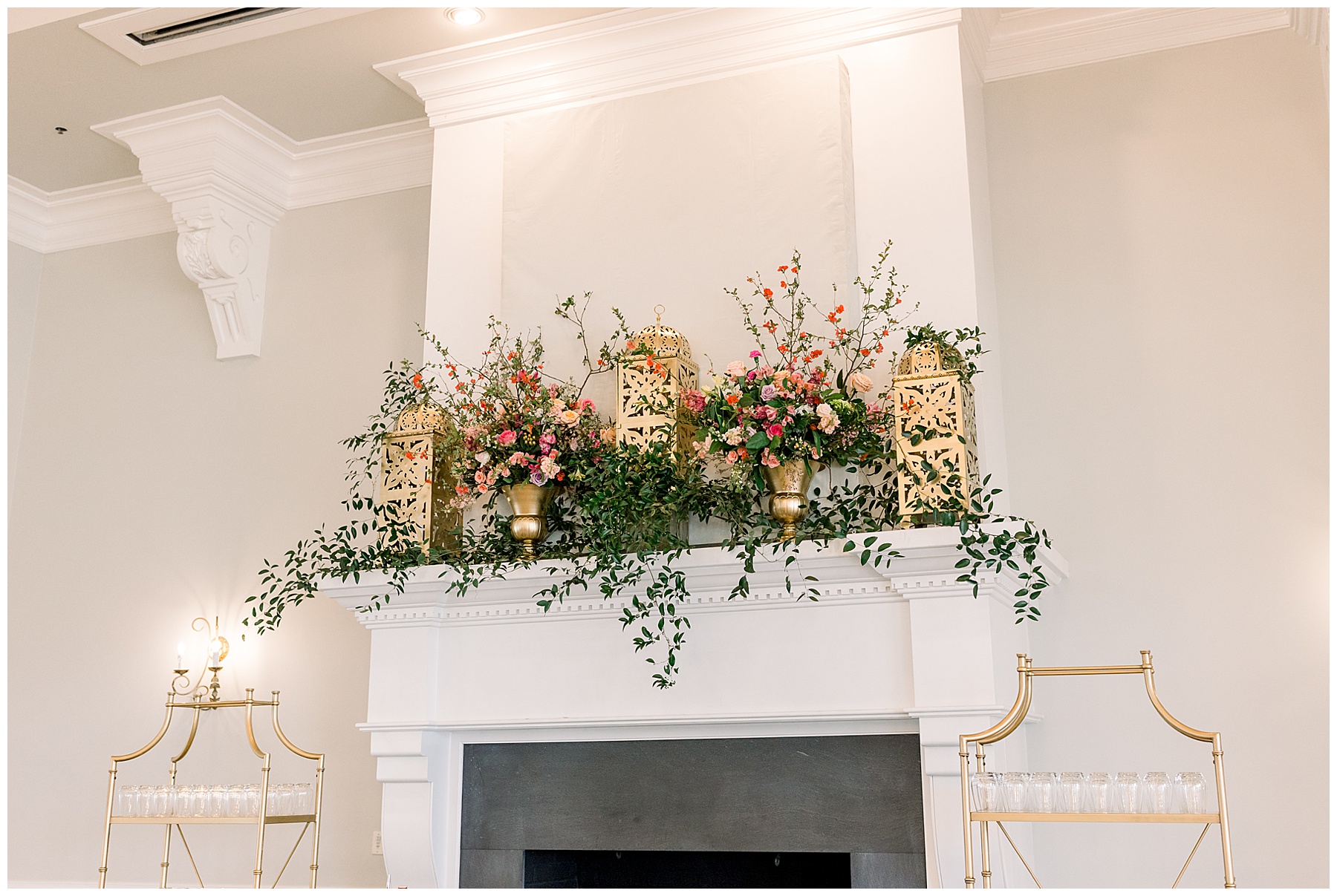 After photographing all the post-ceremony portraits, it was time for the reception!!! Dawn Guy had transformed Nathan Hall with pops of color (it looked like SPRING!) and I especially loved the gorgeous fireplace mantel display! It was so unique. :)