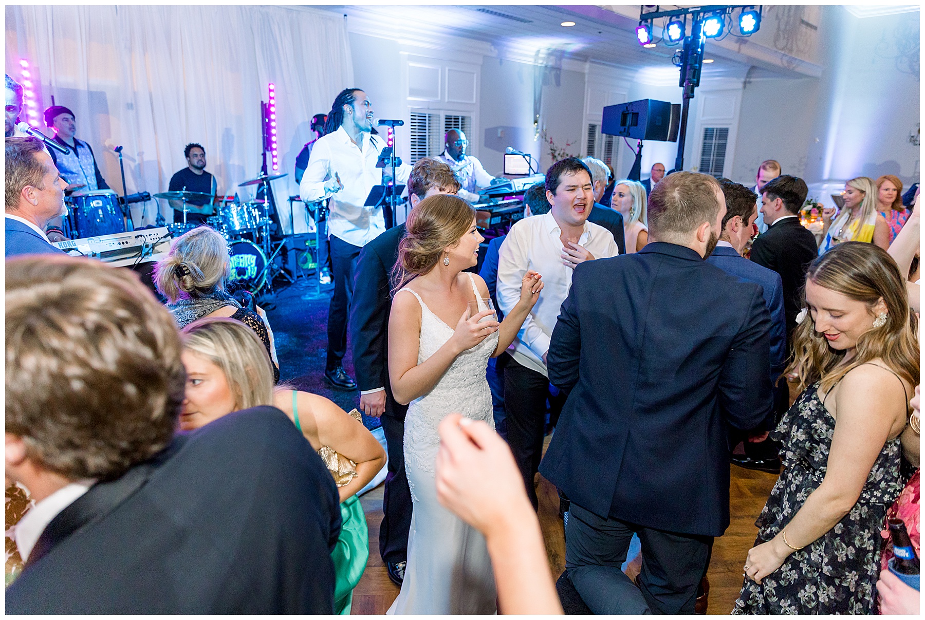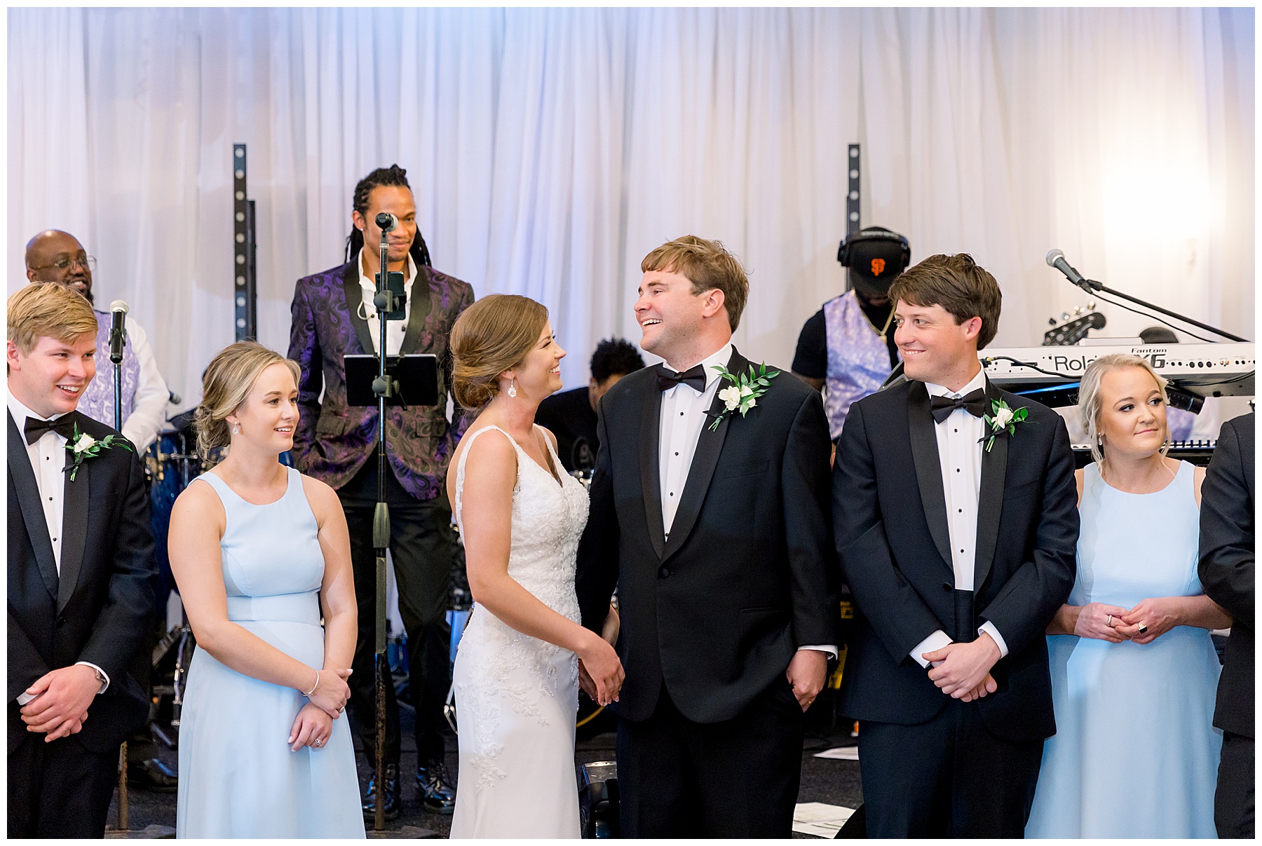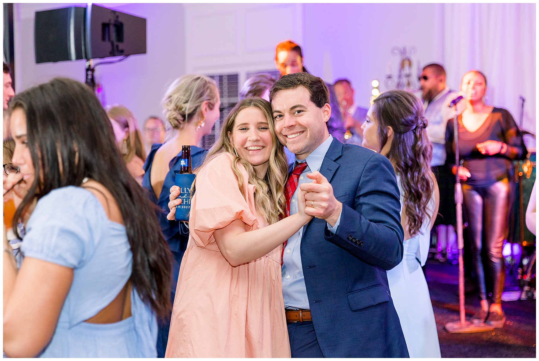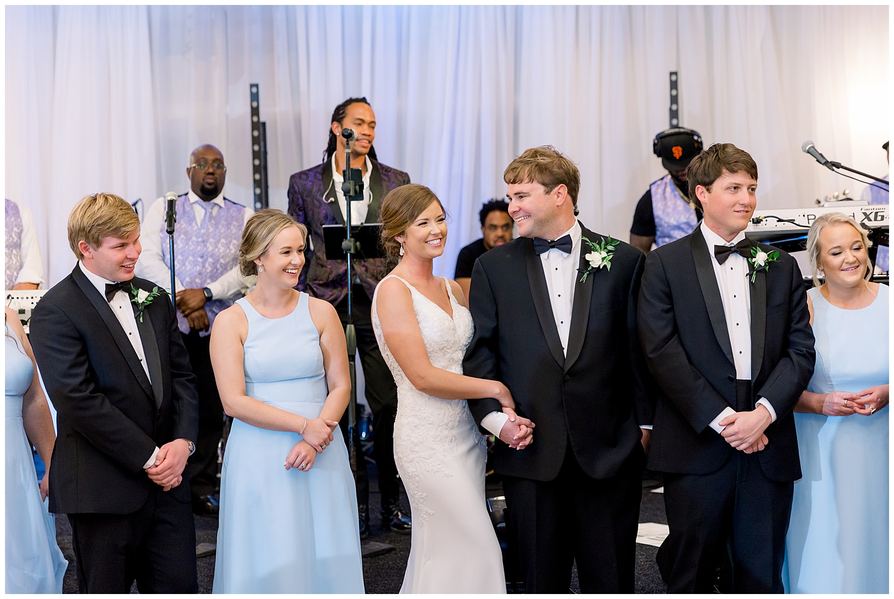 They kicked off the reception with lots of food (3 stations of food – everything from smoked brisket to chips + guacamole!) drinks, cake, and LOTS and LOTS of dancing! The Sleeping Booty Band kept the guests on the dance floor ALL NIGHT LONG! They were so much fun to watch and interactive too! Fun fact – for the past 2 years Phillip and I have been virtually attending the Summit Church, and our favorite Summit musician Mike just HAPPENED to be the lead singer of the band!!!! I totally fangirled and loved every minute of seeing him perform in person!