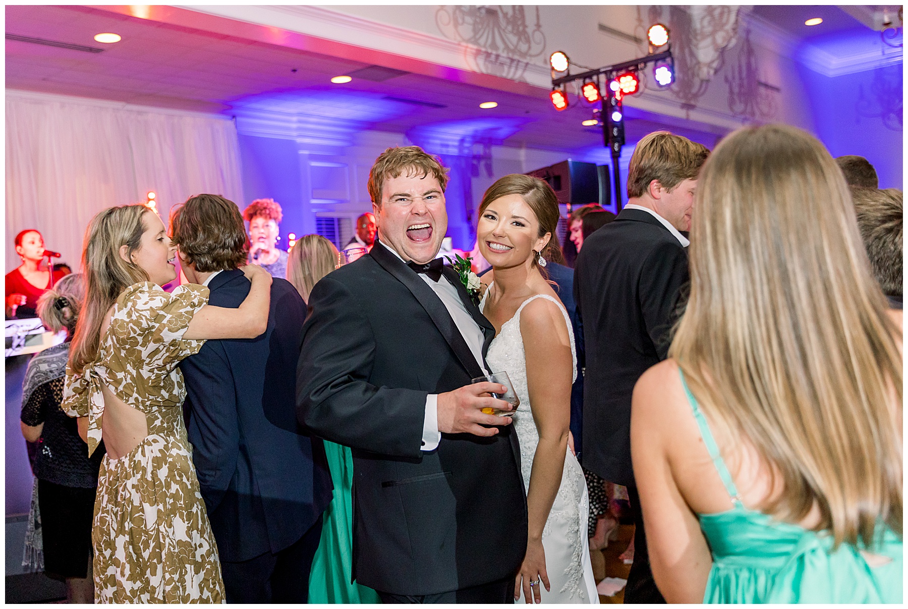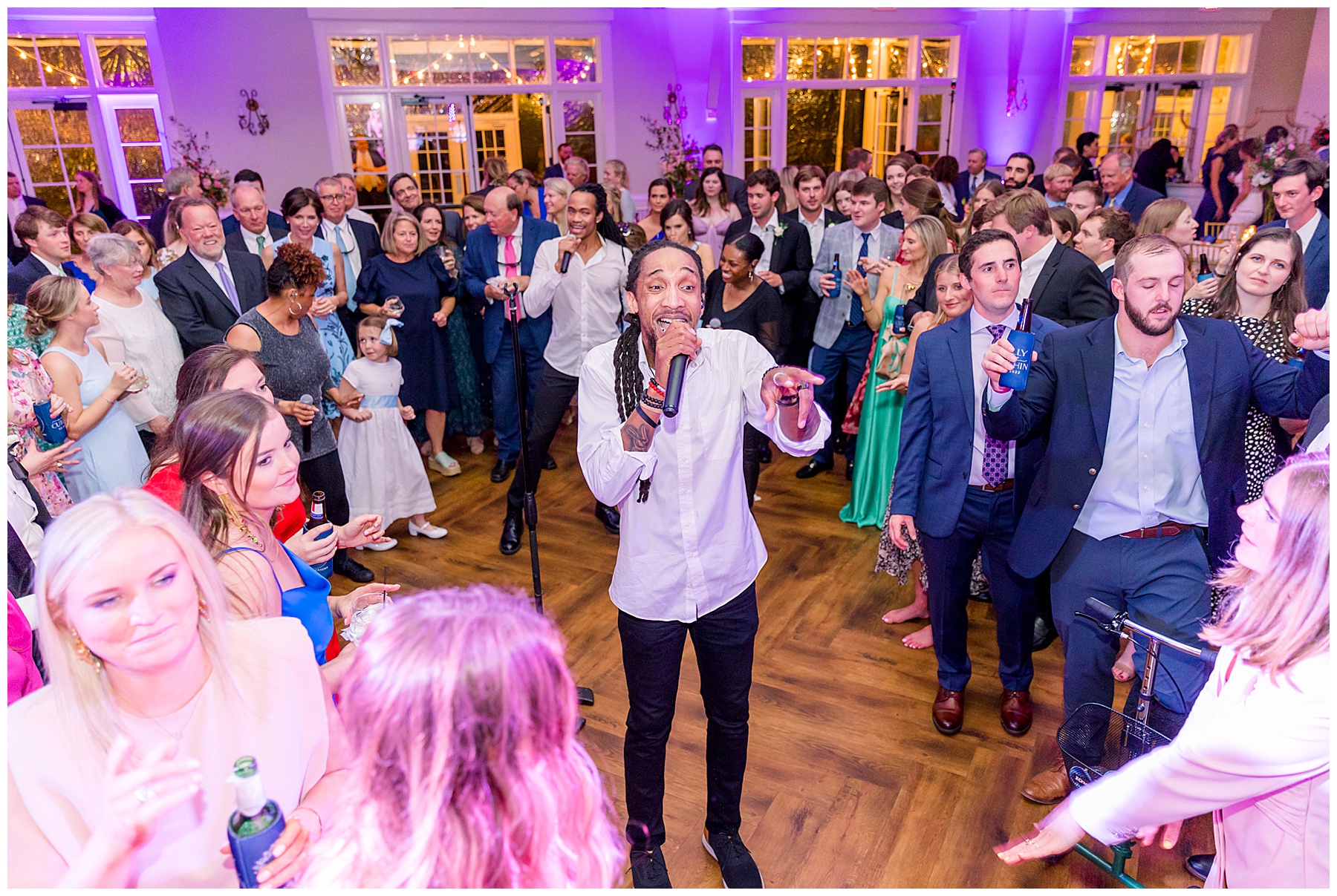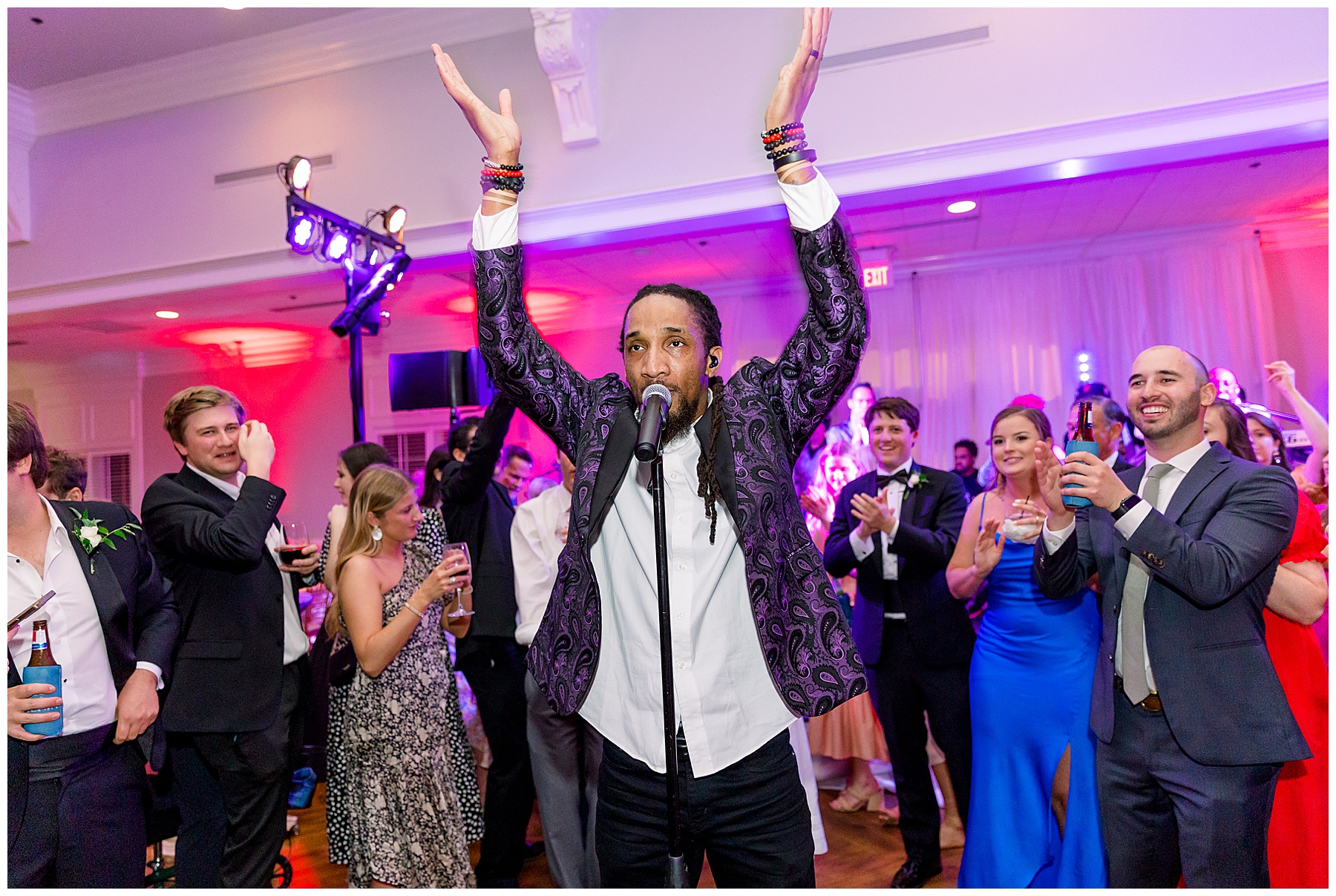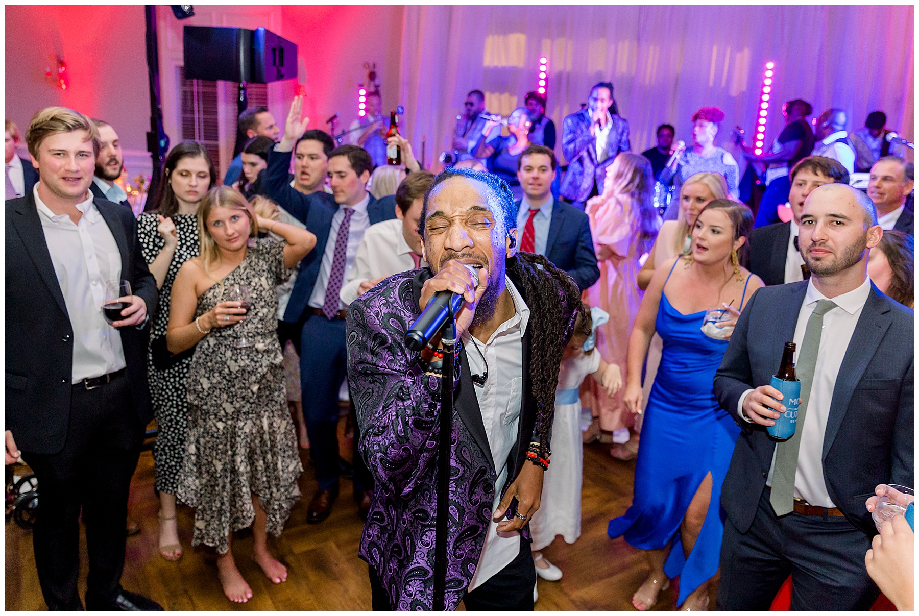 They kicked off the reception with lots of food (3 stations of food – everything from smoked brisket to chips + guacamole!) drinks, cake, and LOTS and LOTS of dancing! The Sleeping Booty Band kept the guests on the dance floor ALL NIGHT LONG! They were so much fun to watch and interactive too! Fun fact – for the past 2 years Phillip and I have been virtually attending the Summit Church, and our favorite Summit musician Mike just HAPPENED to be the lead singer of the band!!!! I totally fangirled and loved every minute of seeing him perform in person!