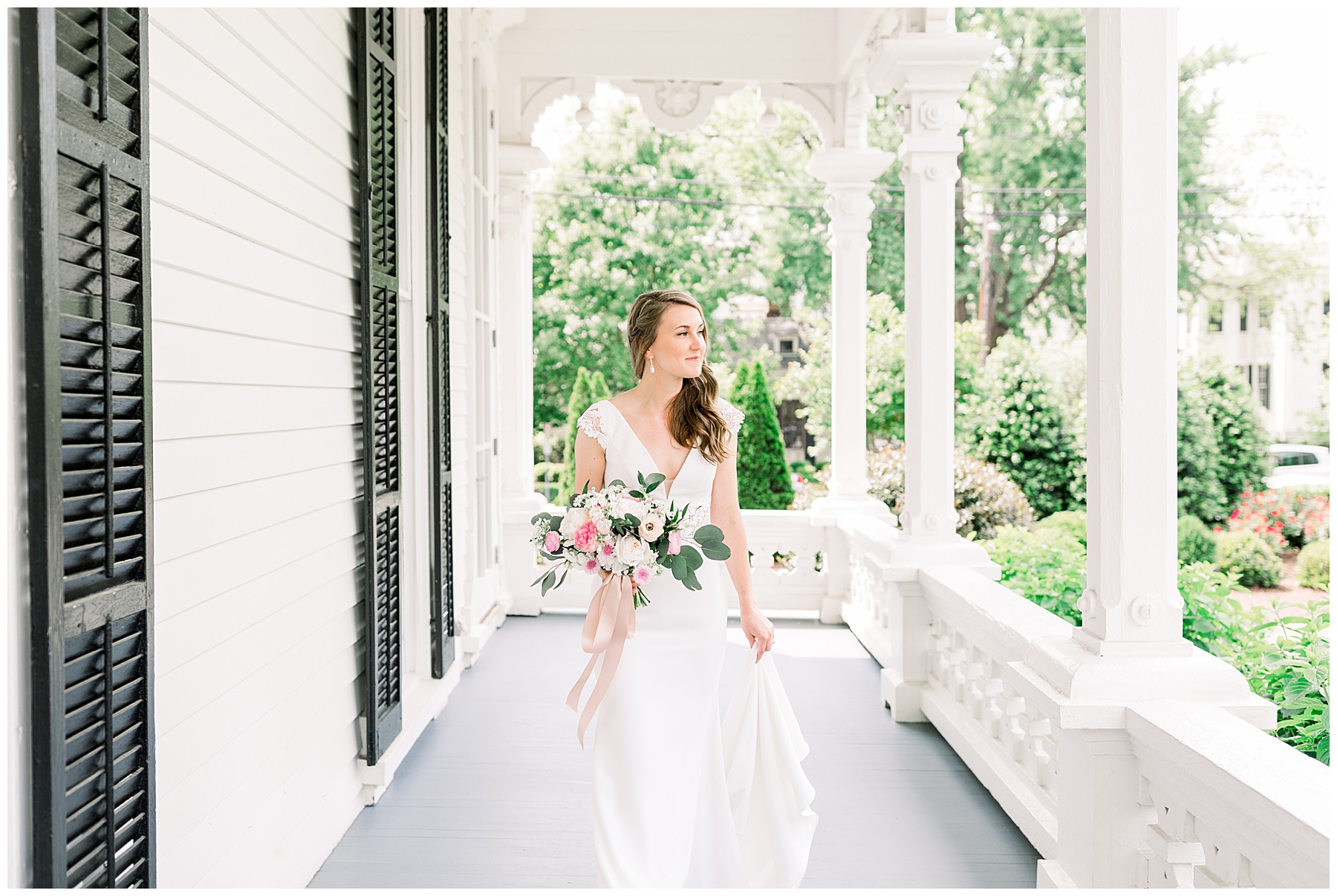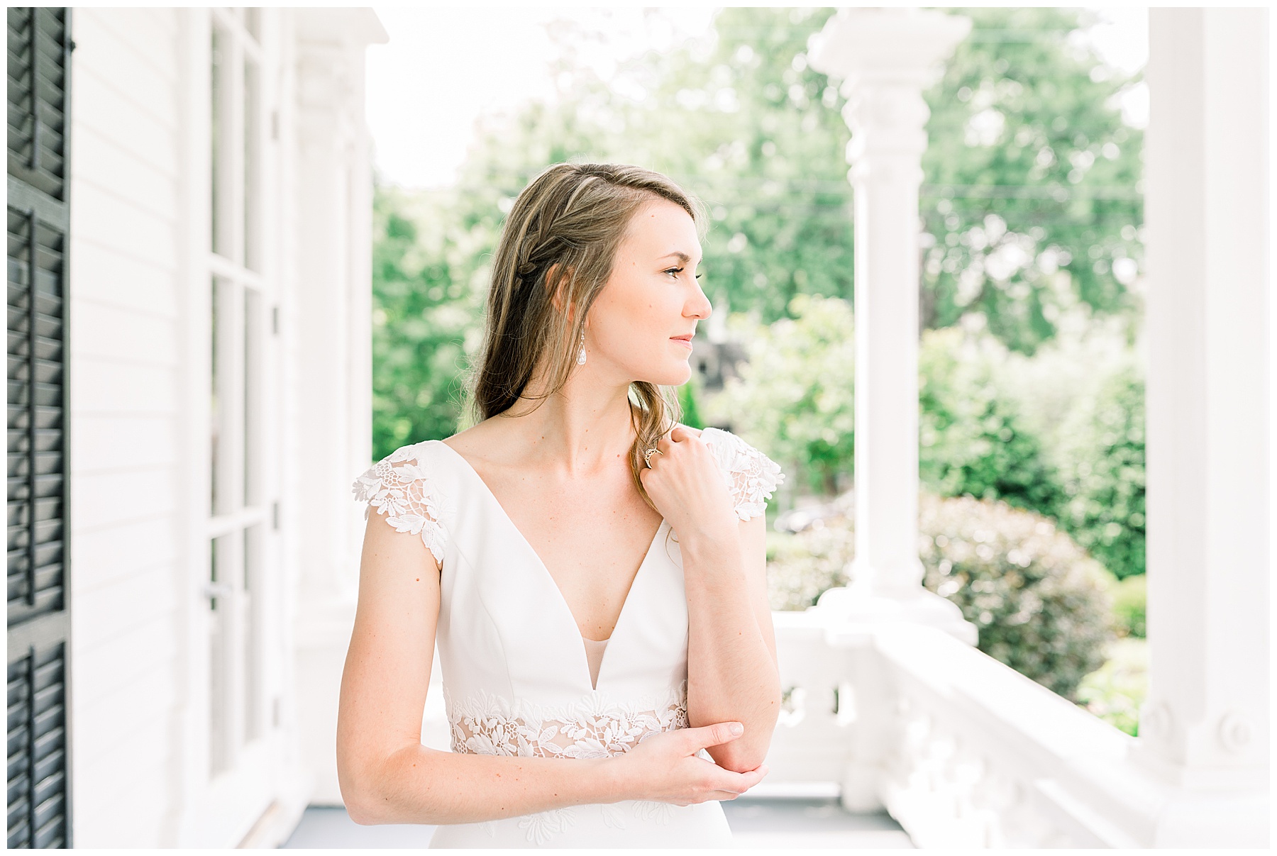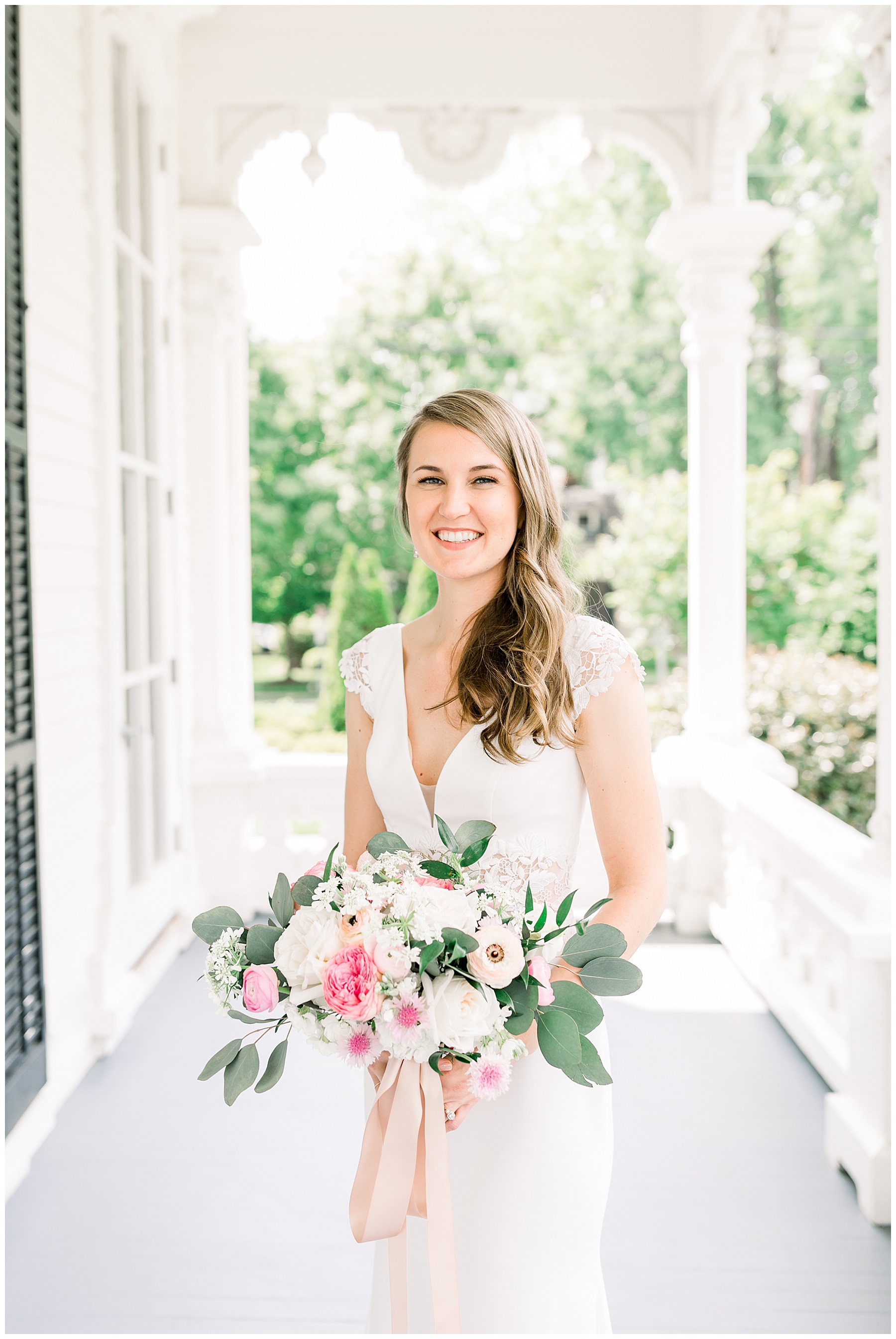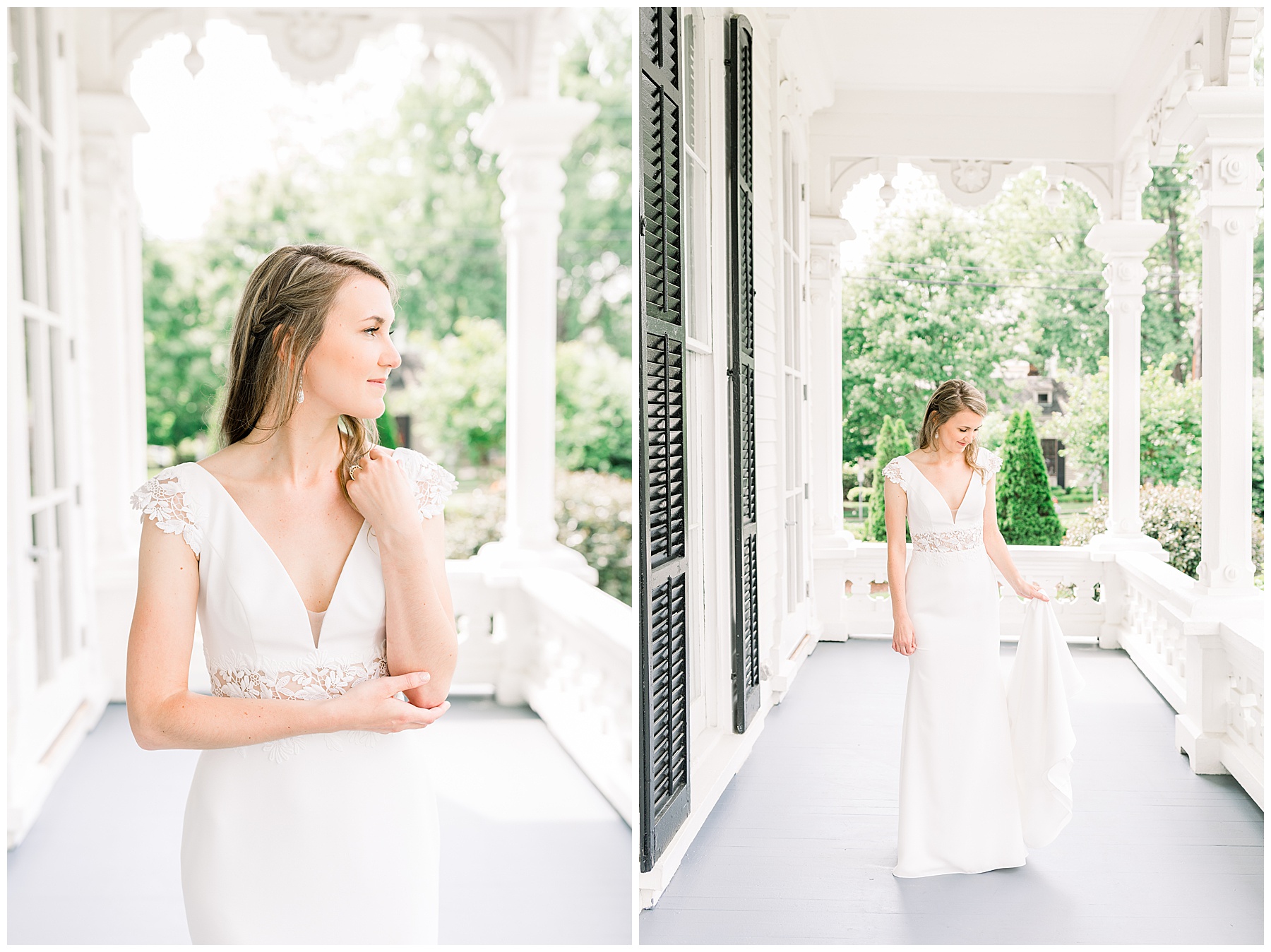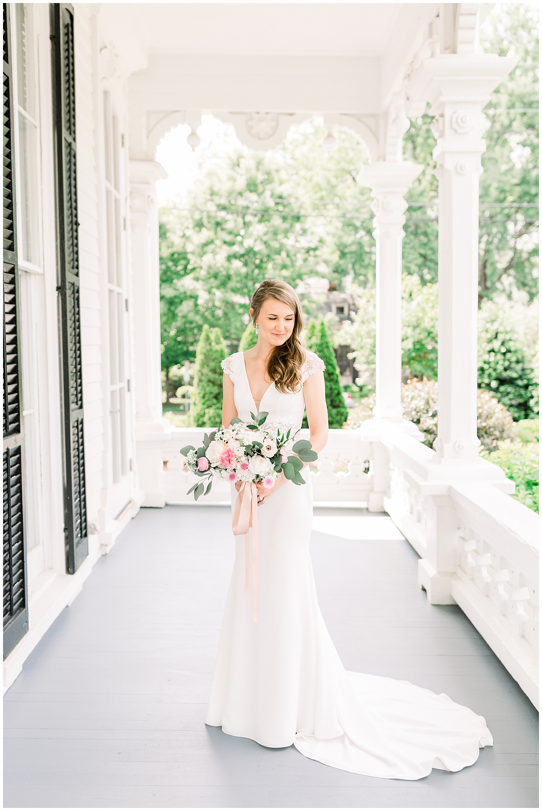 We had a gorgeous afternoon to shoot her session, and even though we shot from 2-4:00pm, we were able to go outside and take some outdoor photos without it looking too harsh! I call that a WIN! My favorite photos of the whole session were the ones on the porch… the intricate detailing of the porch railing with the pops of green behind Nicole were a beauitful combination!