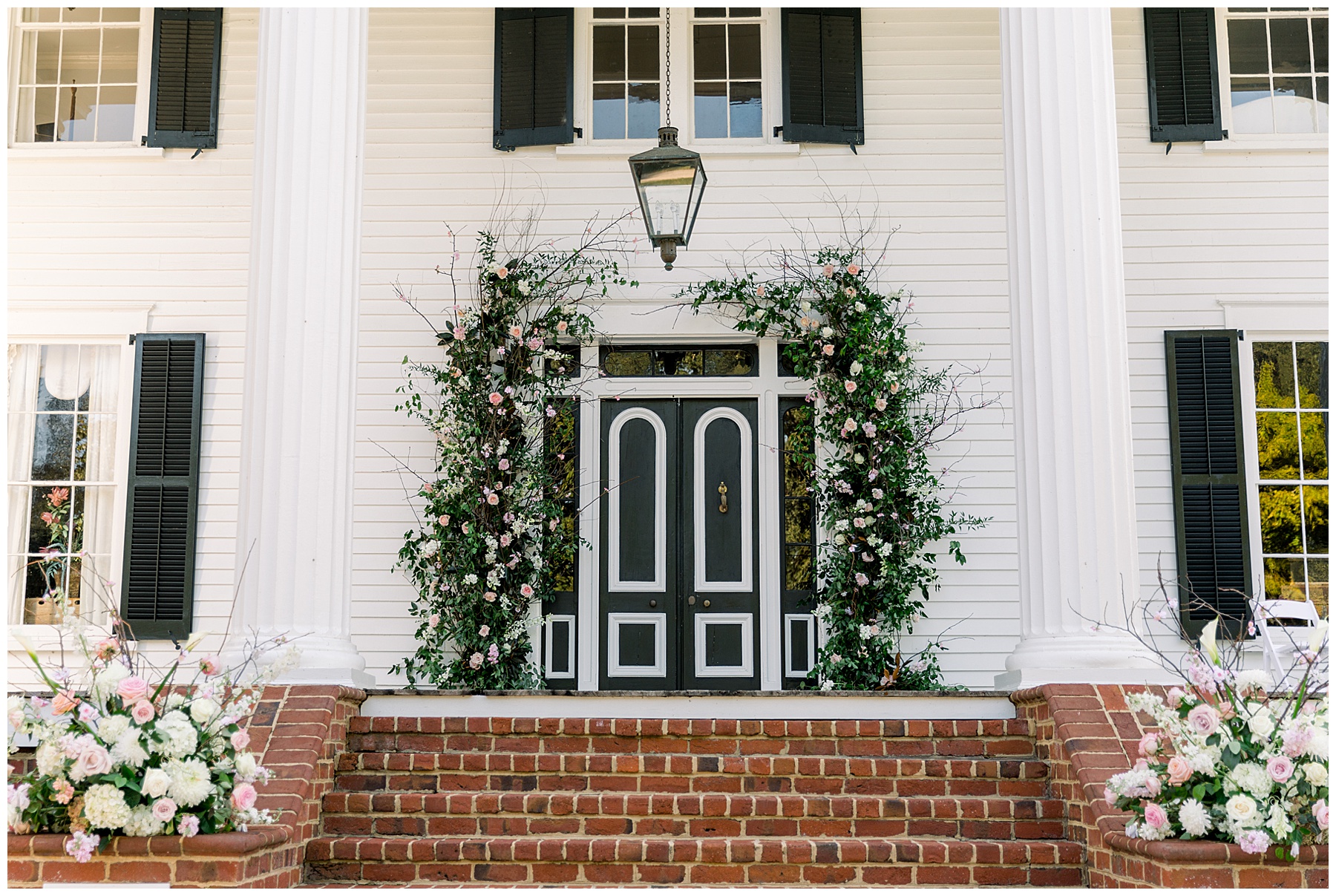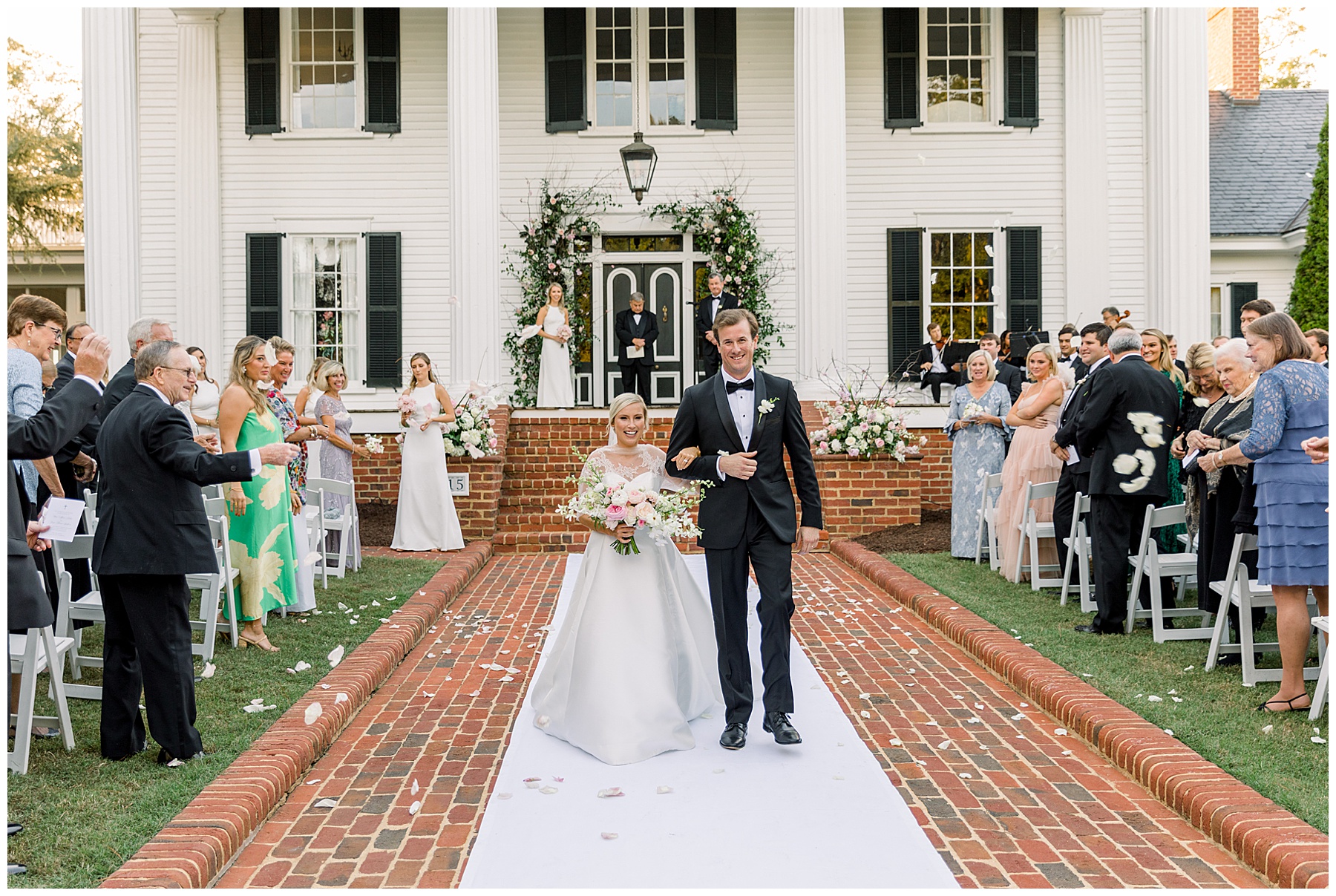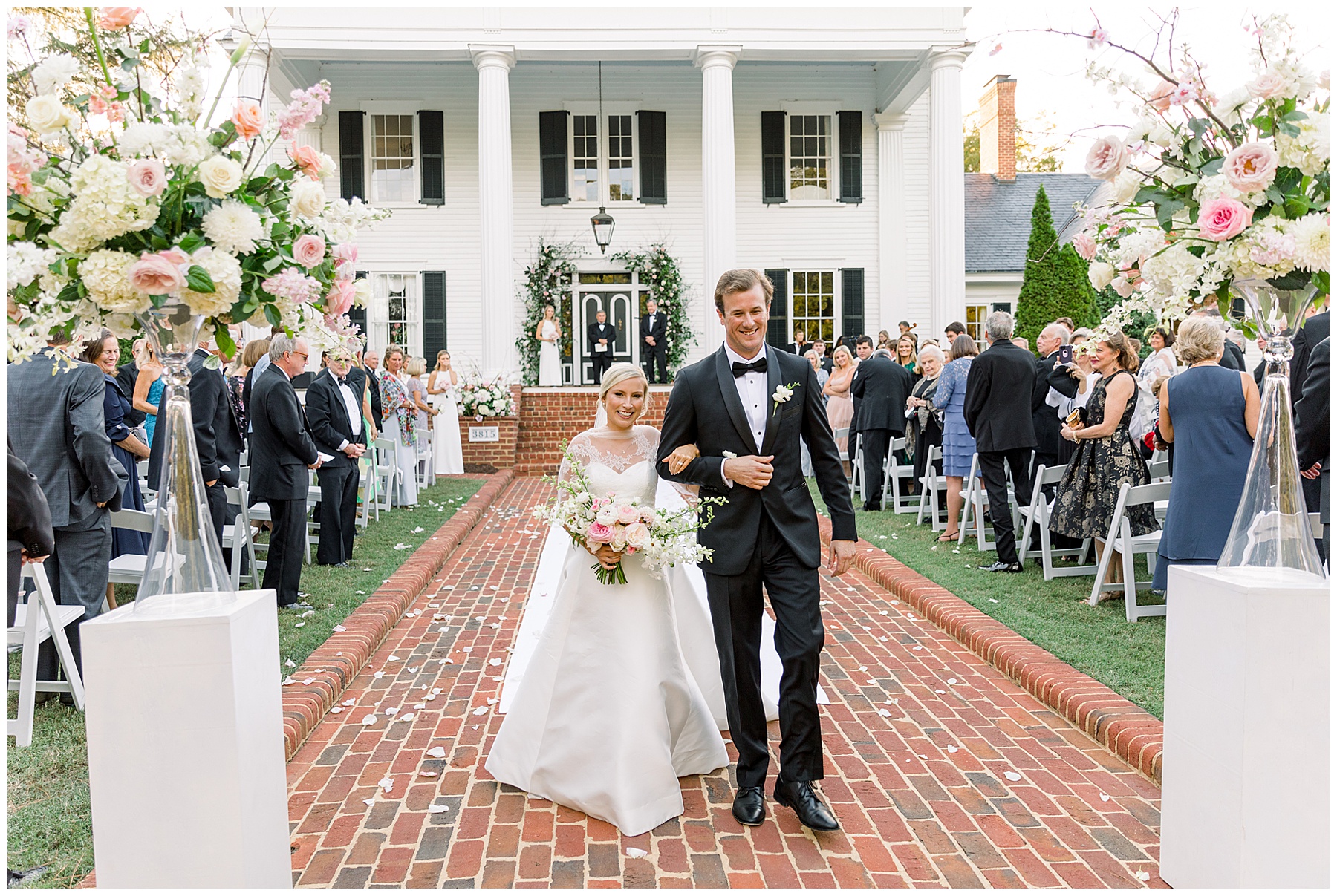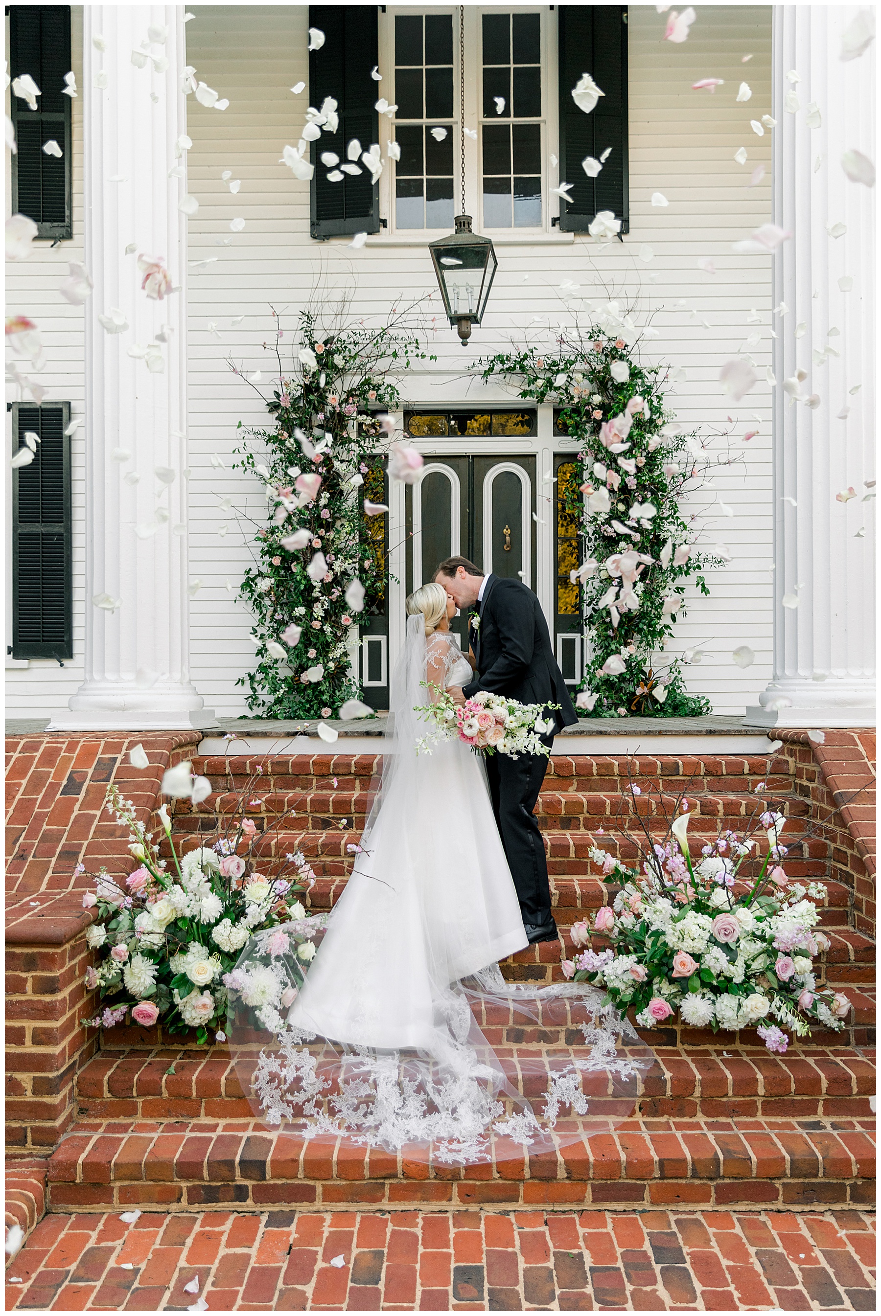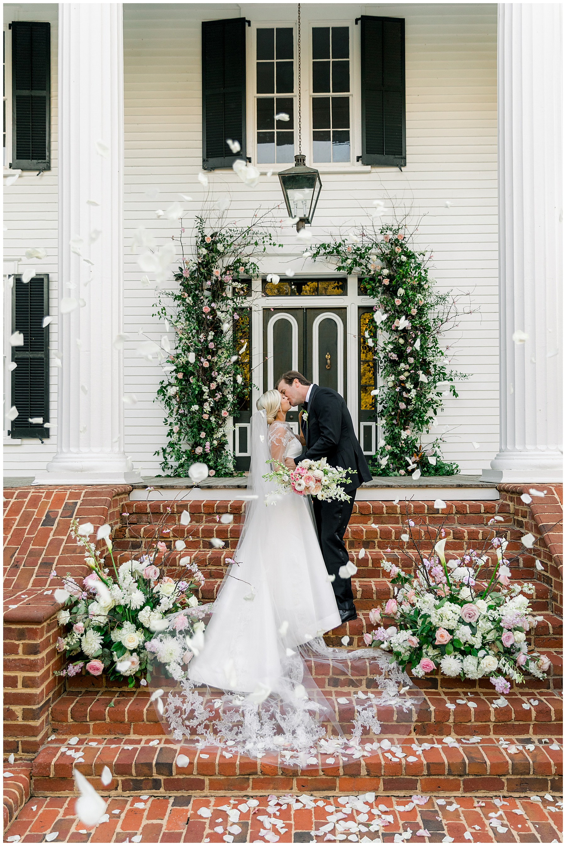 Their ceremony took place in front of the manor house – and the floral arch was so whimsical featuring some greenery from Olivia’s family home. I loved that unique touch making it personal. Their guests had perfect weather to enjoy sitting outside watching them become husband and wife. One of my favorite parts of the ceremony was the recessional – guests tossed petals as they recessed down the aisle, and it was such a romantic touch!