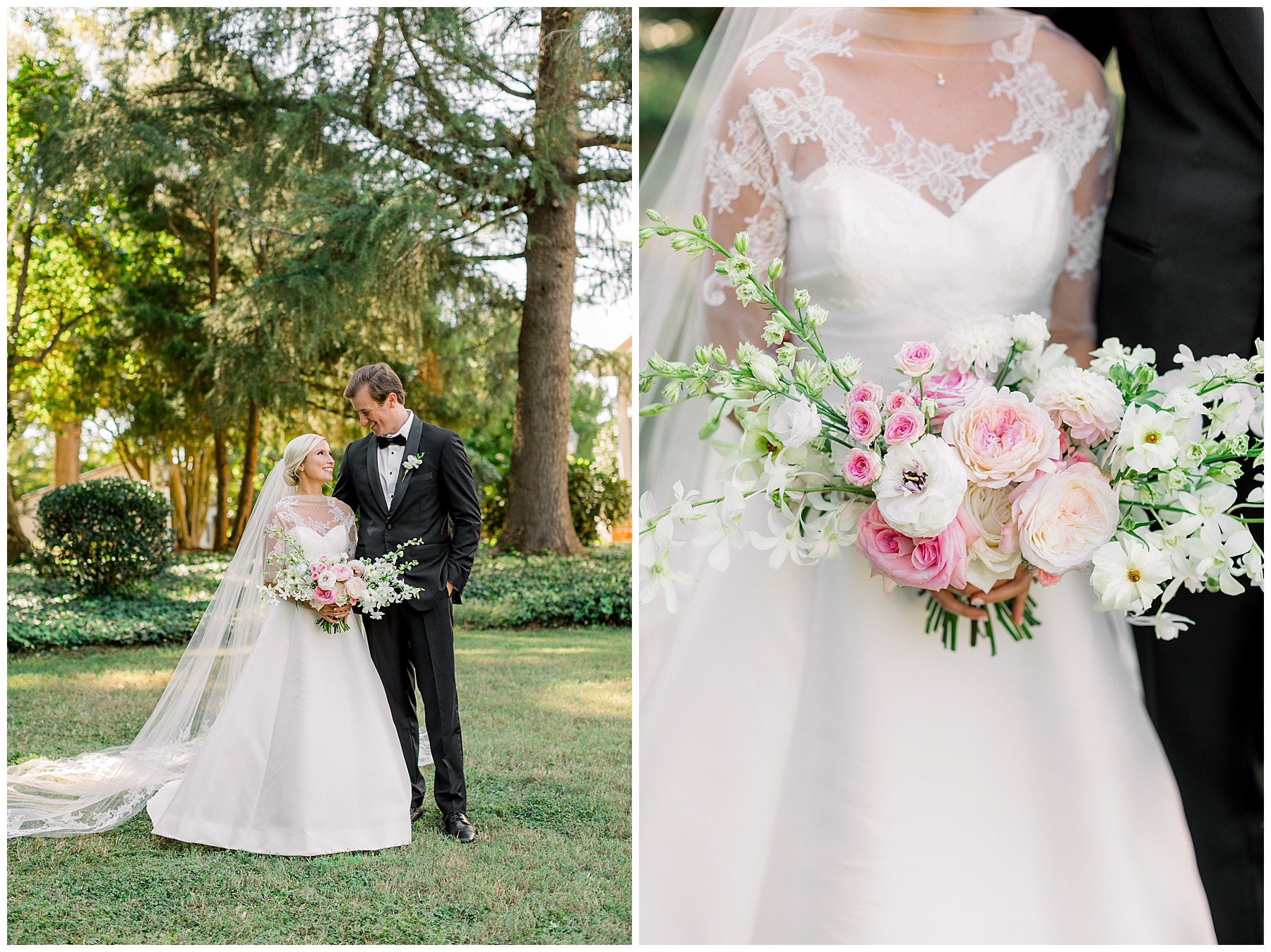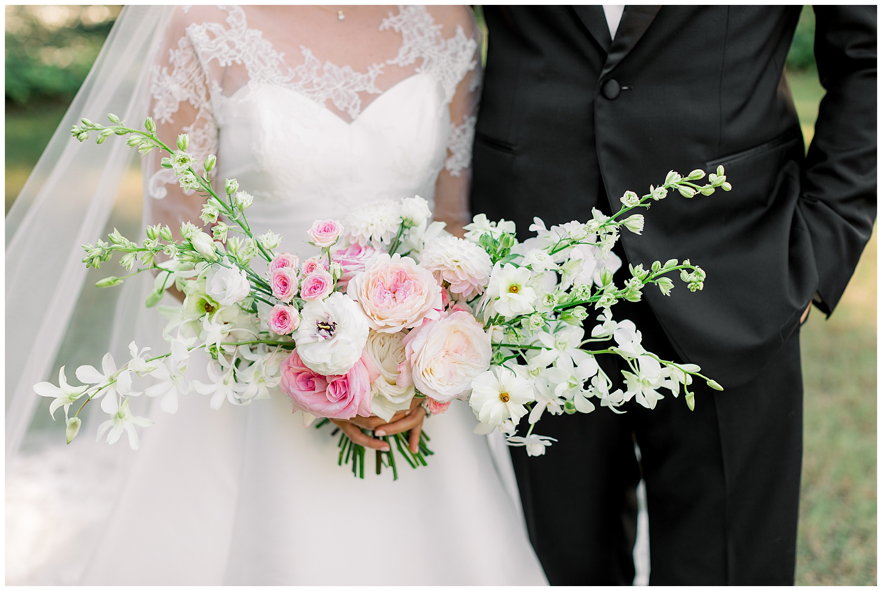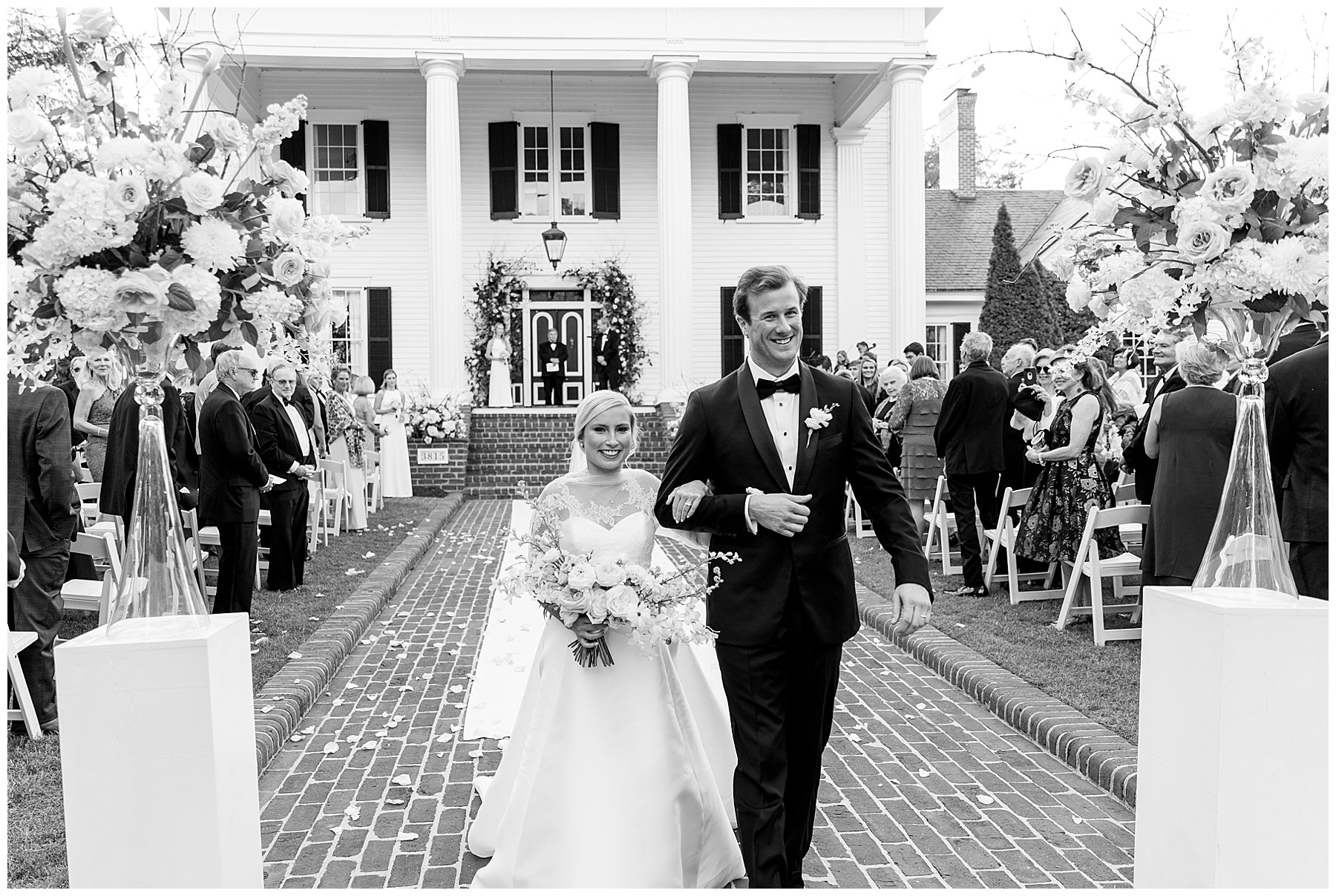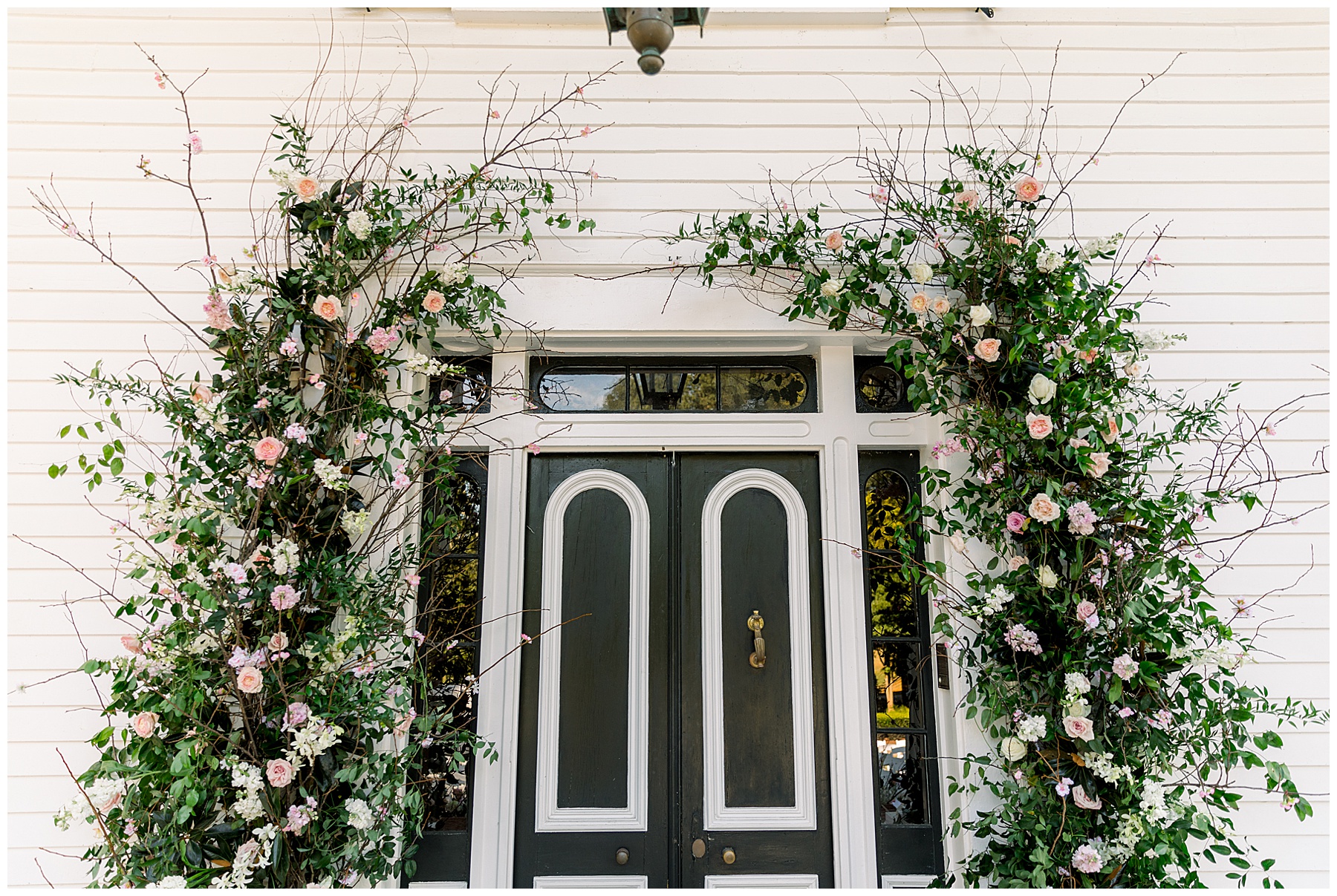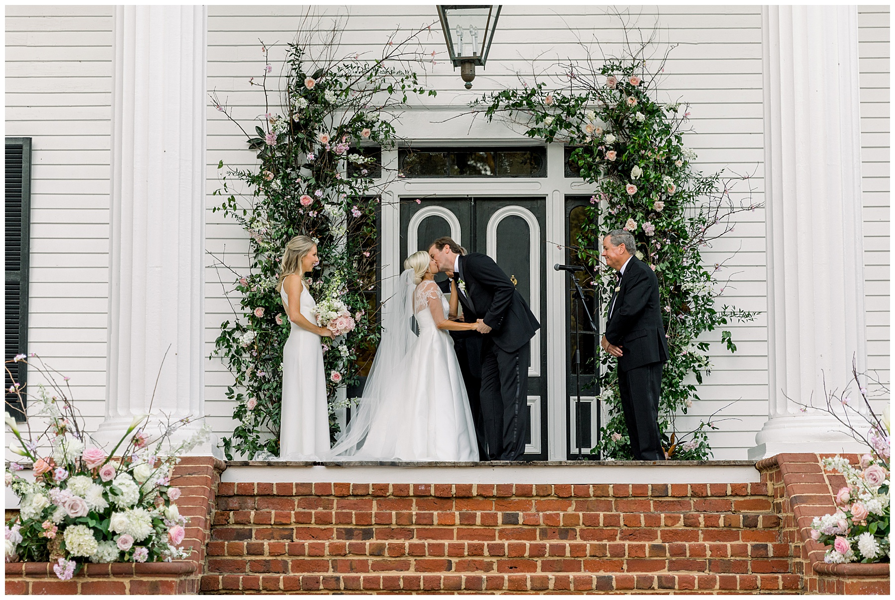 Their ceremony took place in front of the manor house – and the floral arch was so whimsical featuring some greenery from Olivia’s family home. I loved that unique touch making it personal. Their guests had perfect weather to enjoy sitting outside watching them become husband and wife. One of my favorite parts of the ceremony was the recessional – guests tossed petals as they recessed down the aisle, and it was such a romantic touch!