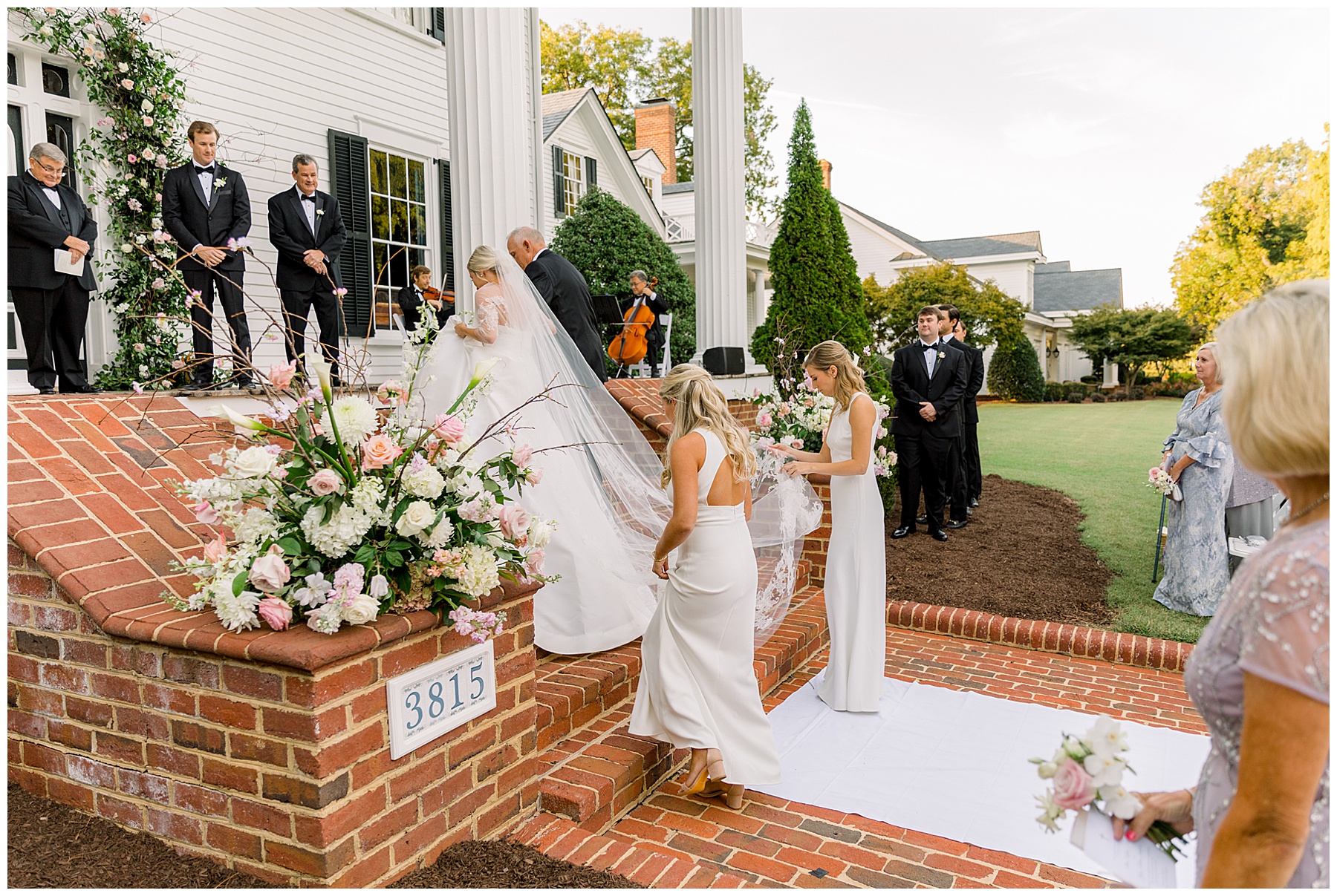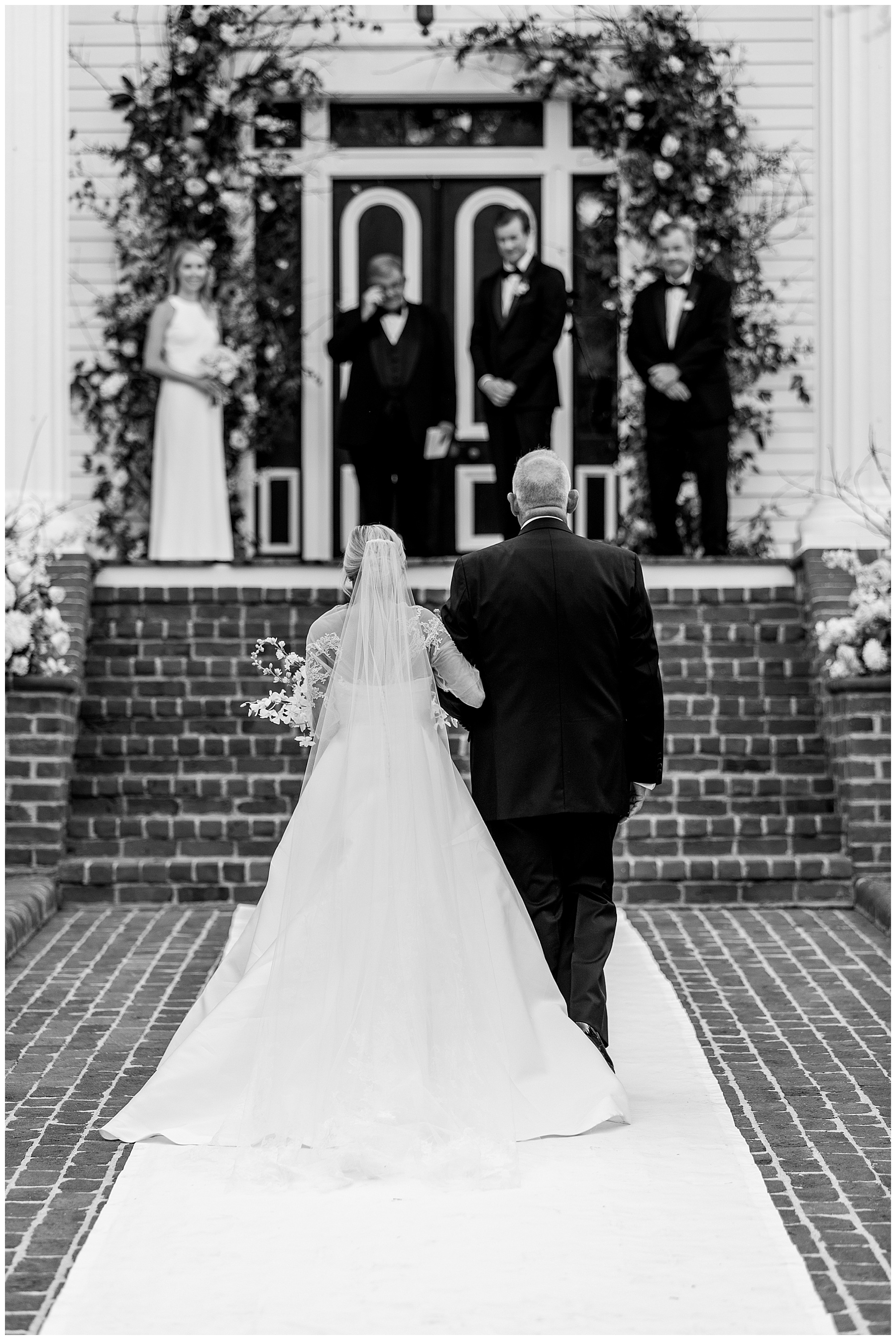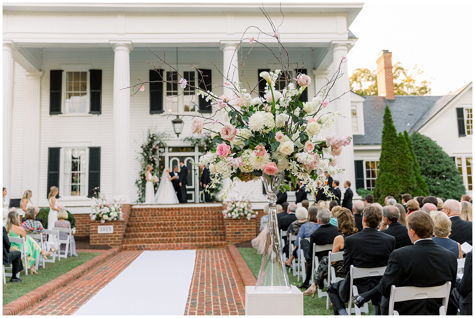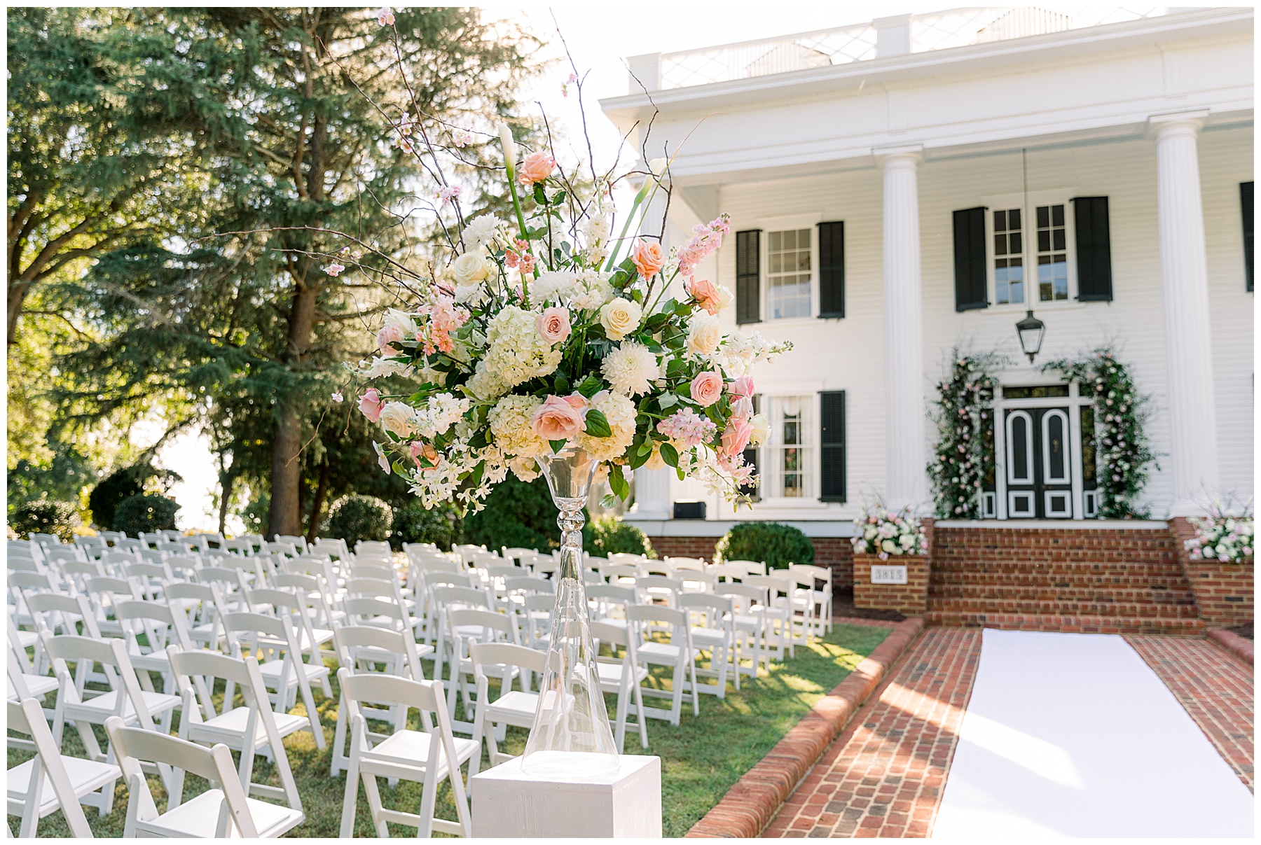 Their ceremony took place in front of the manor house – and the floral arch was so whimsical featuring some greenery from Olivia’s family home. I loved that unique touch making it personal. Their guests had perfect weather to enjoy sitting outside watching them become husband and wife. One of my favorite parts of the ceremony was the recessional – guests tossed petals as they recessed down the aisle, and it was such a romantic touch!