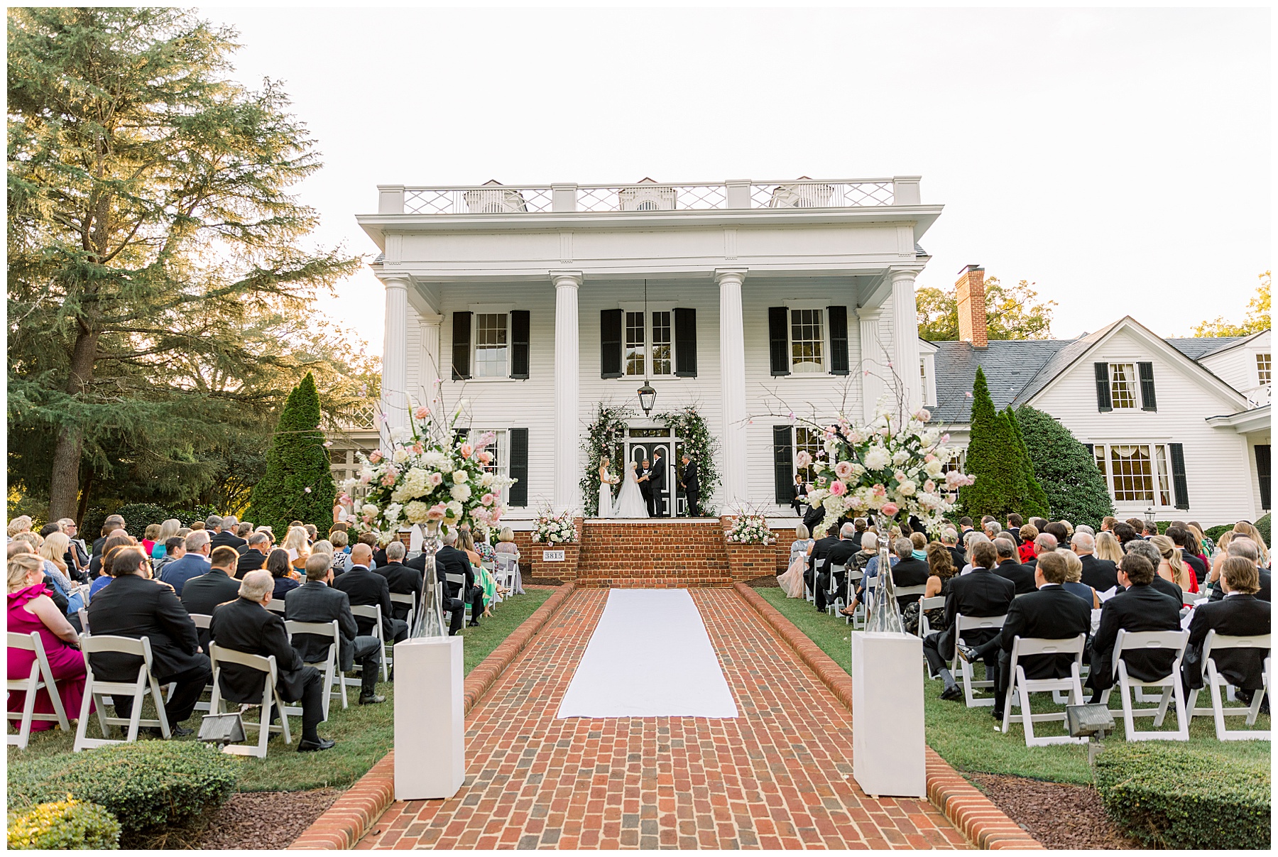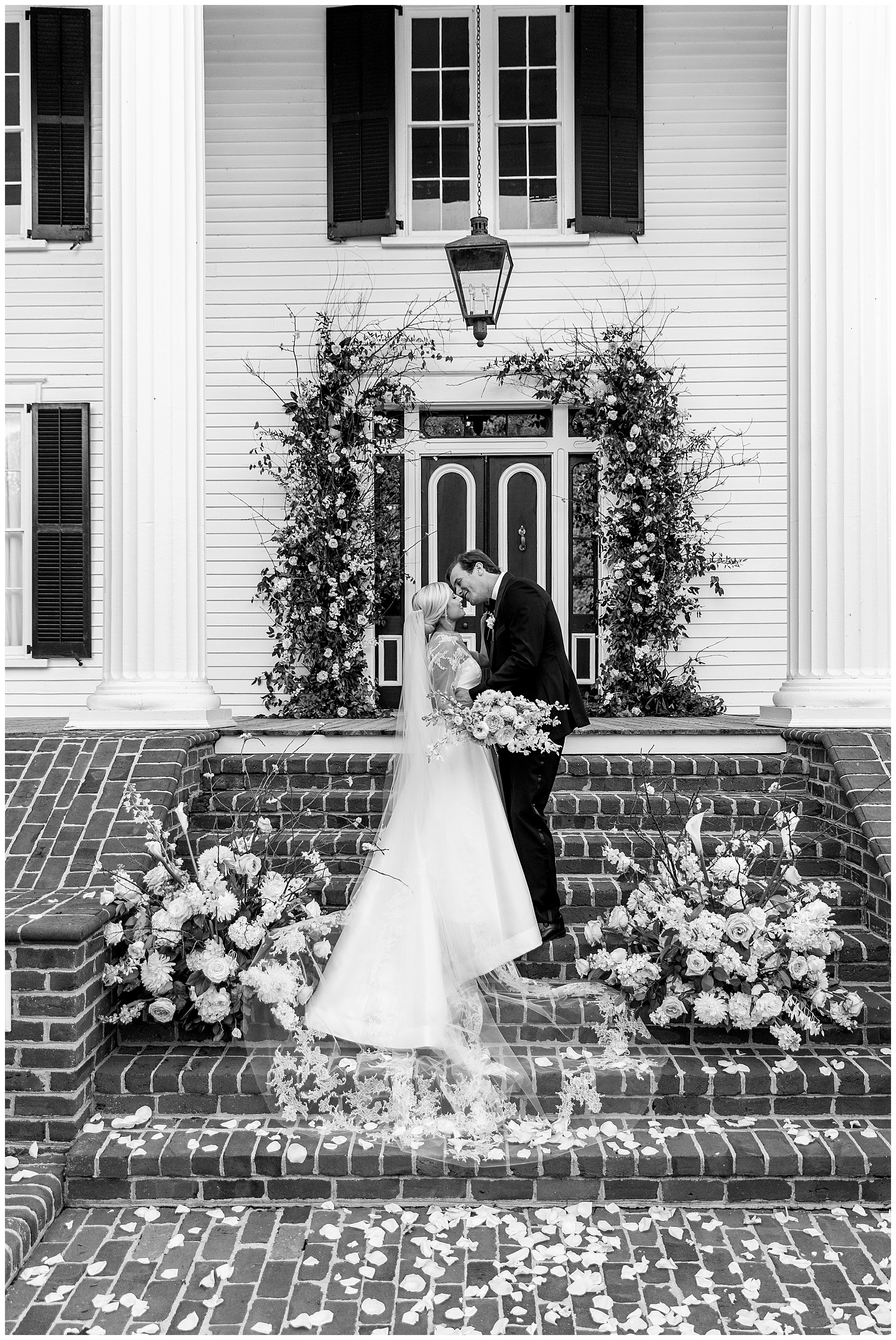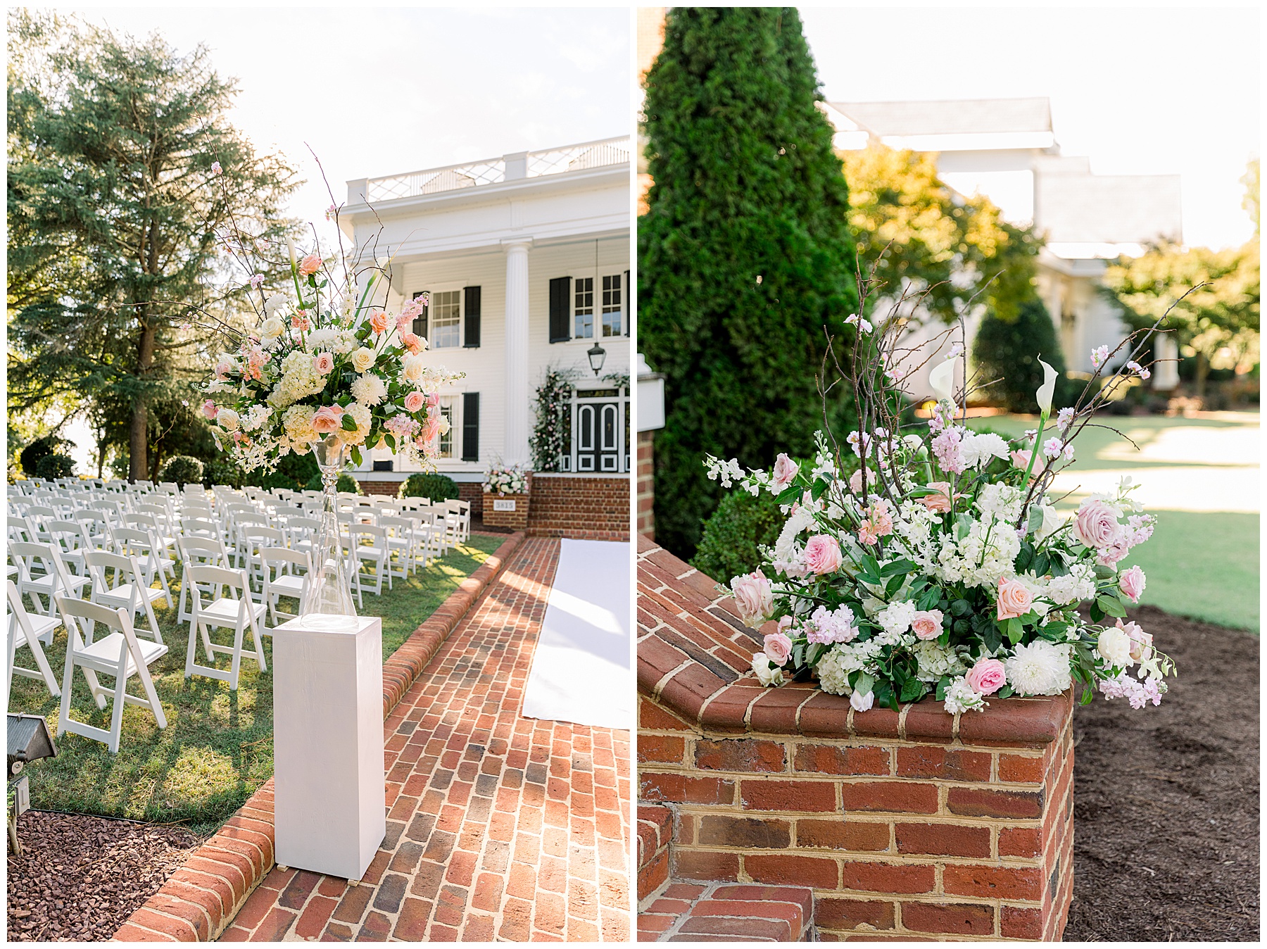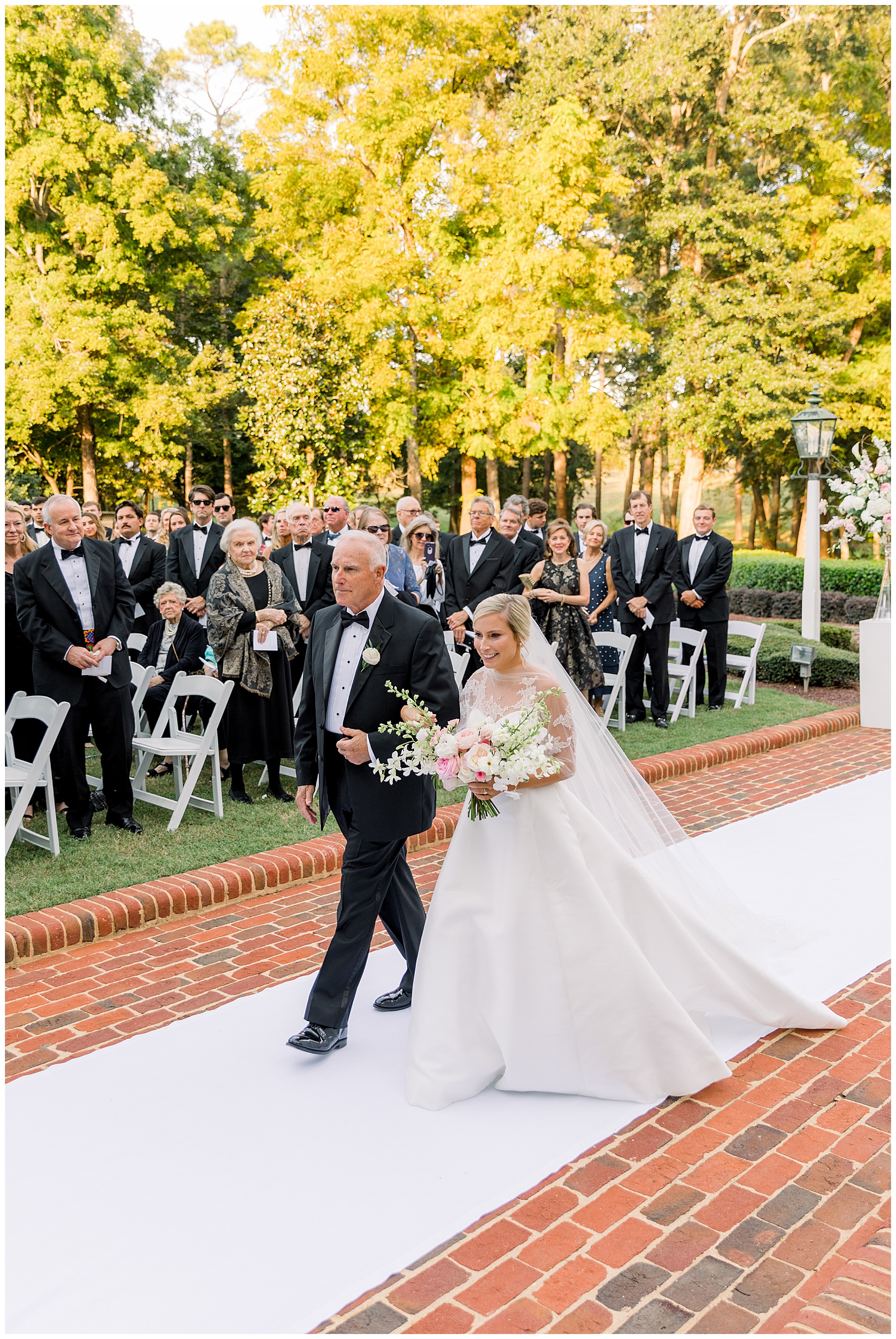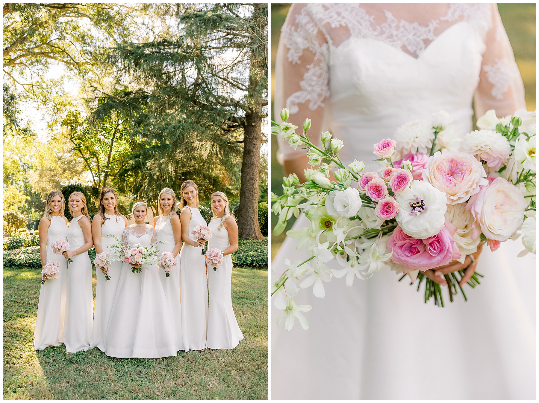 Their ceremony took place in front of the manor house – and the floral arch was so whimsical featuring some greenery from Olivia’s family home. I loved that unique touch making it personal. Their guests had perfect weather to enjoy sitting outside watching them become husband and wife. One of my favorite parts of the ceremony was the recessional – guests tossed petals as they recessed down the aisle, and it was such a romantic touch!