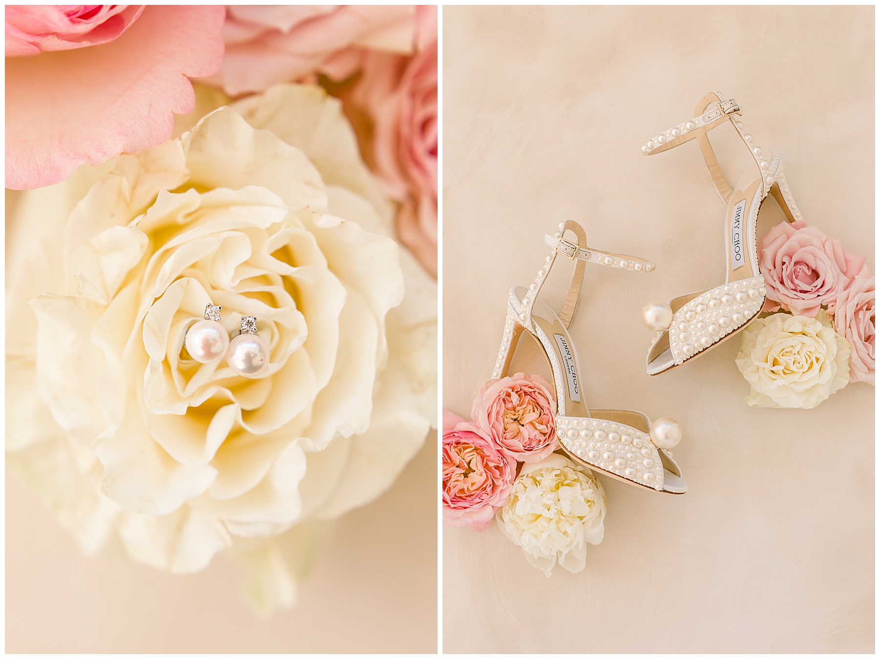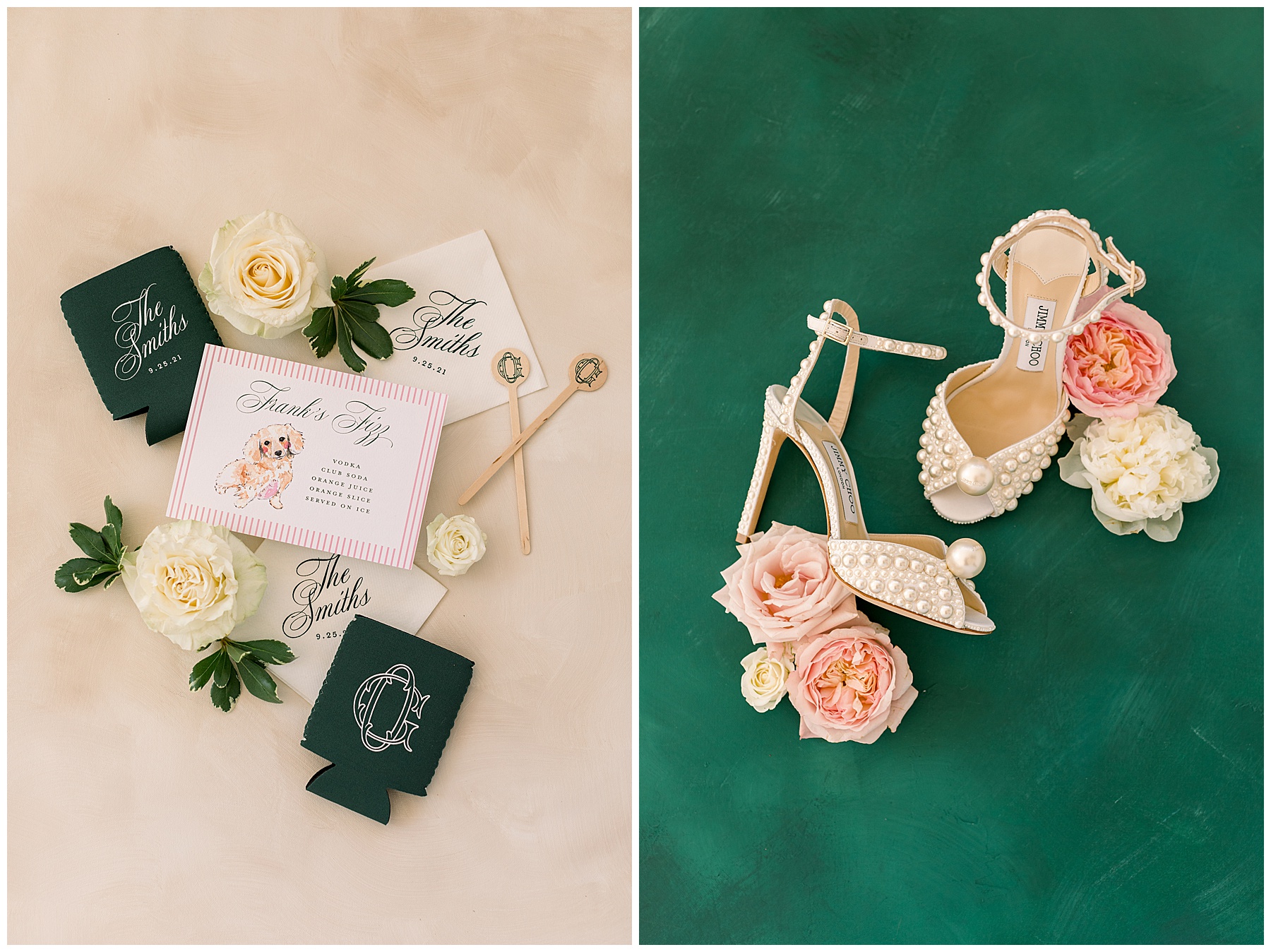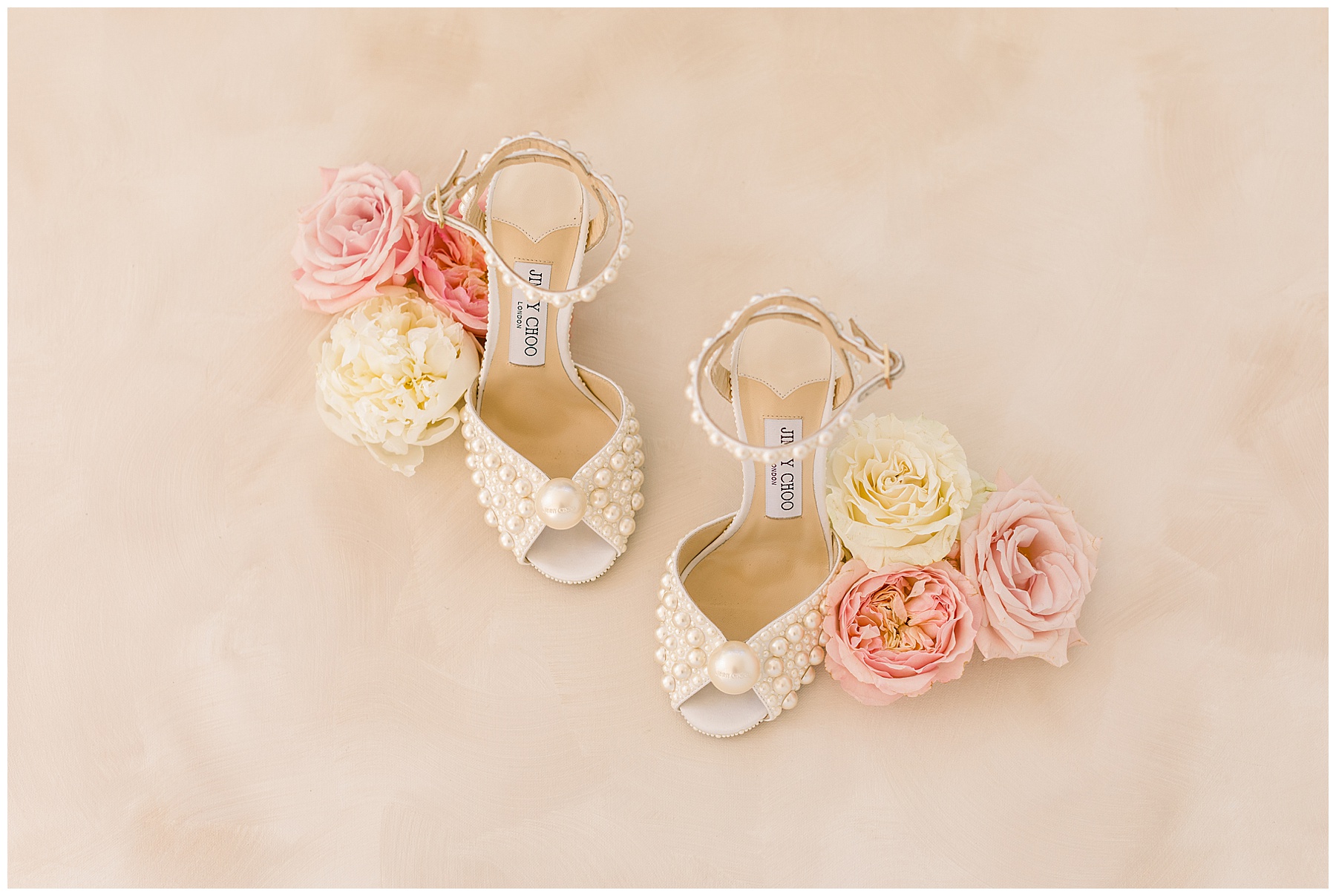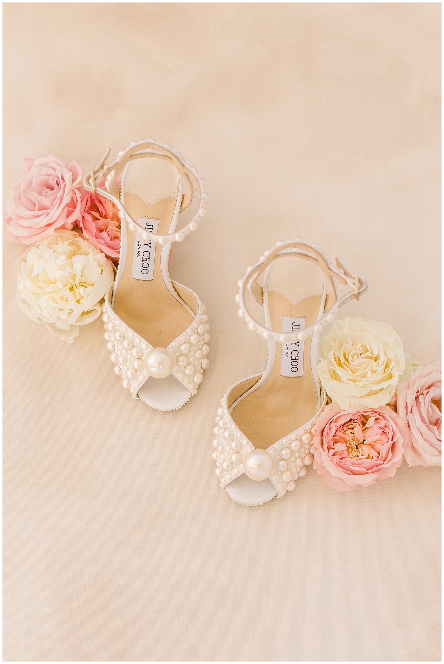 We started off the day photographing Olivia’s details. I loved all the beautiful paper pieces, and so much thought was put into each item! A handkerchief from George’s grandmother (who passed away), a cocktail sign named after their dog, a custom venue watercolor by one of Olivia’s bridesmaids, and of course that gorgeous butterfly veil was so stunning to photograph. Olivia’s Jimmy Choos covered in pearls were so unique and a modern twist on a classic – pearls! I’ve had so many people message me saying how much they LOVE Olivia’s shoes! Even more impressive was that Olivia wore those high heels almost the ENTIRE day!