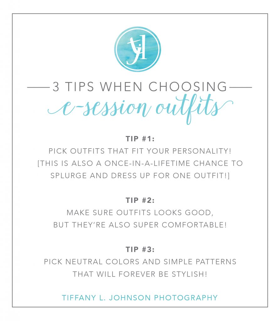 Again, don’t choose neon like I did (cringe). Maybe don’t pick zebra print or leopard print – avoid anything that’s trendy. Choose SOLID COLORS, and SIMPLE PATTERNS. You don’t have to match exactly either! You BOTH don’t have to wear the same colors. If you’re a Tiffany L. Johnson bride and groom, just read the Engagement Guide we sent you, with a whole section on “GUYS: What to wear” and “LADIES: What to wear” for all the details on colors, patterns, etc.!
