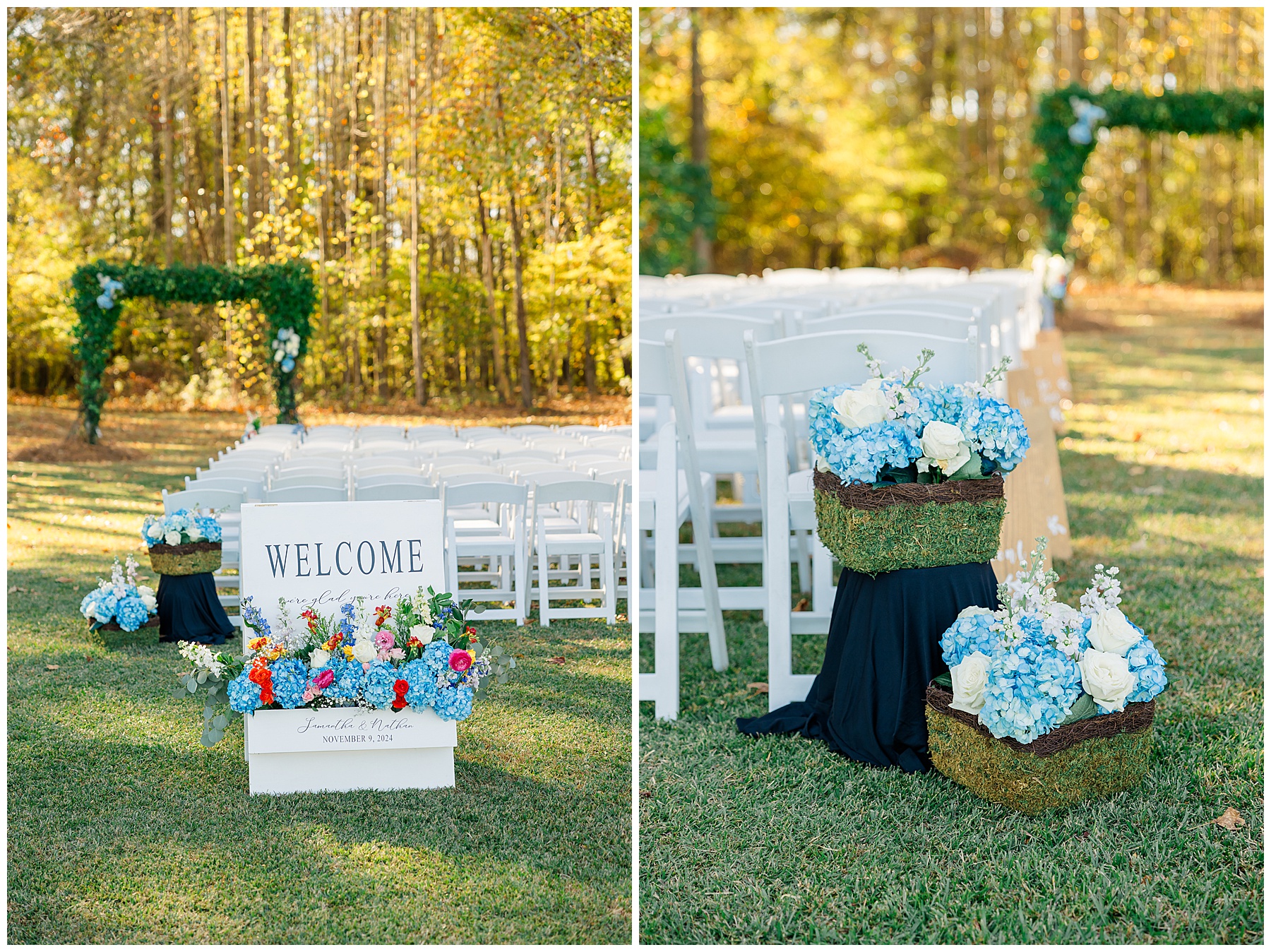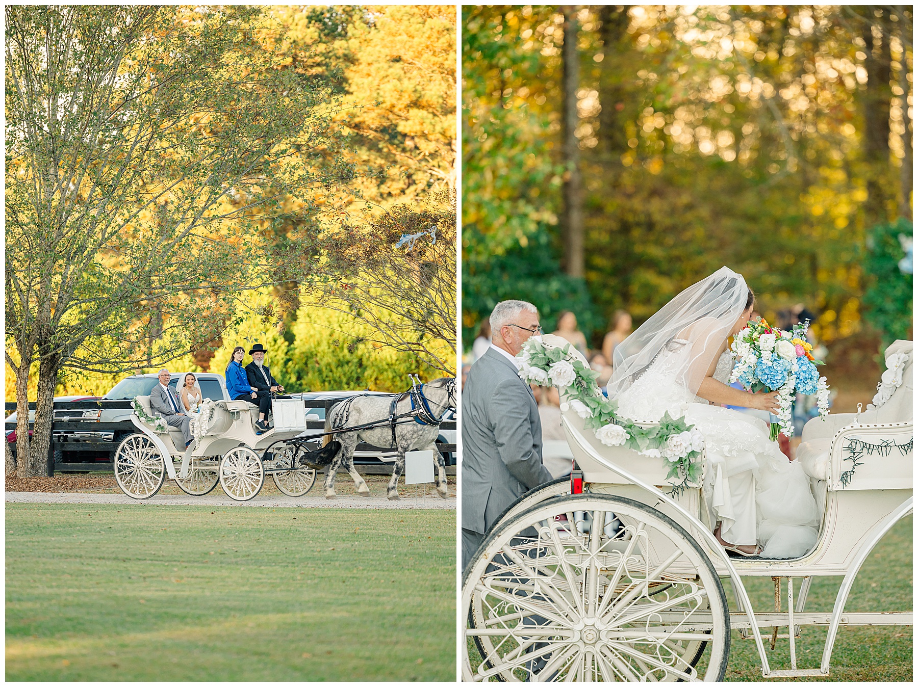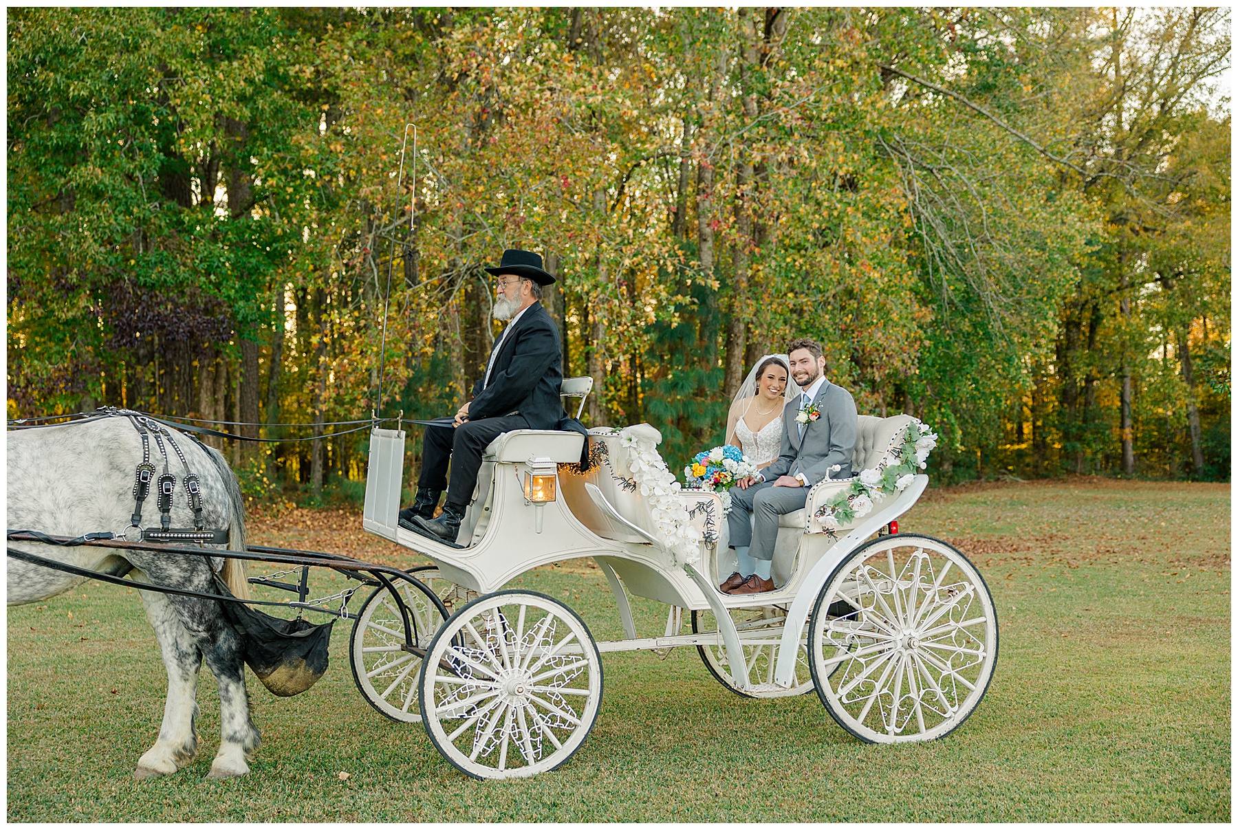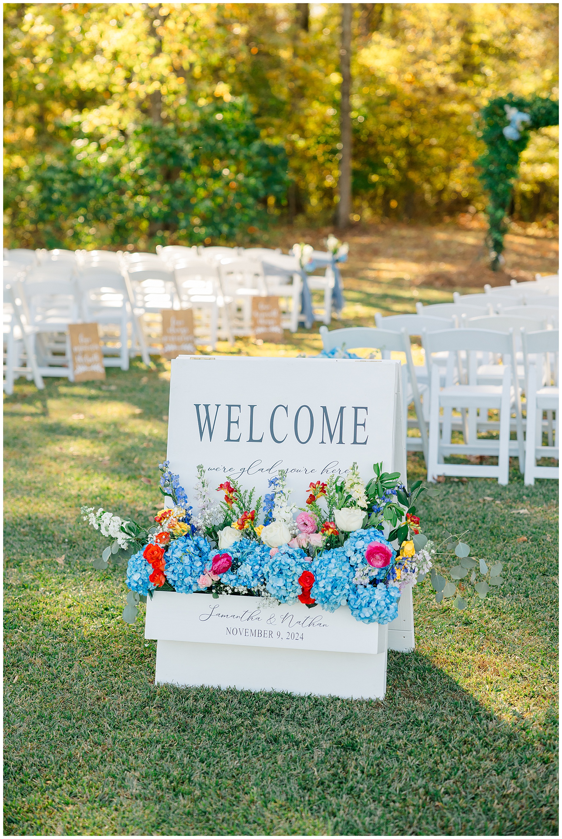 The ceremony space was just magical tucked into a little corner of the property with the sunset shining through the trees. I absolutely LOVED their welcome sign, with all the colorful flowers on it! Wow! Samantha & her dad were brought to the ceremony by horse & carriage, and afterwards, Nathan & Sam left the ceremony for a private carriage ride in it too! It was sooooo beautiful!