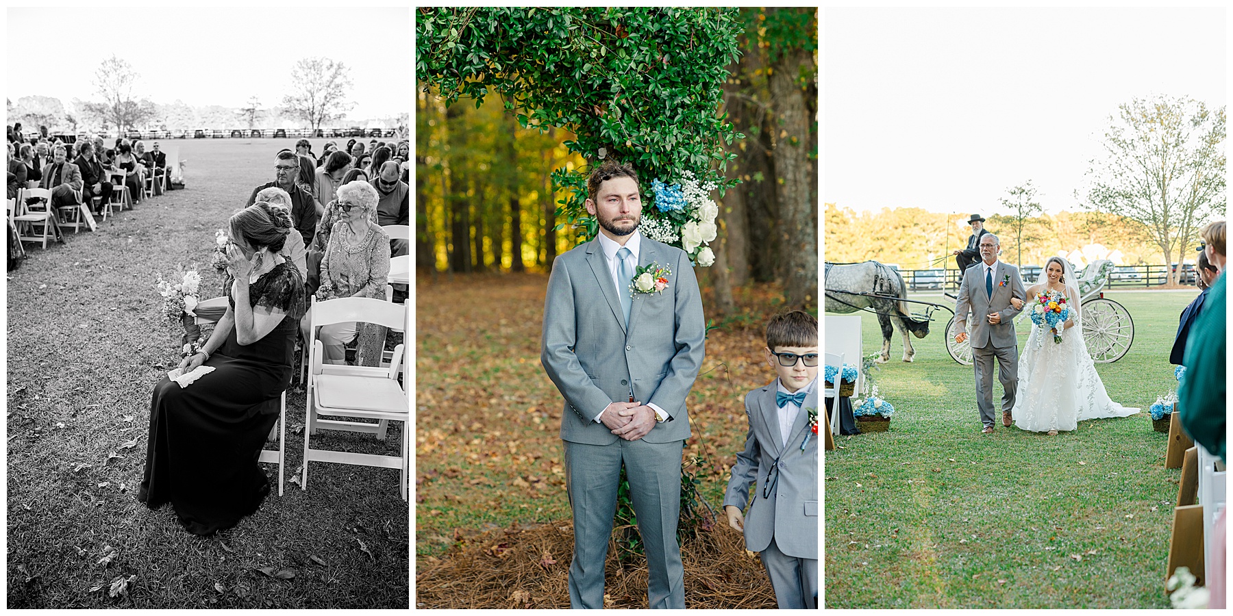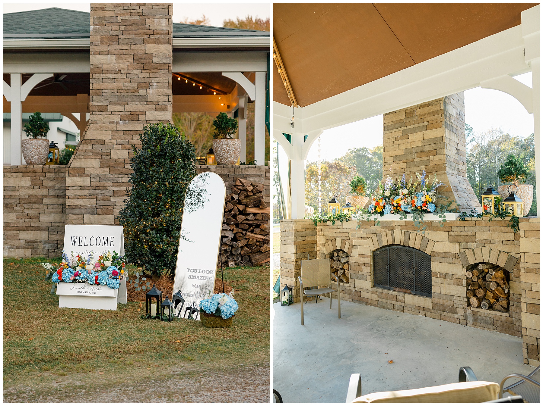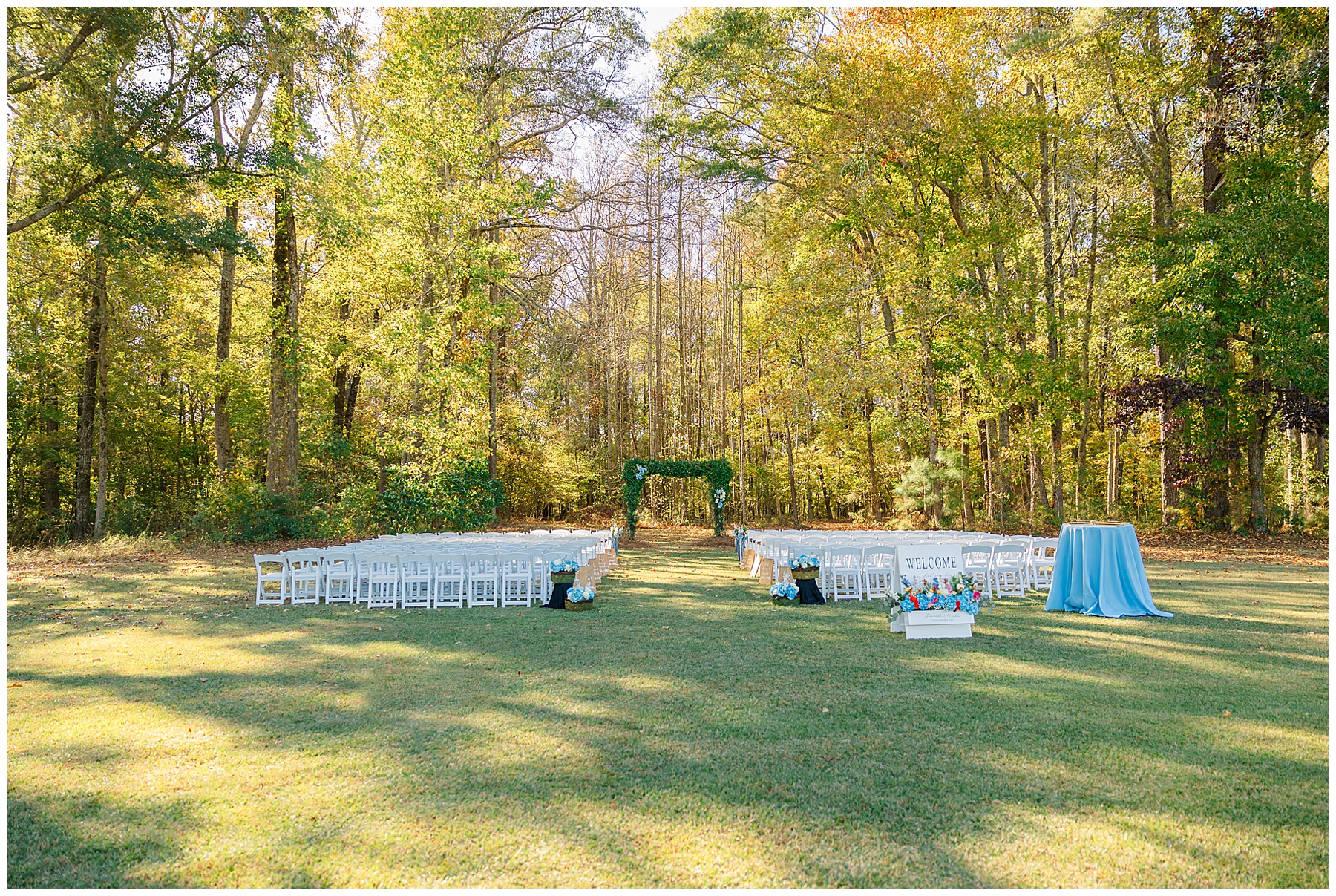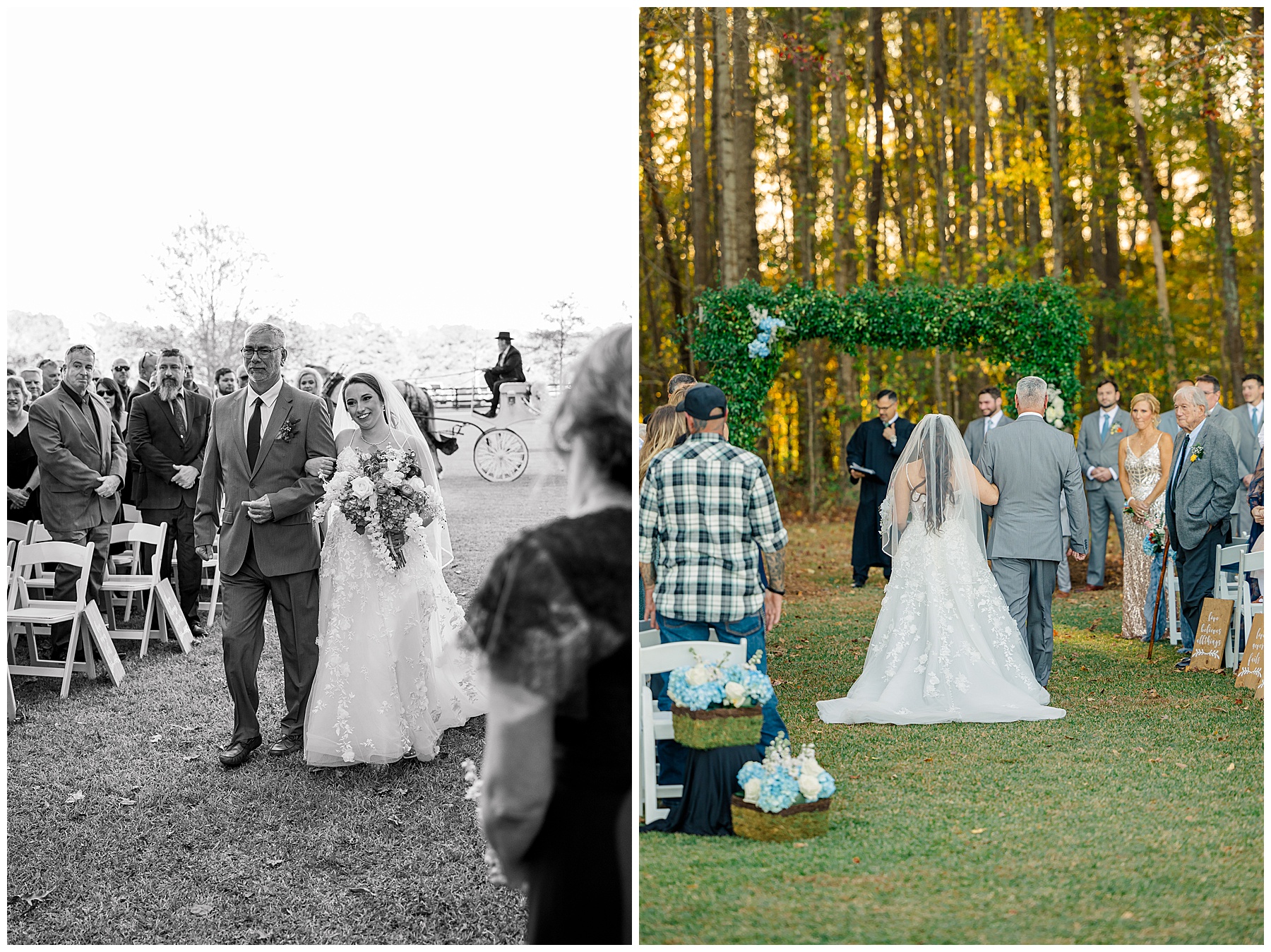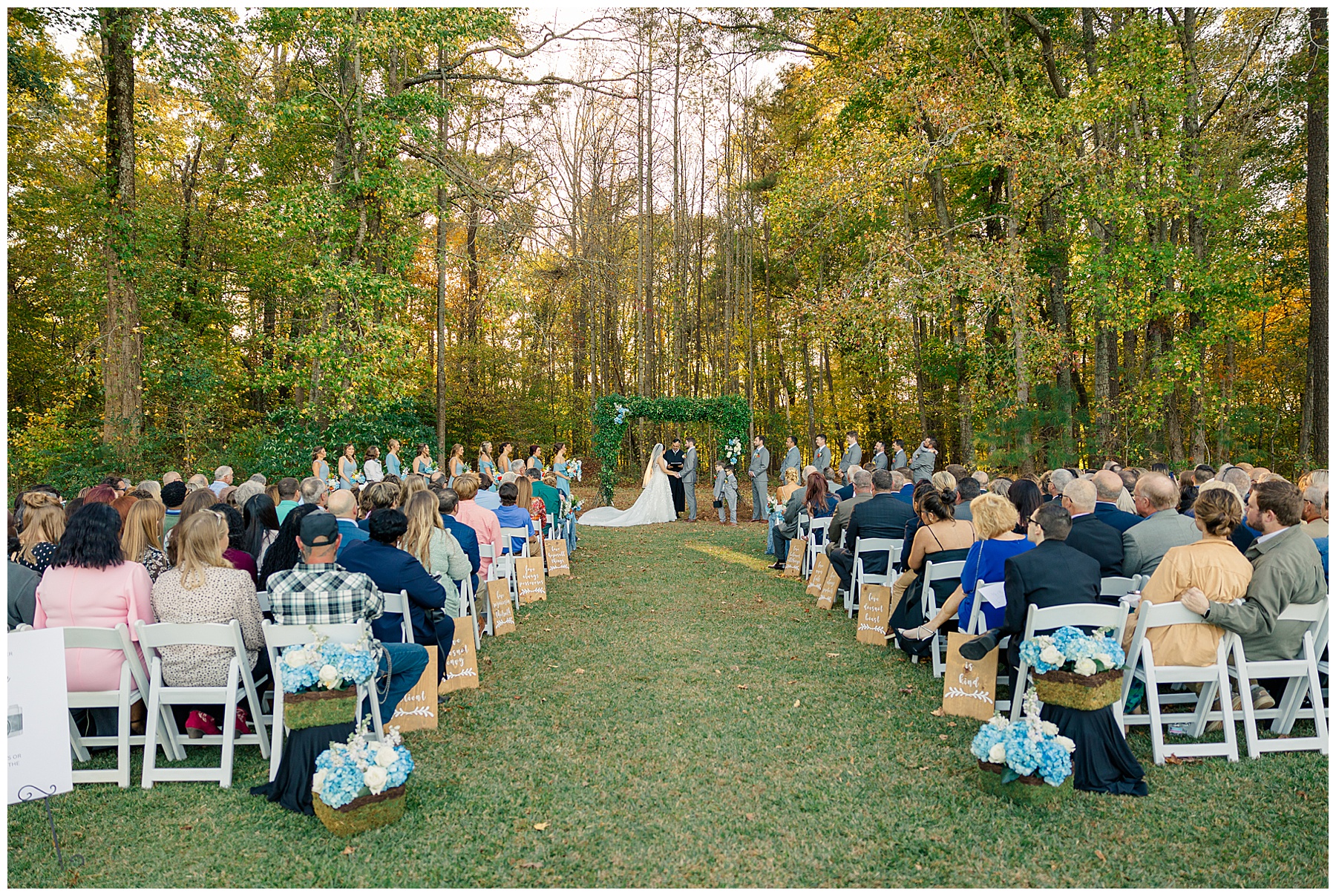 The ceremony space was just magical tucked into a little corner of the property with the sunset shining through the trees. I absolutely LOVED their welcome sign, with all the colorful flowers on it! Wow! Samantha & her dad were brought to the ceremony by horse & carriage, and afterwards, Nathan & Sam left the ceremony for a private carriage ride in it too! It was sooooo beautiful!