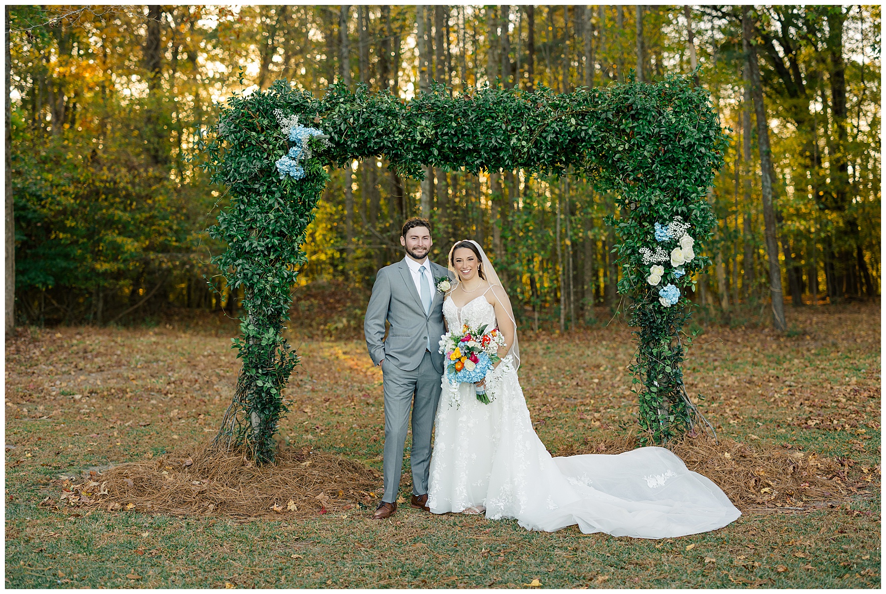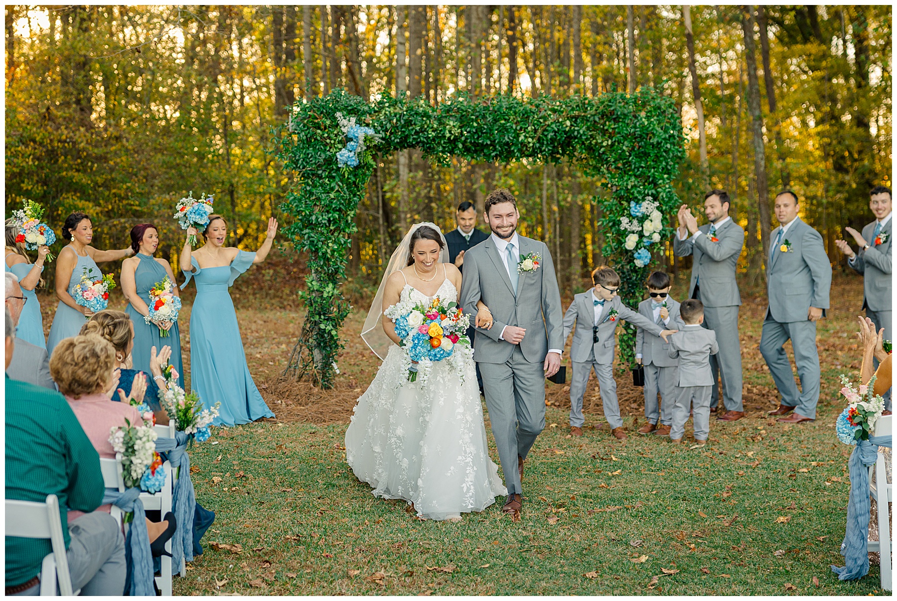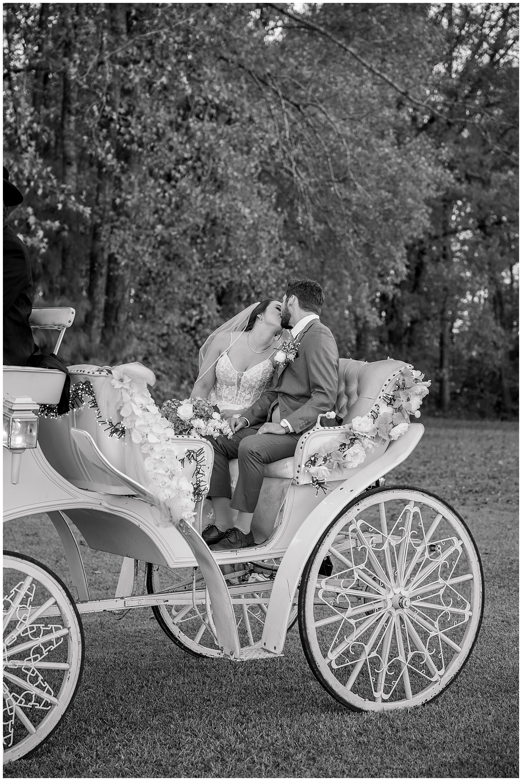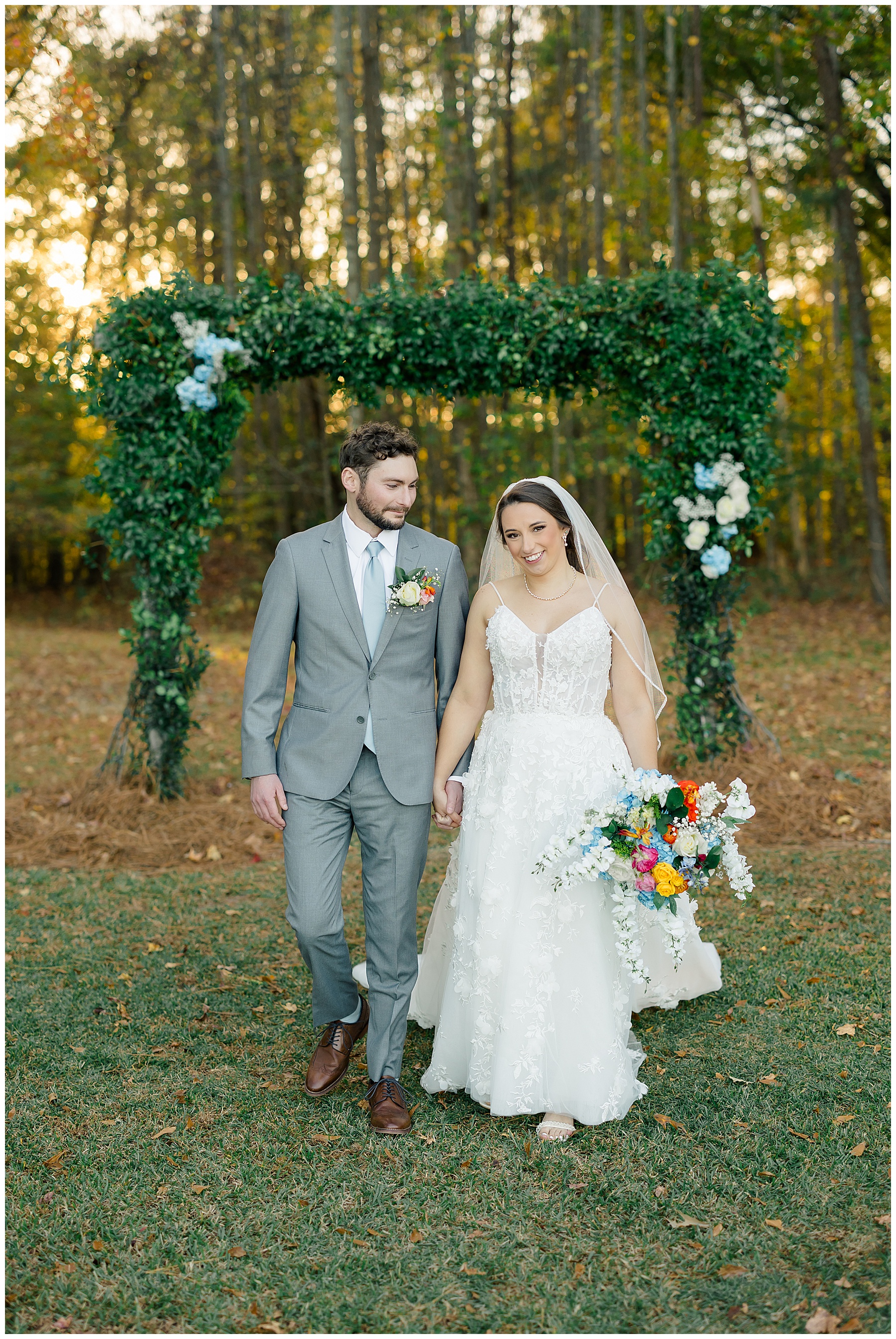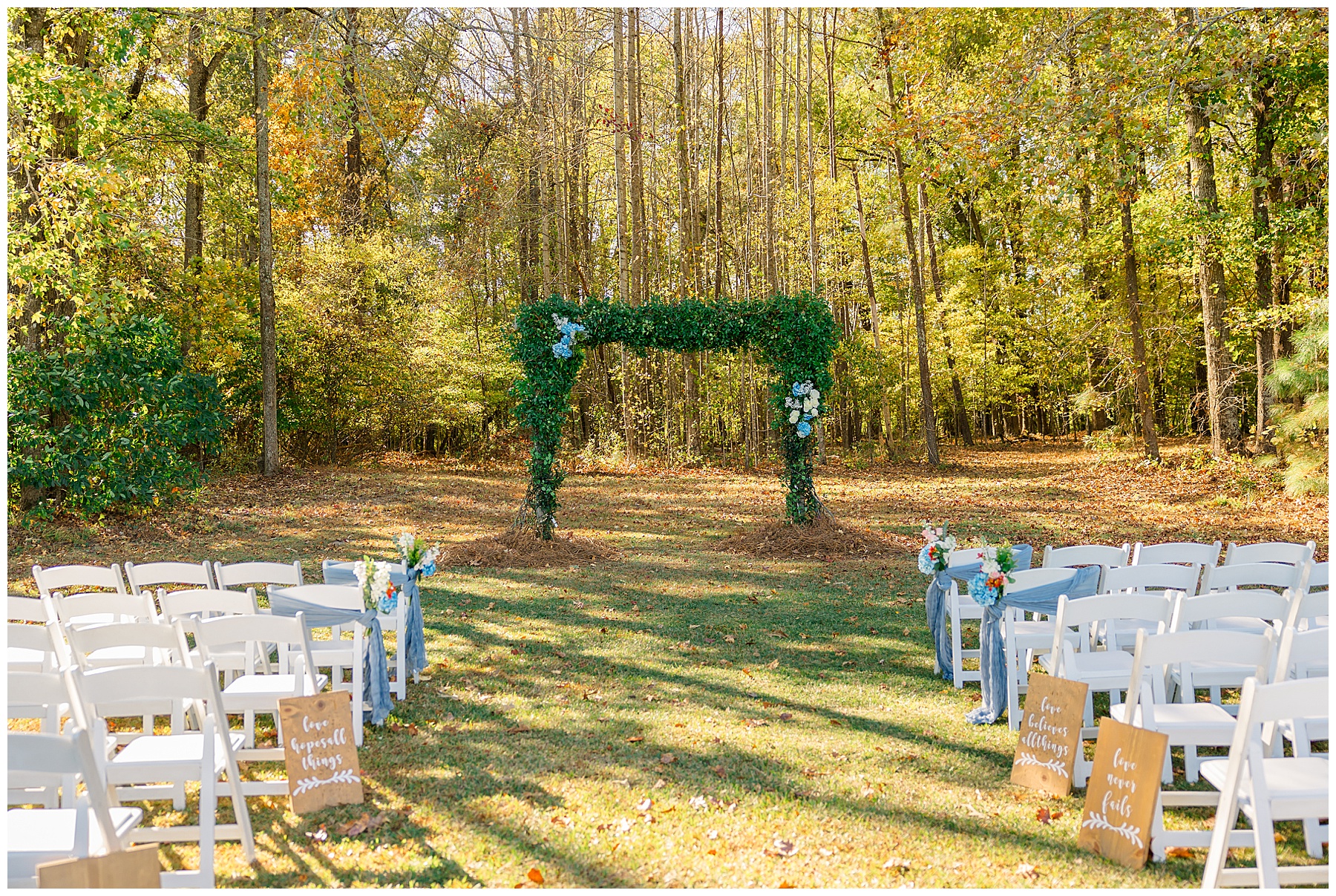 The ceremony space was just magical tucked into a little corner of the property with the sunset shining through the trees. I absolutely LOVED their welcome sign, with all the colorful flowers on it! Wow! Samantha & her dad were brought to the ceremony by horse & carriage, and afterwards, Nathan & Sam left the ceremony for a private carriage ride in it too! It was sooooo beautiful!