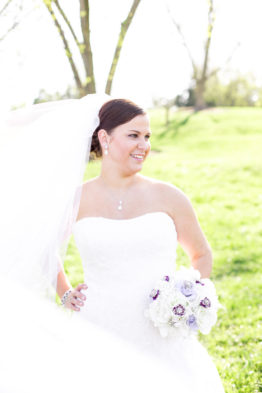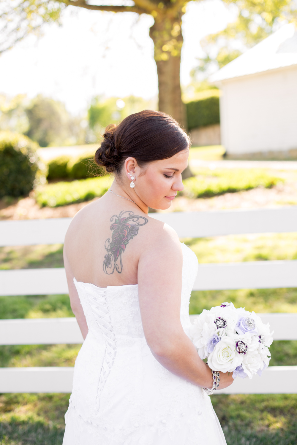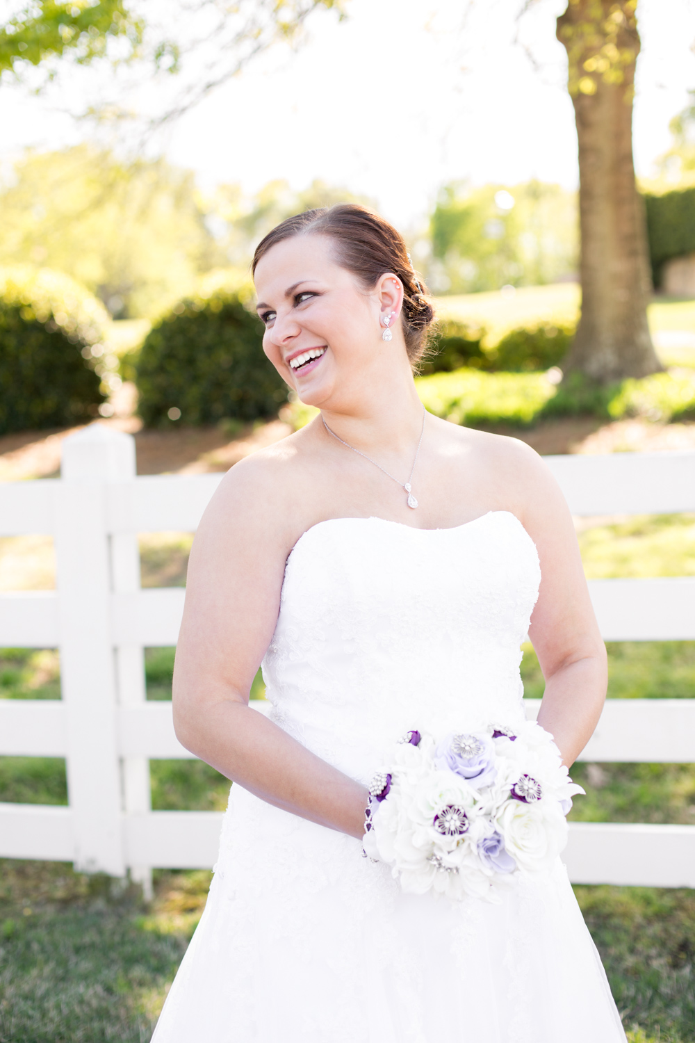 Sarah wore custom Nike tennis shoes, with her new name on the tongues of the shoes. She was a great soccer player growing up, so the athletic shoe under her wedding gown fit her personality perfectly, and plus she LOVES purple!