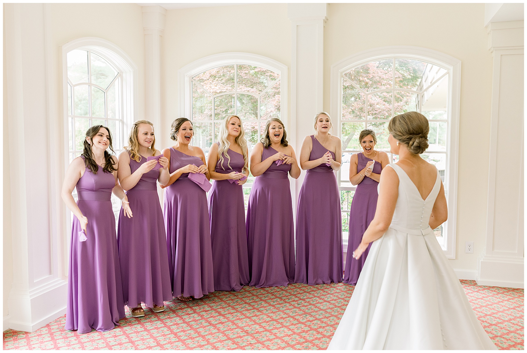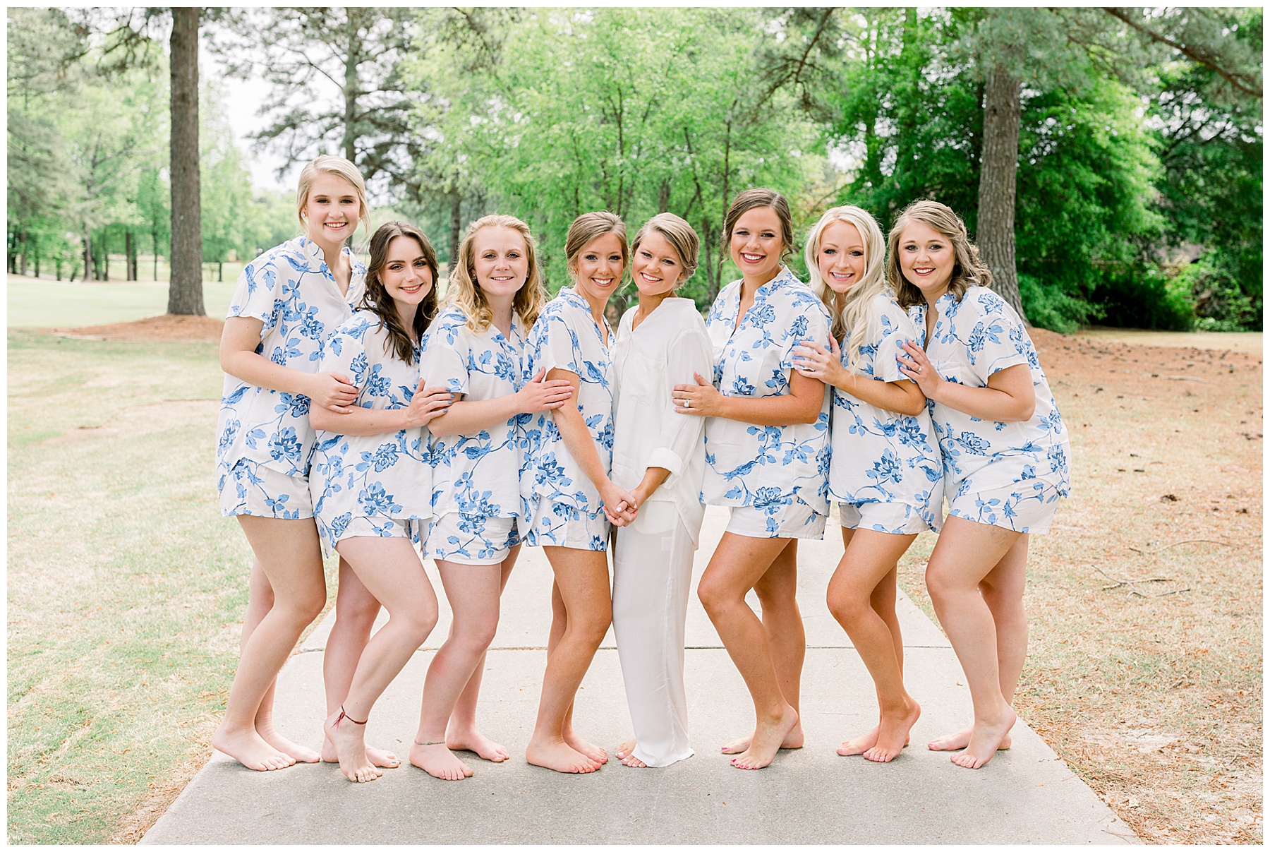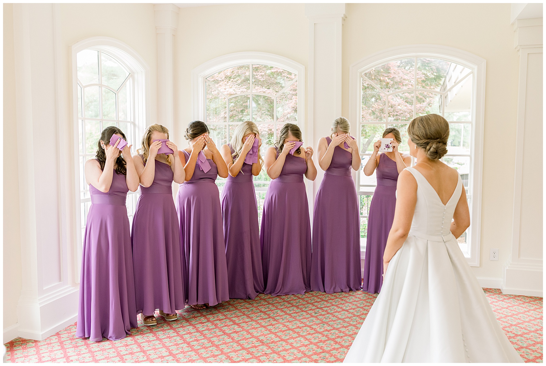 We started off the day with the girls who were all ready EARLY (yayyy for that!) and they enjoyed snacks, hanging out, and lounging in their cute pjs! Shannon opened a sweet gift from Daniel – a custom watercolor portrait. After getting dressed with 3 generations of ladies in her family PLUS including her new mother-in-law (so precious!) Shannon had a First Look with her bridesmaids and with her daddy. What a sweet morning!