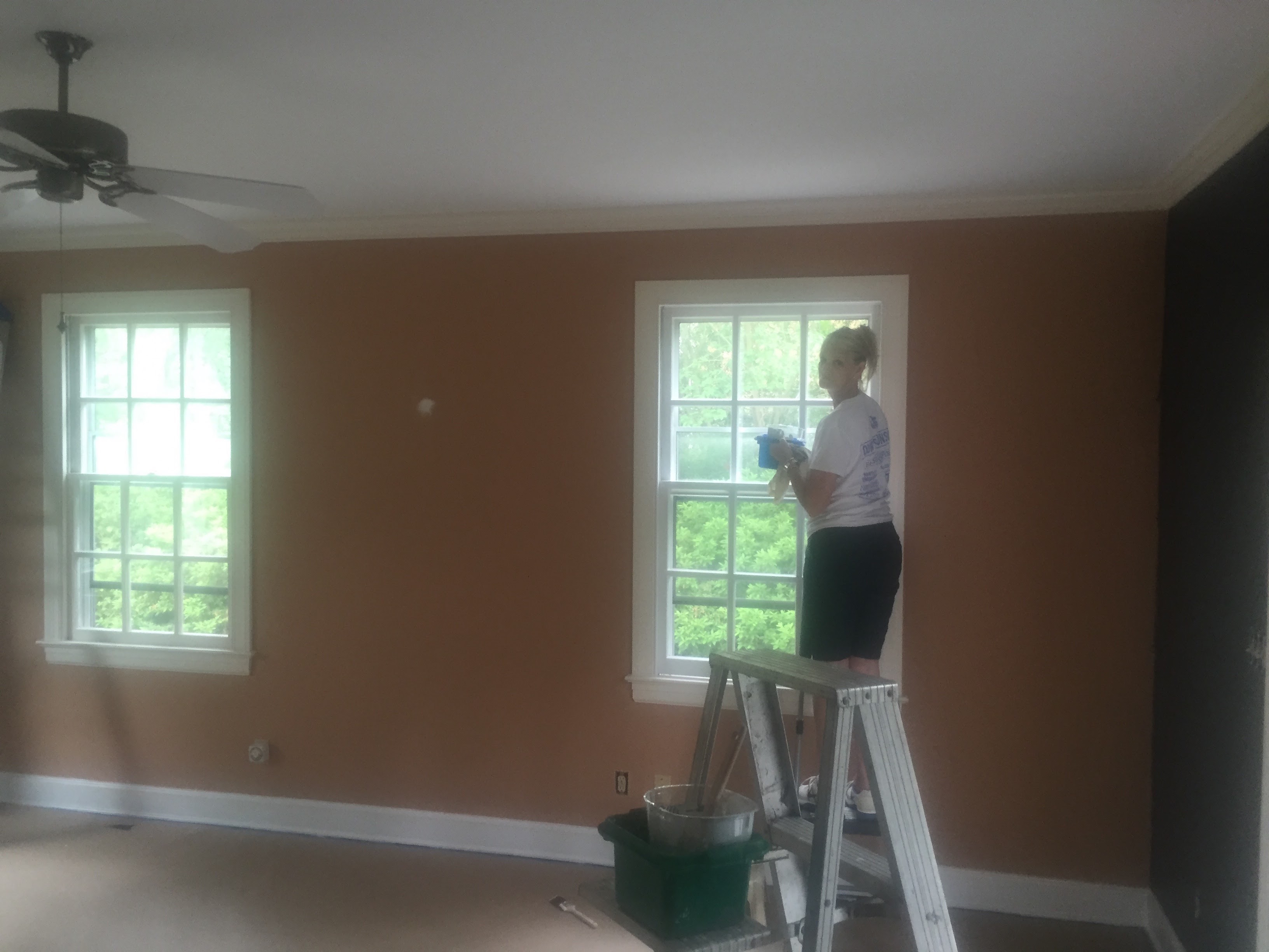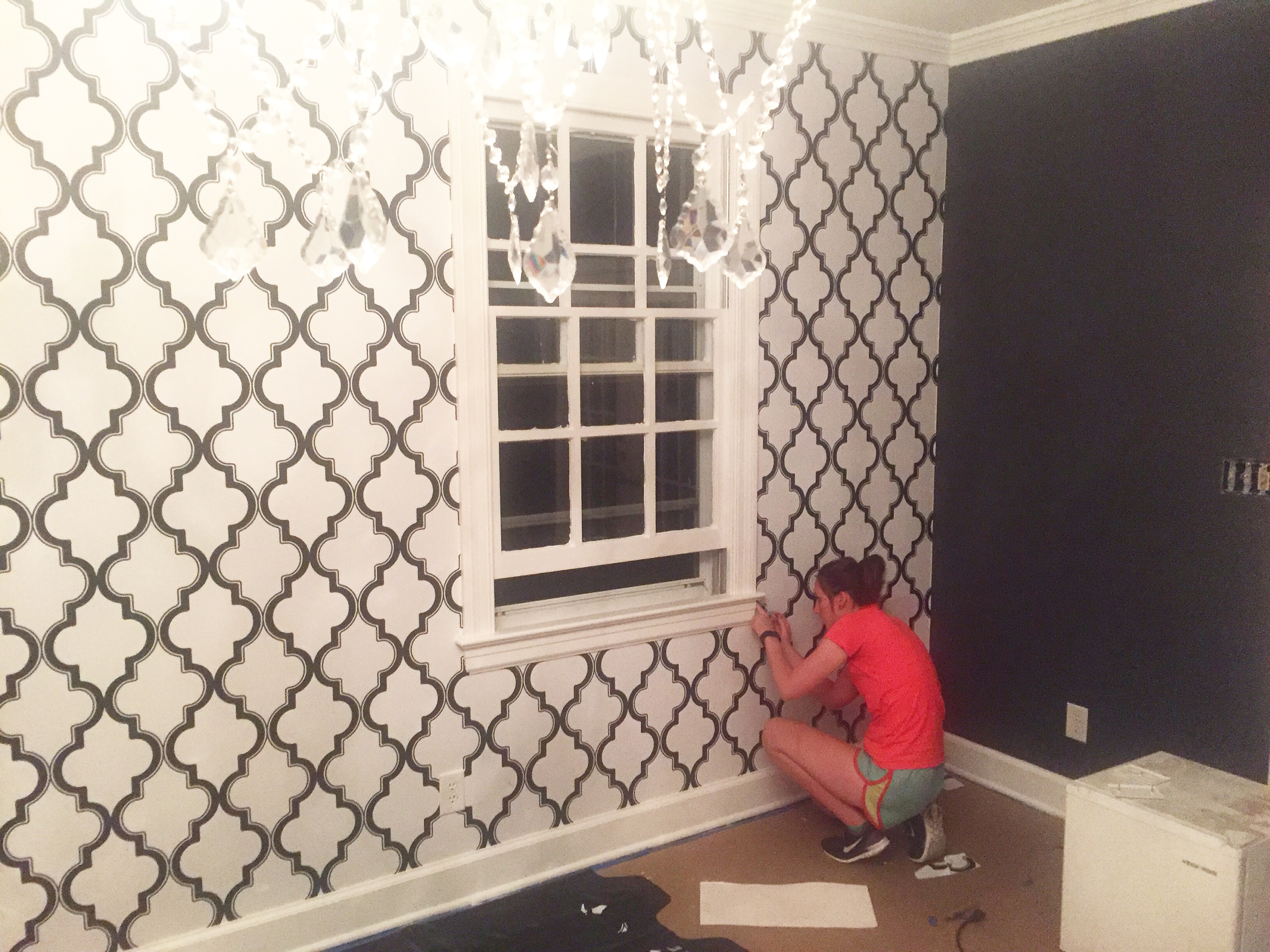 It started as an ORANGE ROOM with a ceiling fan. I found some Peel-n-Stick wallpaper (which sounds WAY easier than it really was) for a feature wall, and through lots of tears, frustration, xacto cuts, and help from my mom+dad, it got installed!!!