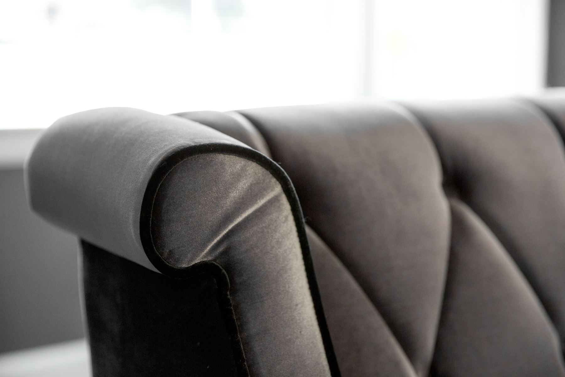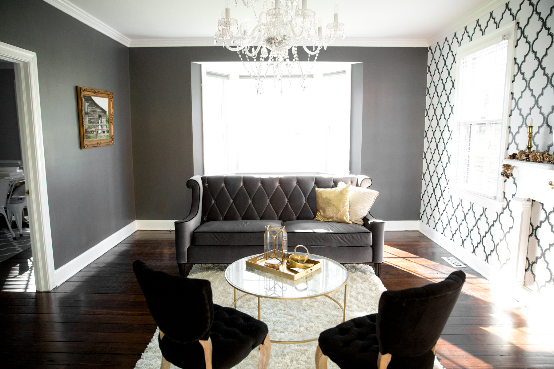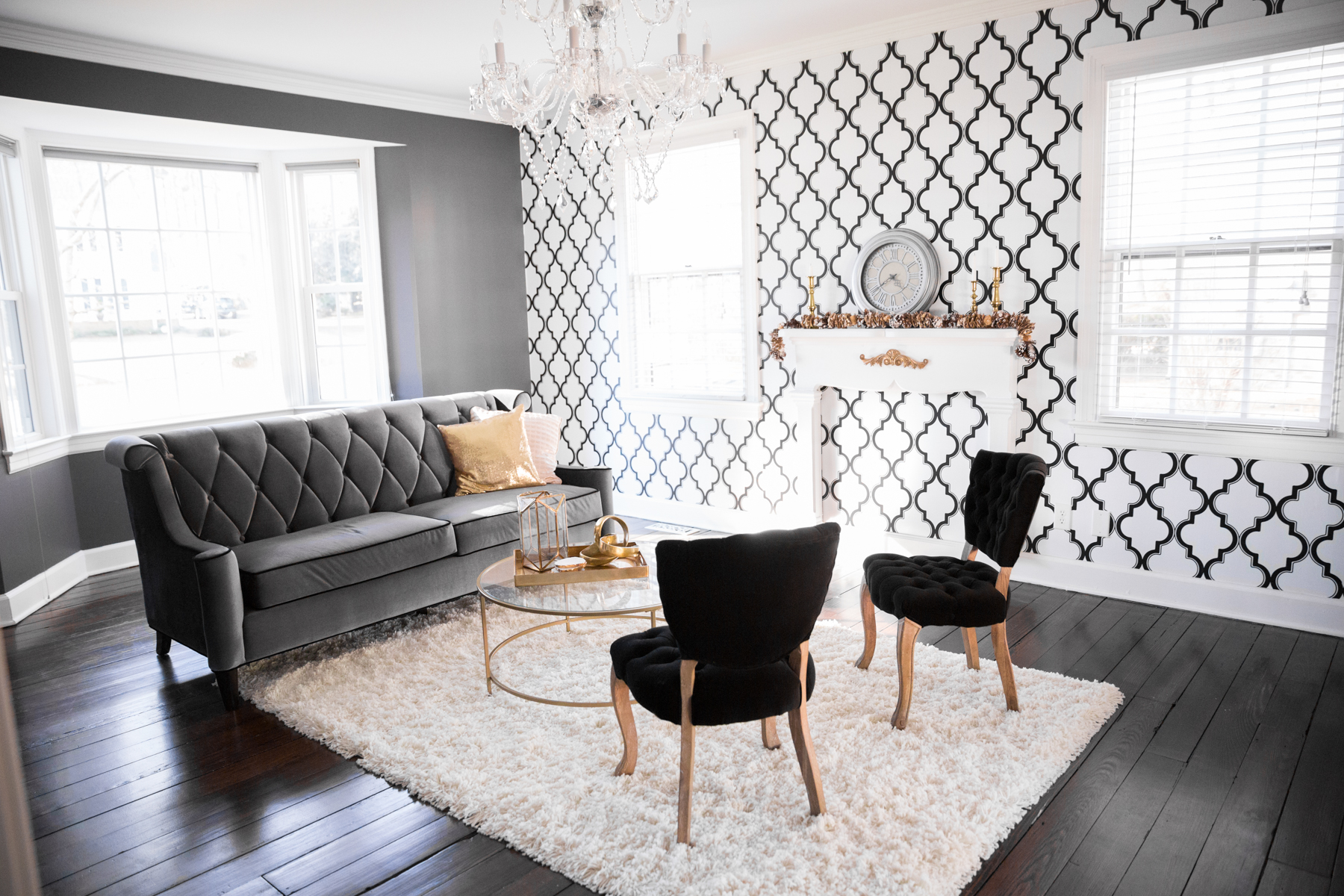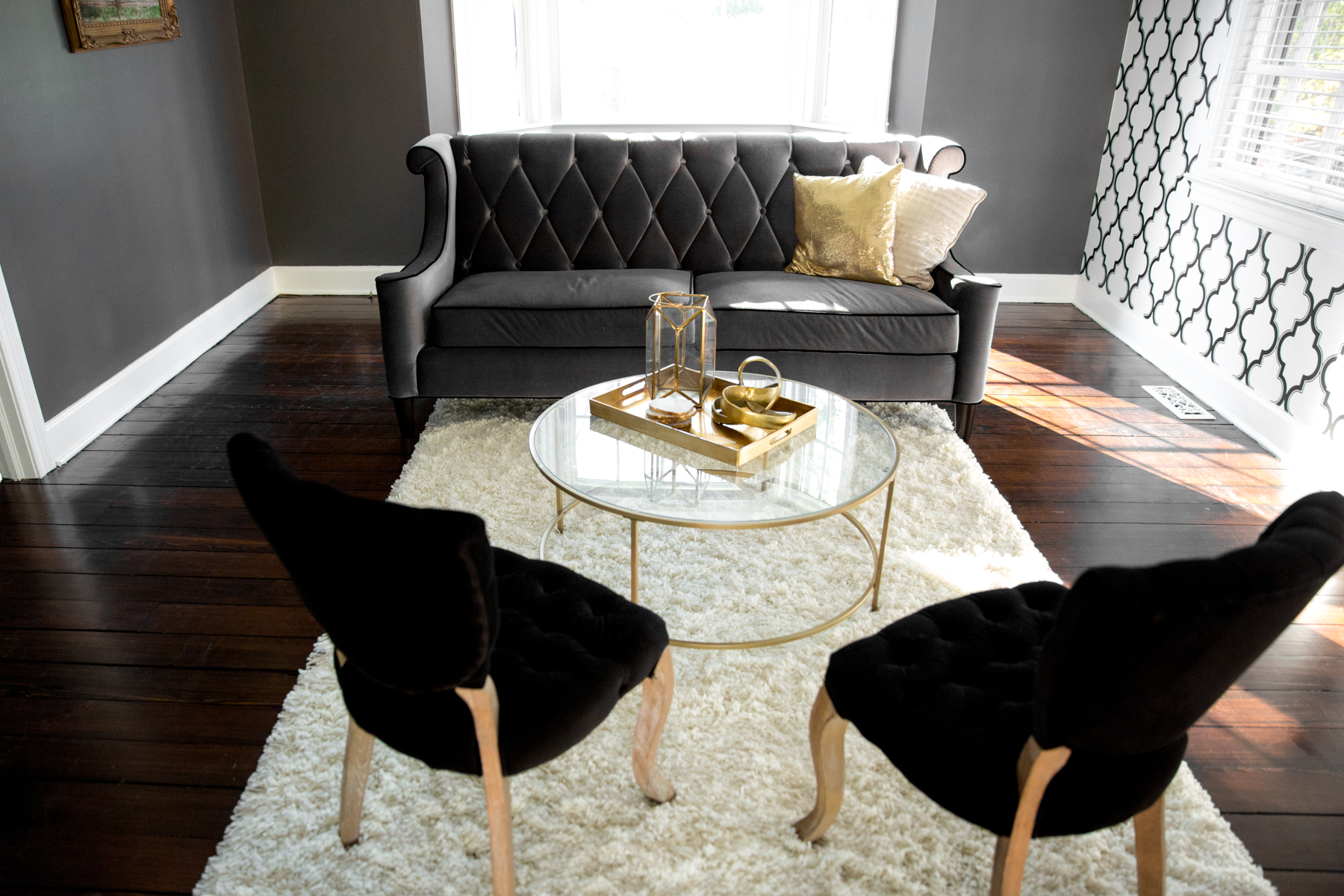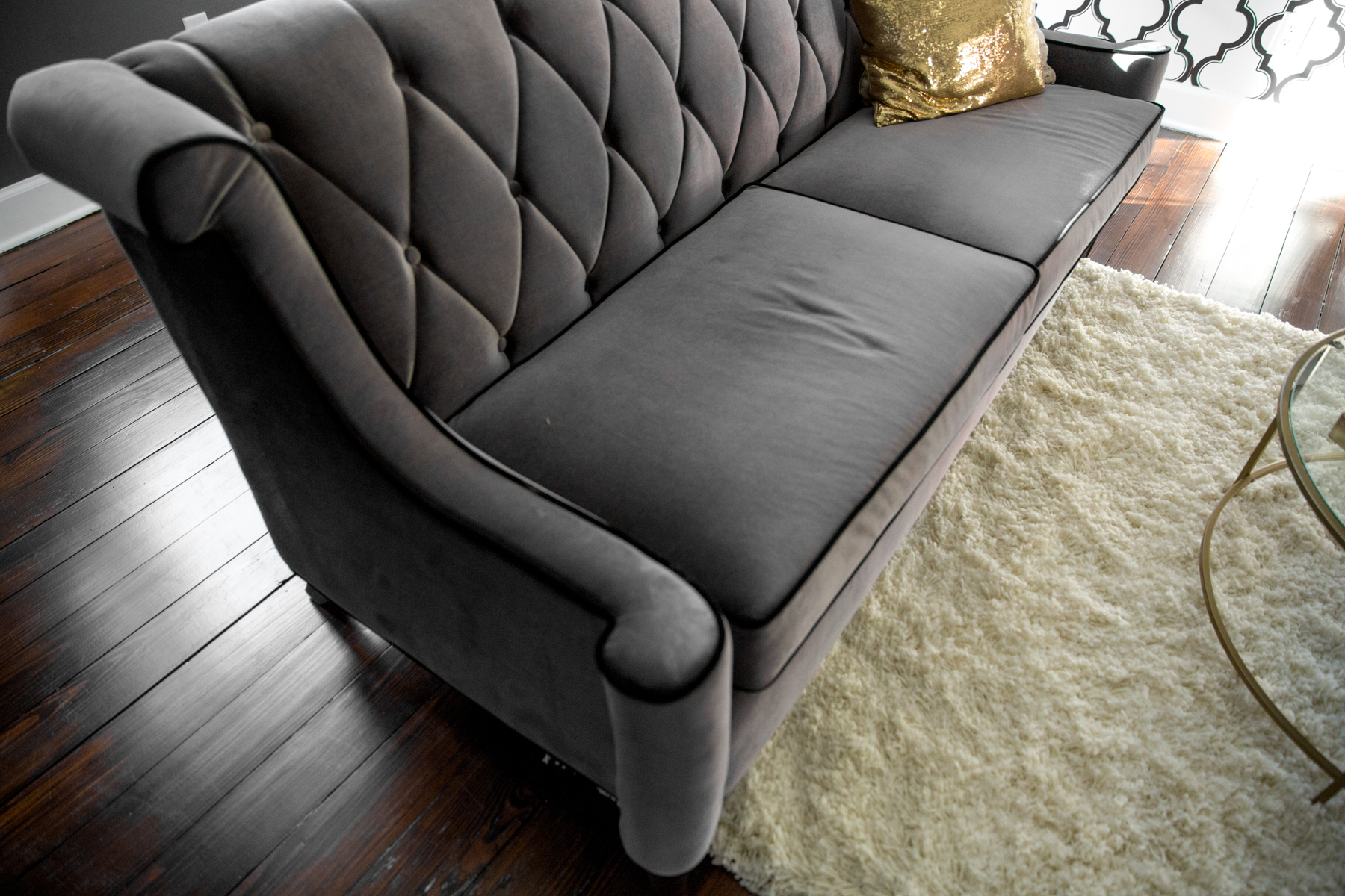 I had dreams of wanting VELVET furniture (Phillip thought I was crazy at first) and found the prettiest gray velvet couch and vintage-style black velvet chairs online!!!