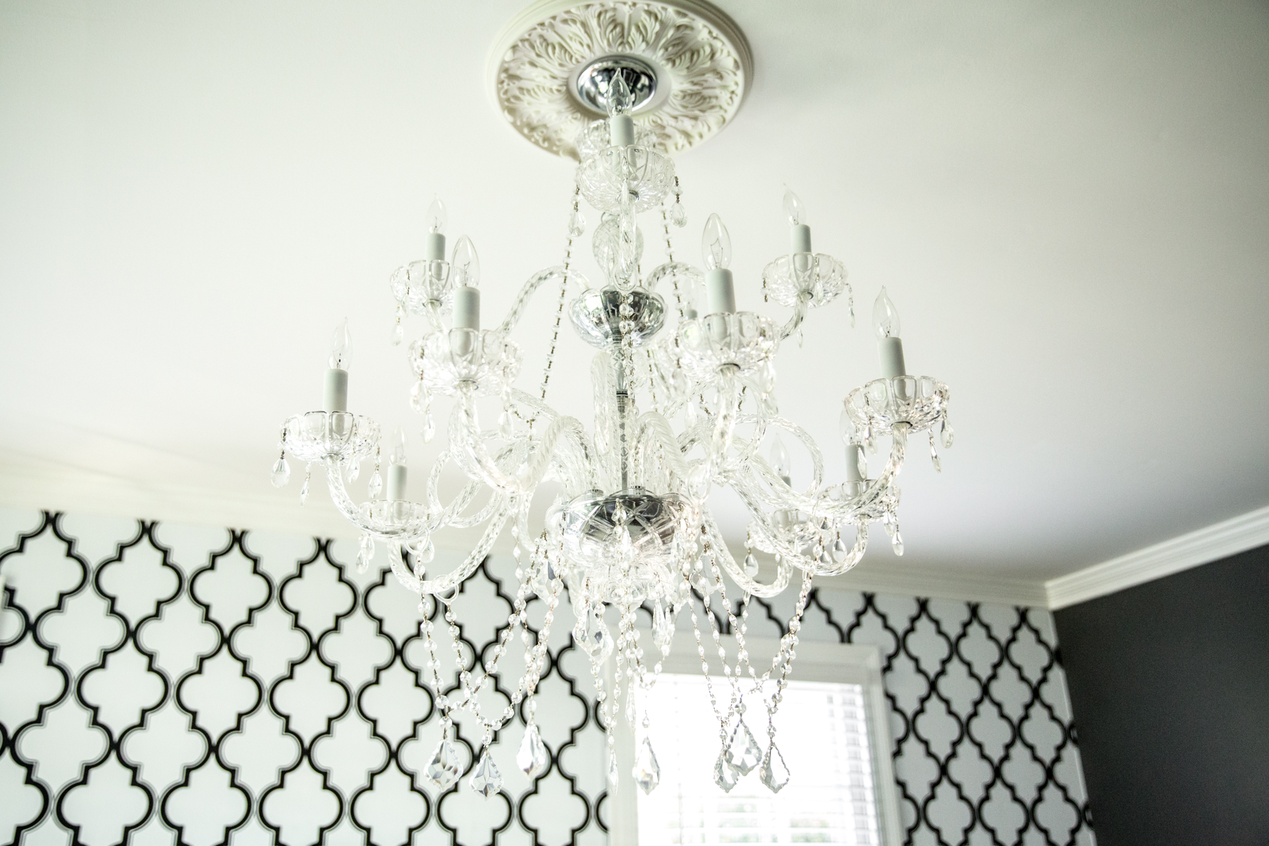 My FAVORITE part of the whole room is the HUGE chandelier. It looks like I took it straight from a hotel in Charleston. With the “finding skills” of my mother-in-law, we found the PERFECT chandelier on CRAIGSLIST and I researched to find an antique-looking ceiling medallion online. Phillip & my father-in-law hung it for me, and put every single crystal on by hand!!!!