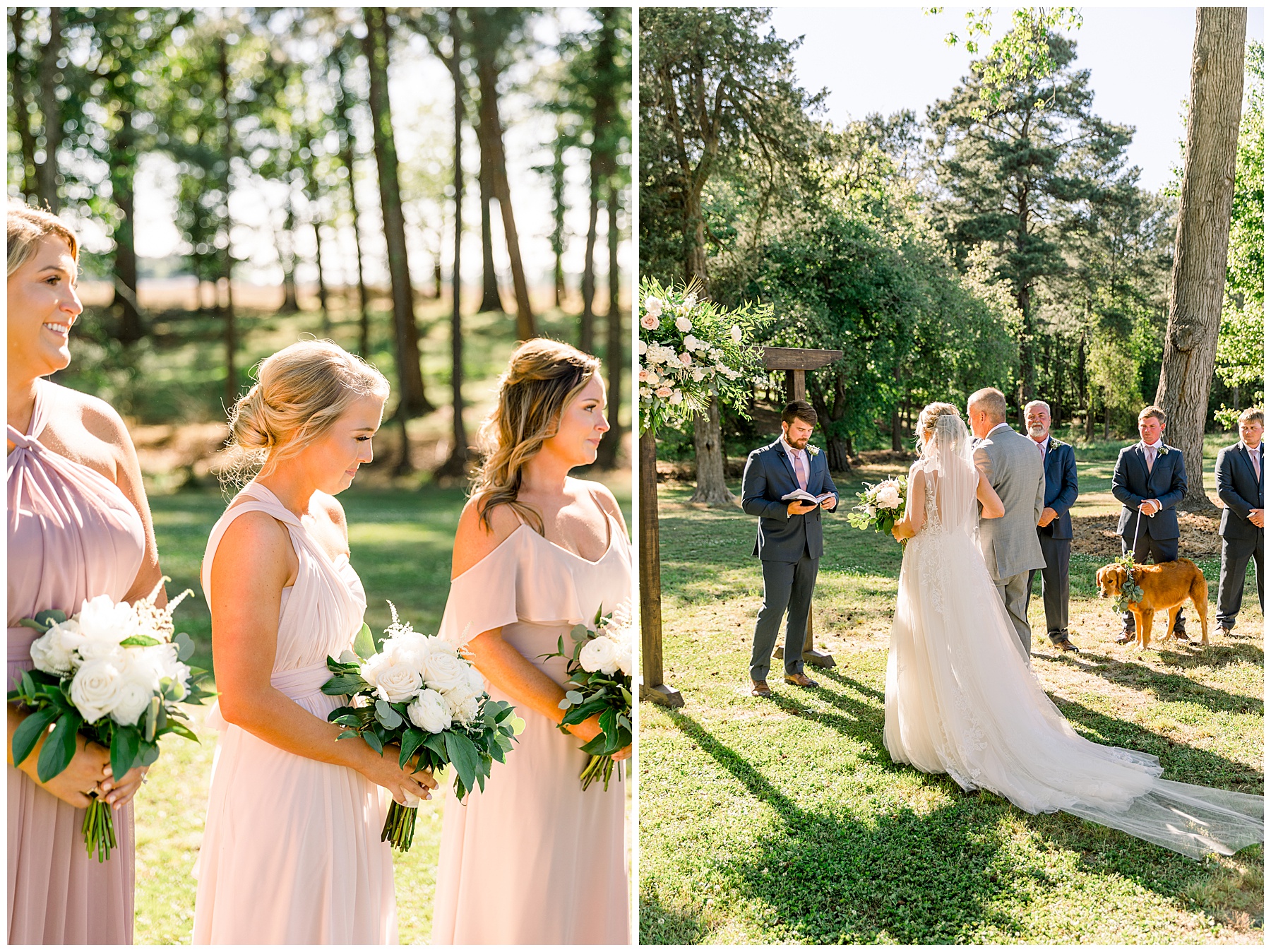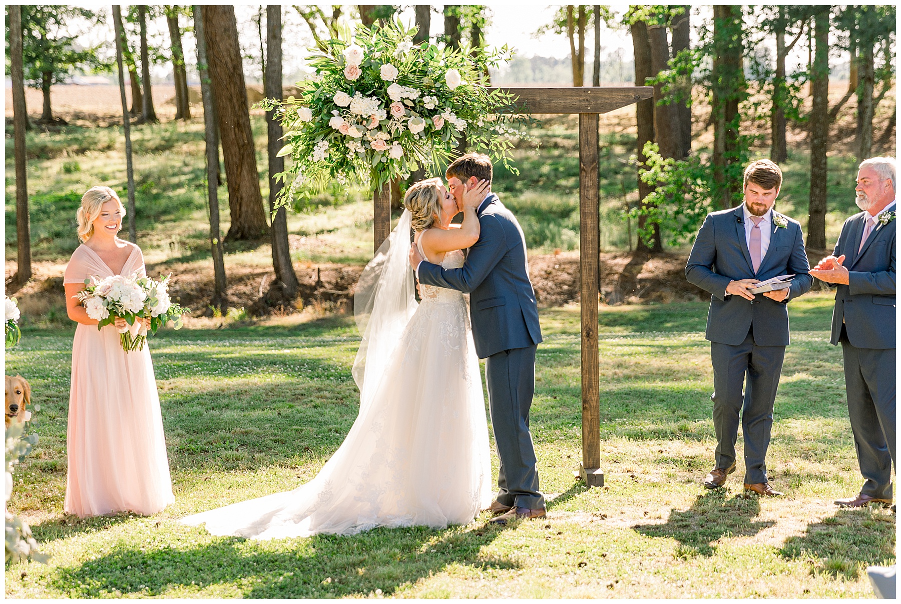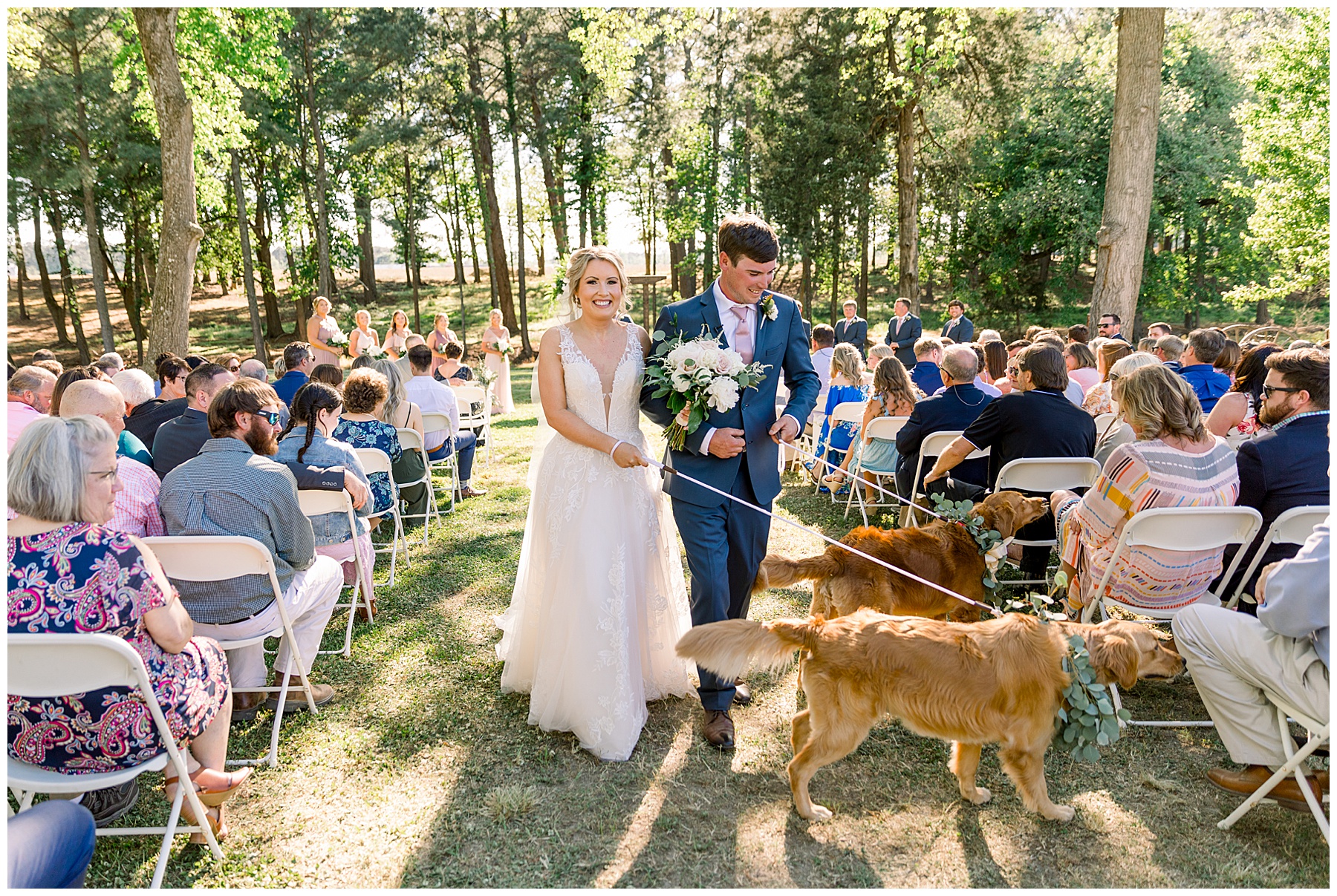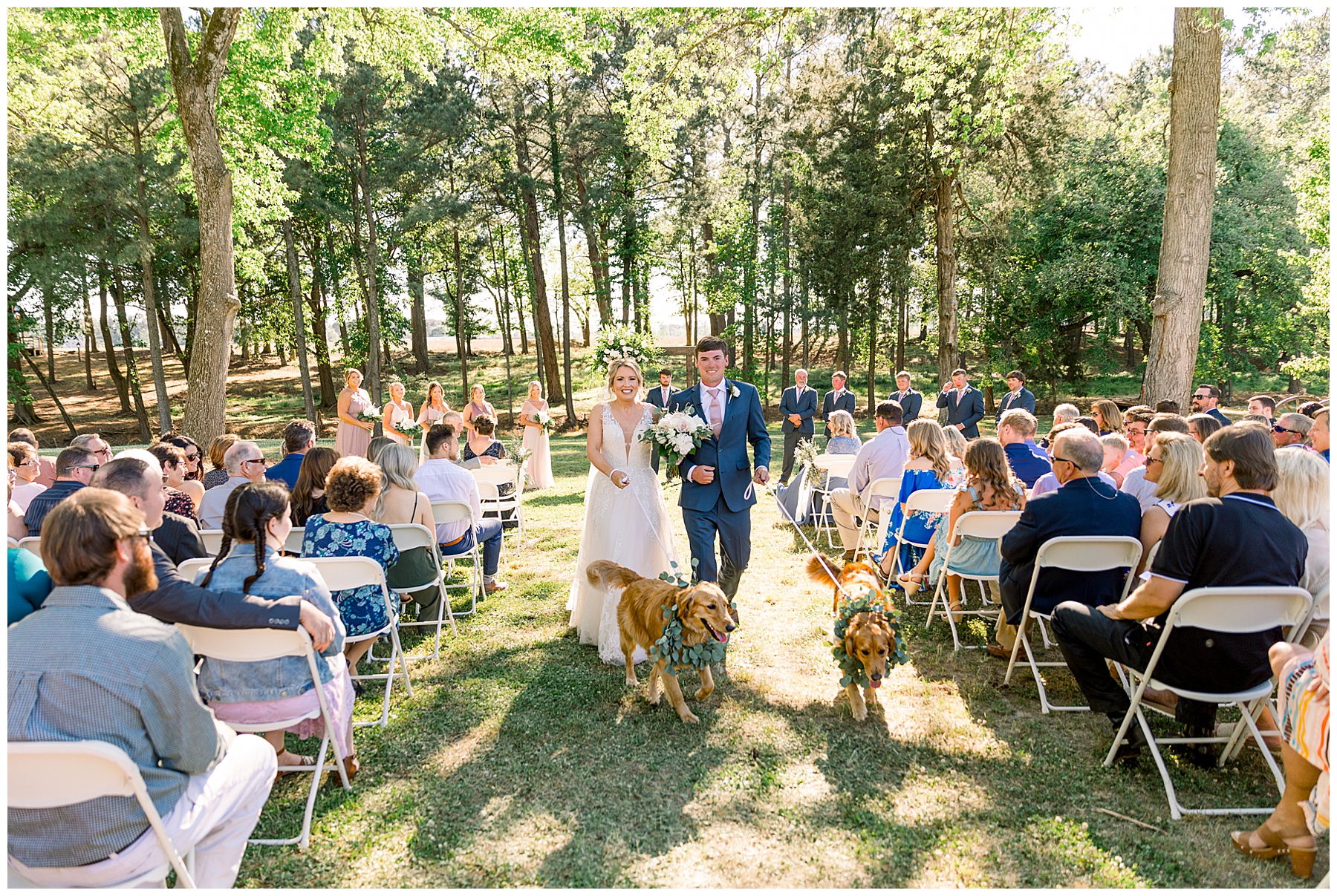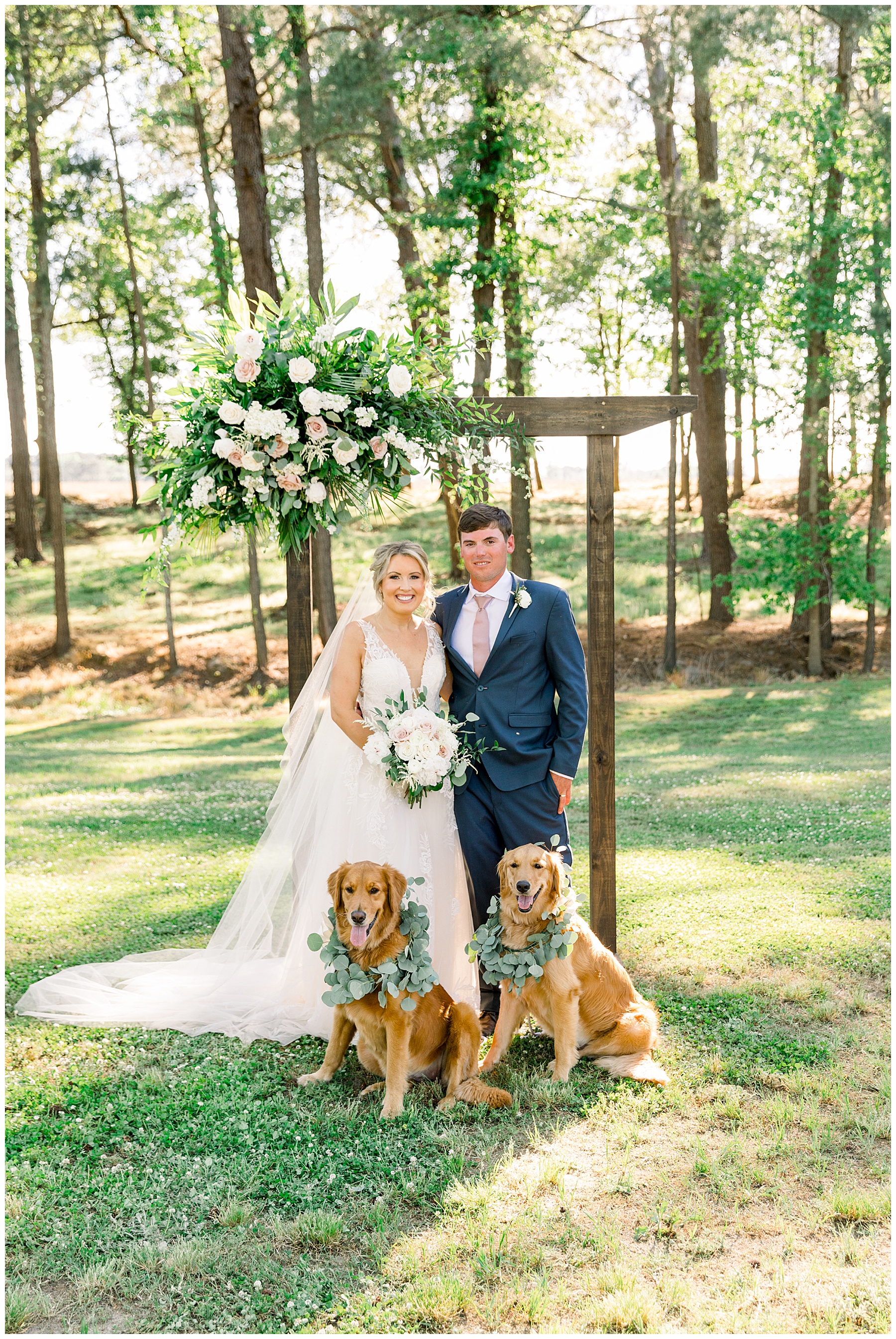 The ceremony was beautiful underneath the trees. Whitney’s dad built a beautiful arbor for them, and it had a gorgeous floral arrangement! Bobby’s cousin officiated the ceremony, and even the pups were included!